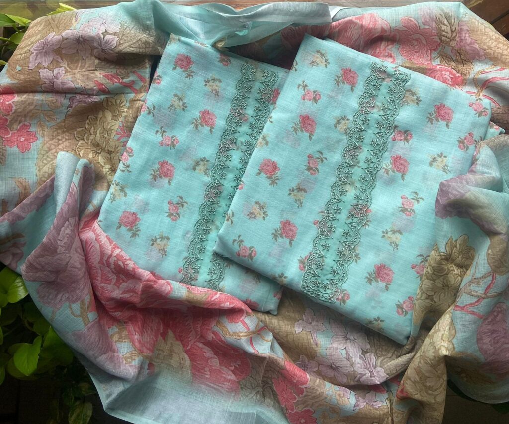 Are you looking out for Beautiful Floral Suits to add to your wardrobe ? These Floral Linen Cotton Suits are the perfect choice!Linen cotton top with floral prints & French lace detailing , santoon bottom & linen cotton Duppatta with floral prints & silver Zari borders
