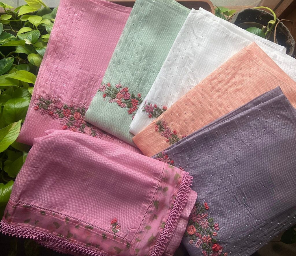 Are you looking out for Beautiful Kota suits to add to your wardrobe ? These Handworked Kota Suits are the perfect choice! Kota silk top with hand embroidery, organza floral printed border on sleeve ends & cotton bottom ends & Kota silk Duppatta with floral borders & hand embroidery