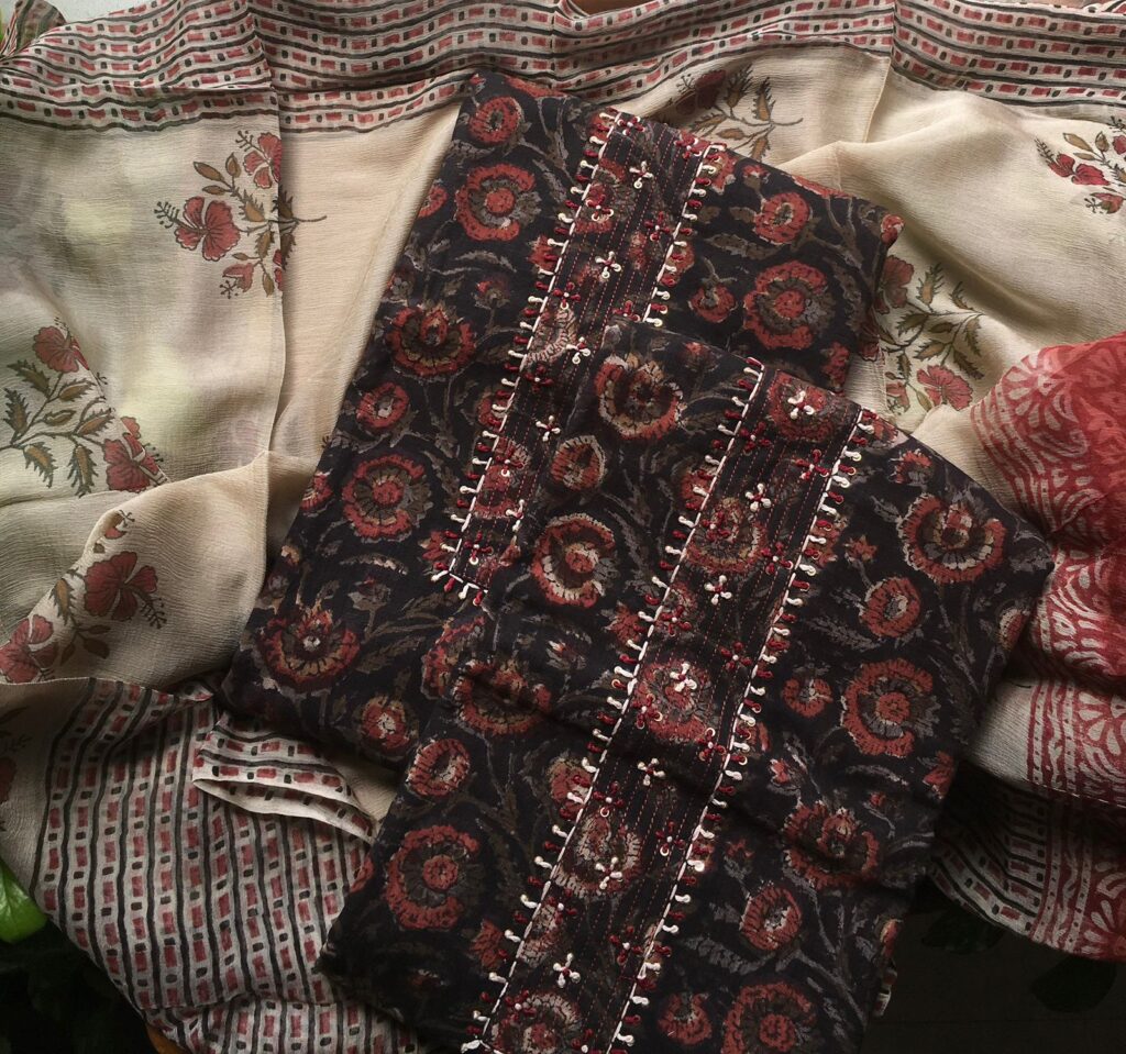 Are you looking out for Beautiful & Unique Designer Cottons to add to your wardrobe ? These Hand block printed Kutch worked cottons are the perfect choice! Pure cotton top with authentic Kutch work (does not need lining ) cotton printed bottom & hand block printed chiffon duppattas