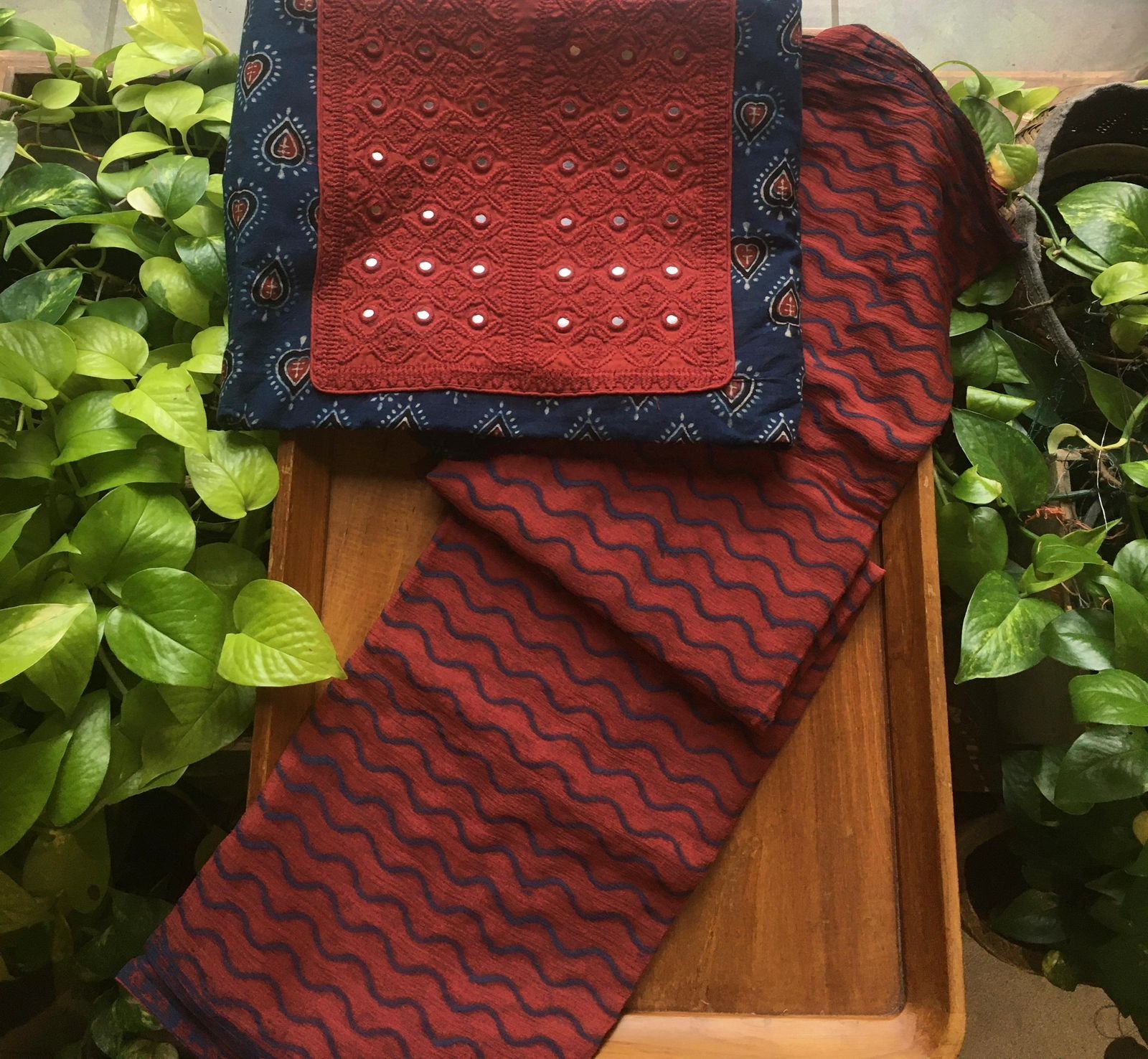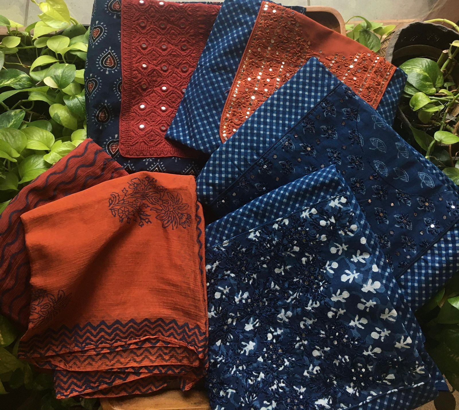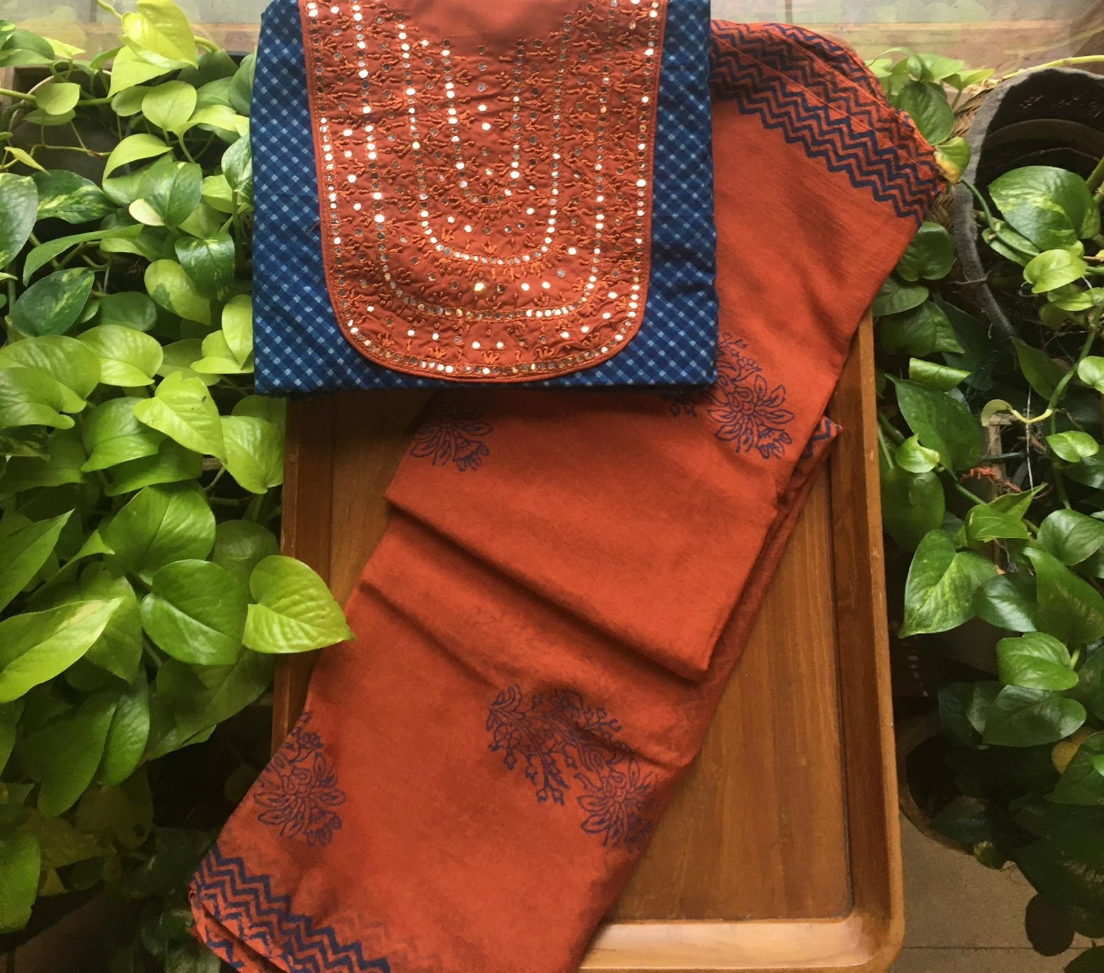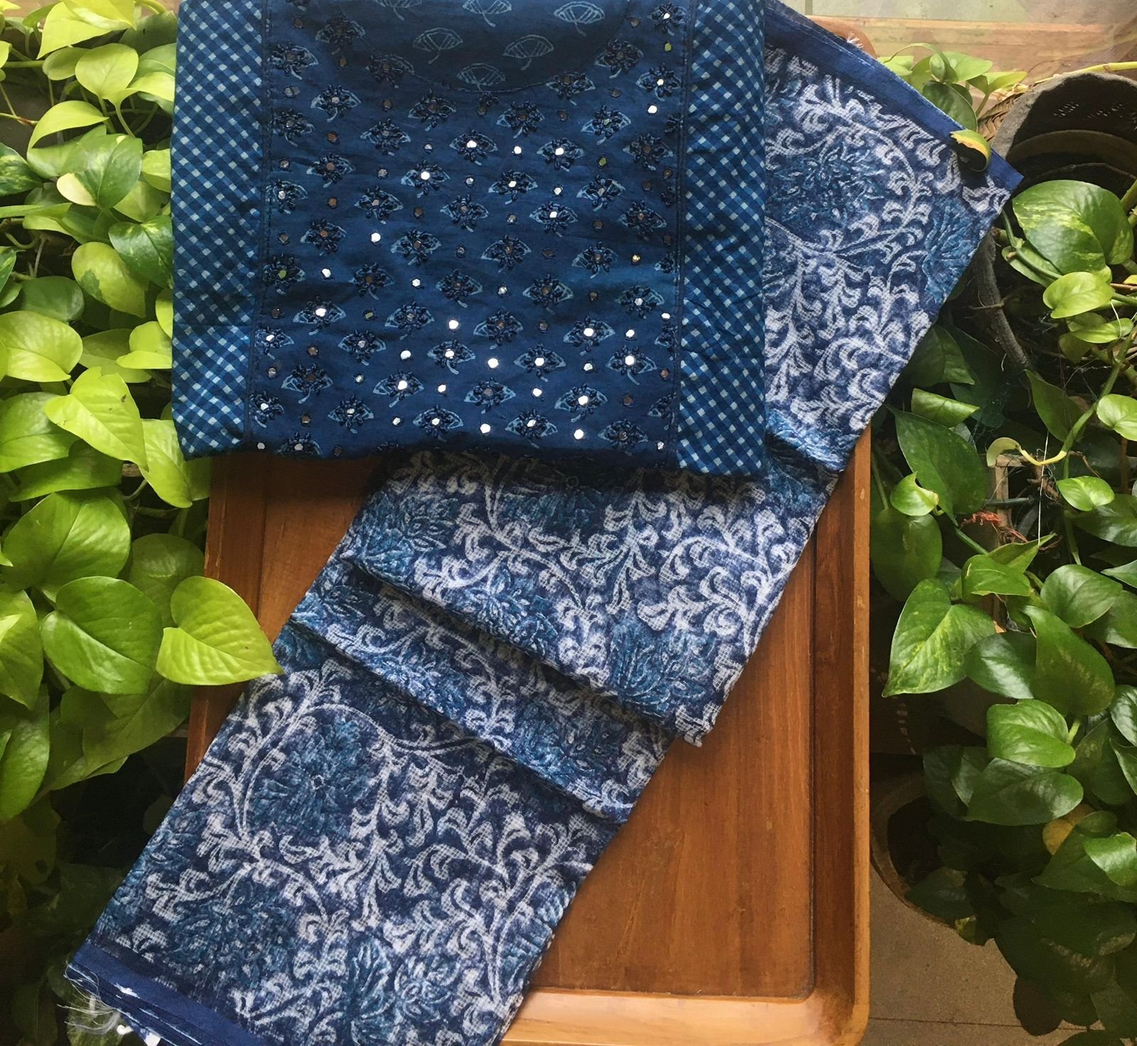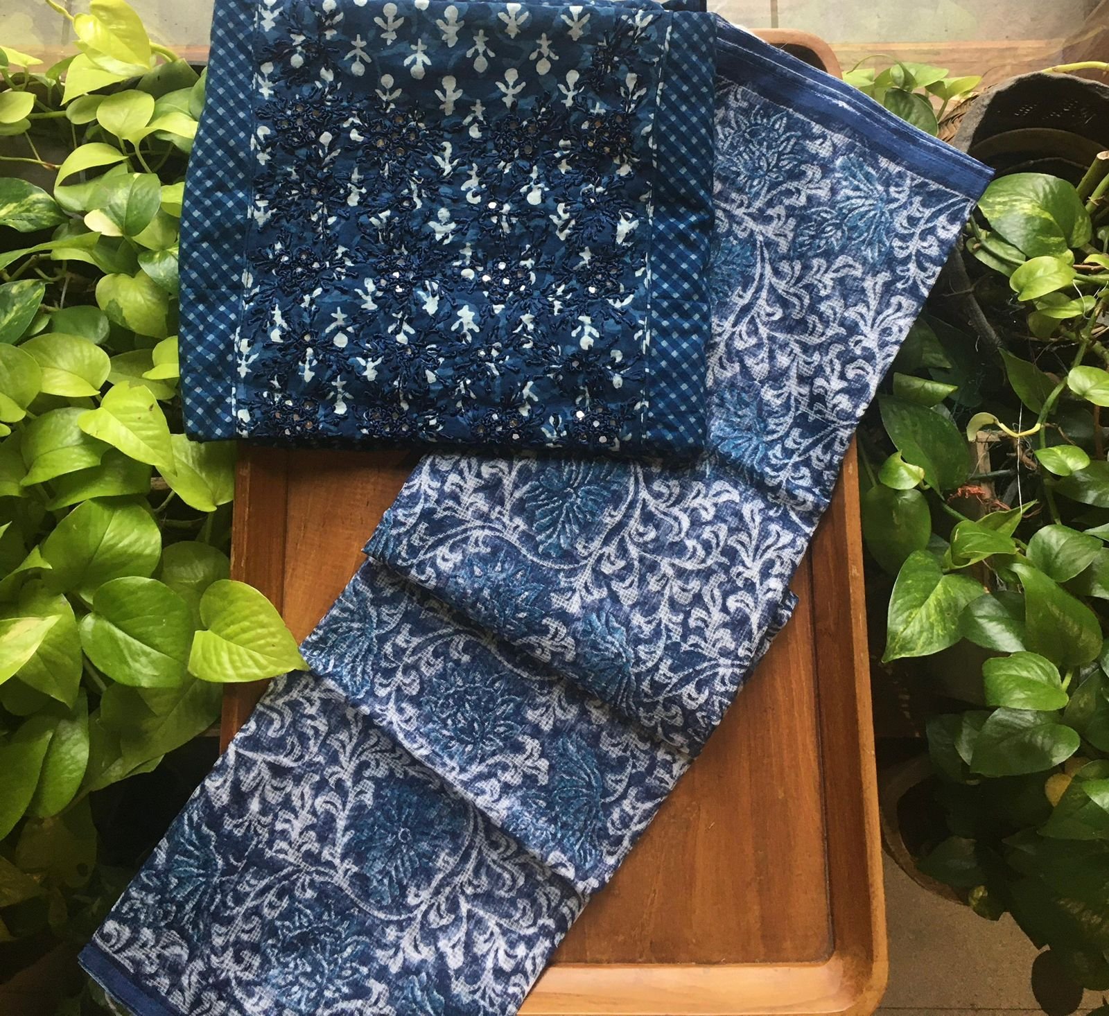 Are you looking out for Stunning Indigos to add to your wardrobe ? These beautiful indigos with hand embroidery is the perfect choice! Pure indigo cotton top with hand embroidery , cotton bottom & chiffon/kota silk Duppatta
