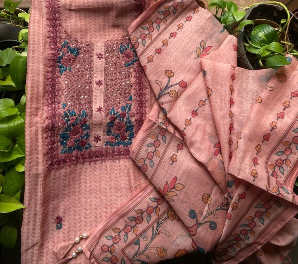 Presenting out Brand New Collection for Onam at a Special Price of ₹1499/- curated on Chiffon woth Cutwork and beautiful floral embroidery! Ethereal hues of Pink, Pearl Green, Ivory gold, Dusty pink & Jet black on Chiffon top and Duppatta with floral embroidery & Cutwork. The floral embroidery design is created to resemble pearl embroidery. Bottom is cotton silk