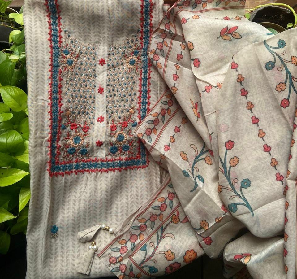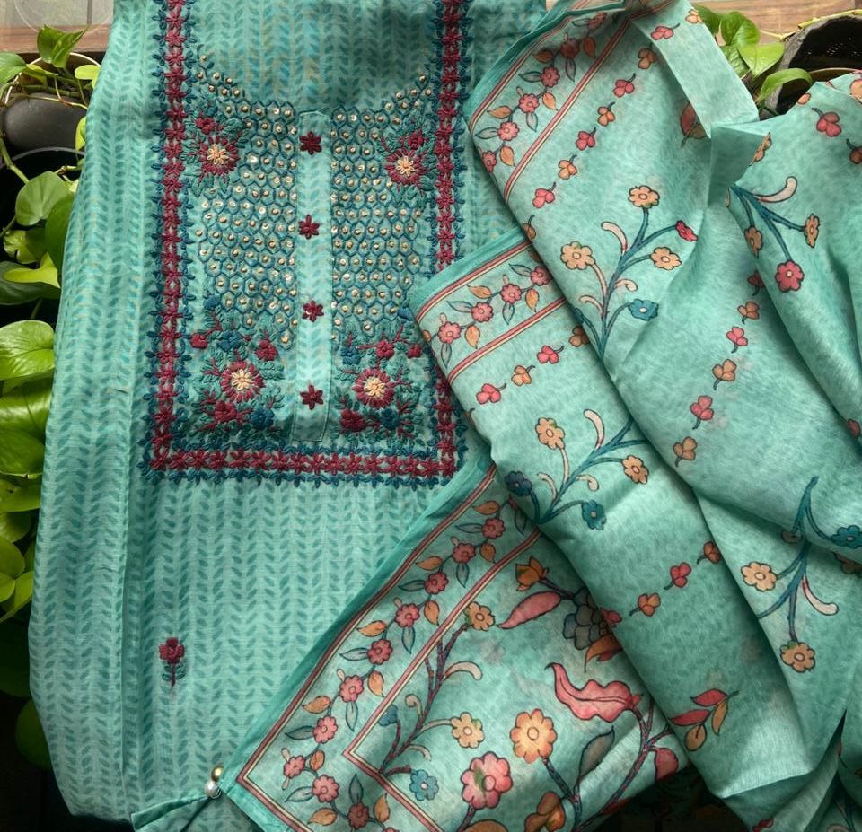 Beautiful Chandheri silk top & Duppatta with kanta hand embroidery throughout & santoon bottom !!! The beautiful handpicked colors & the exquisite embroidery makes these very stunning .Limited pieces available!!!Hurry & order these before we run out of them! Perfect choice for gifting your dear ones this festive season