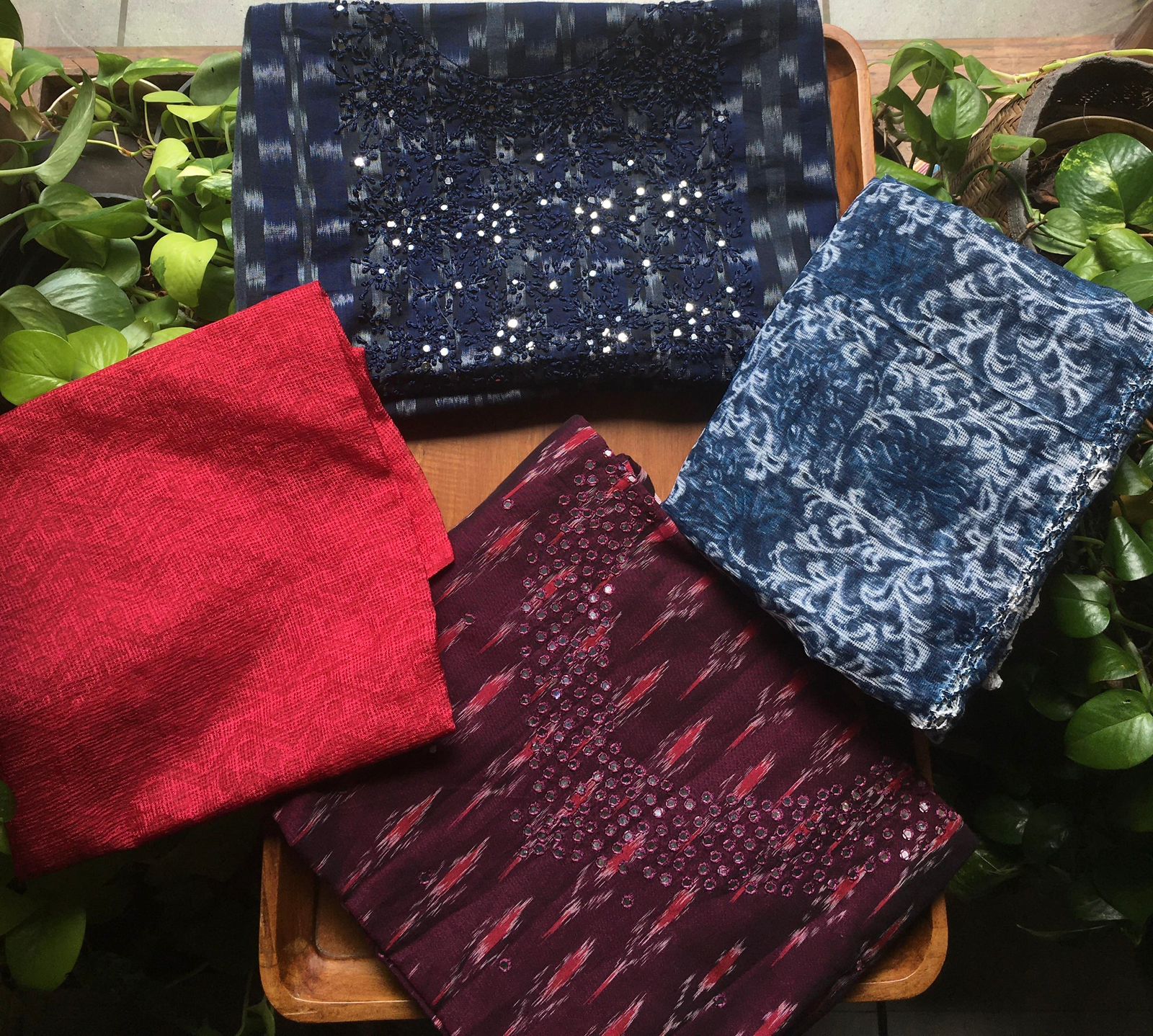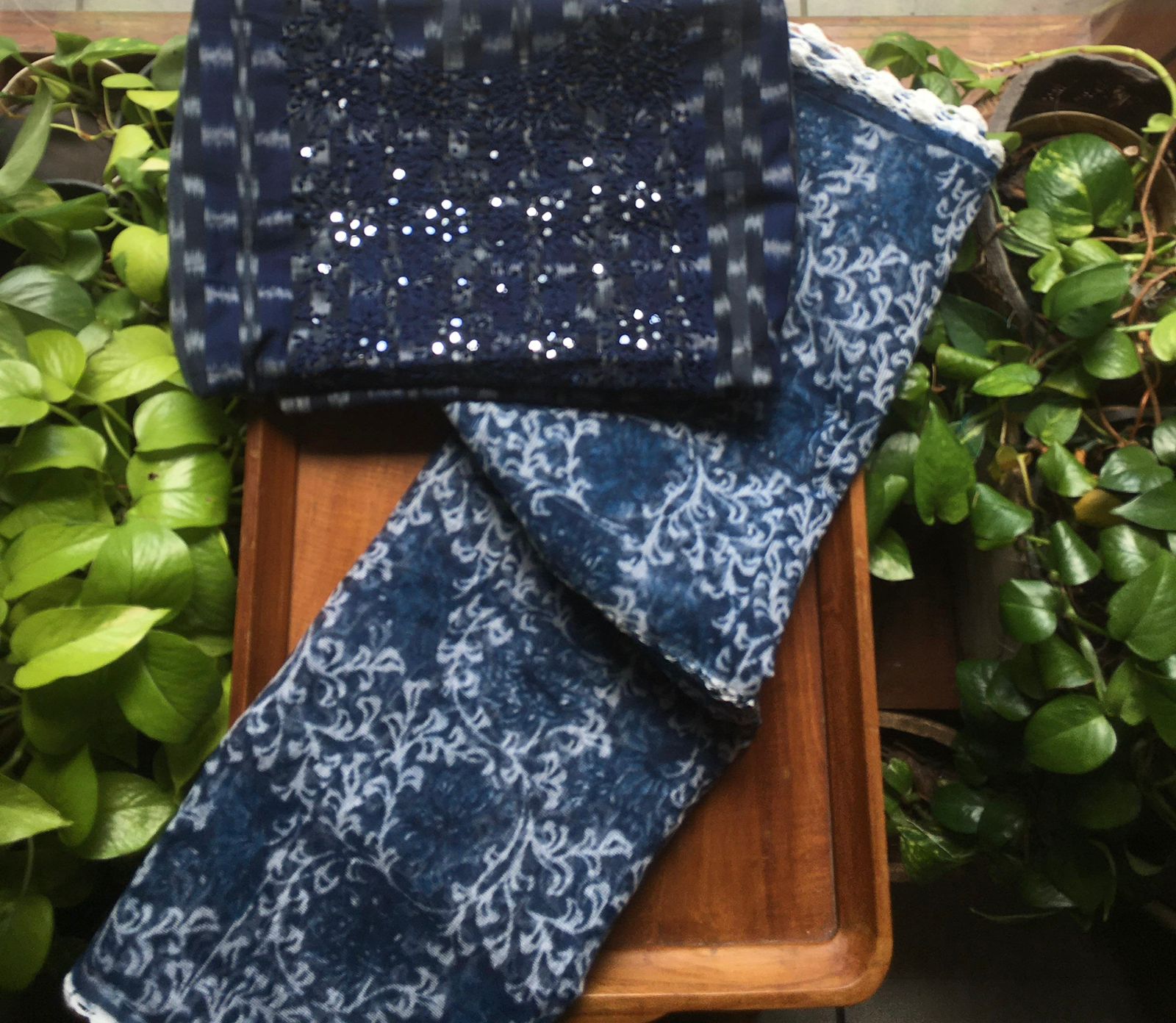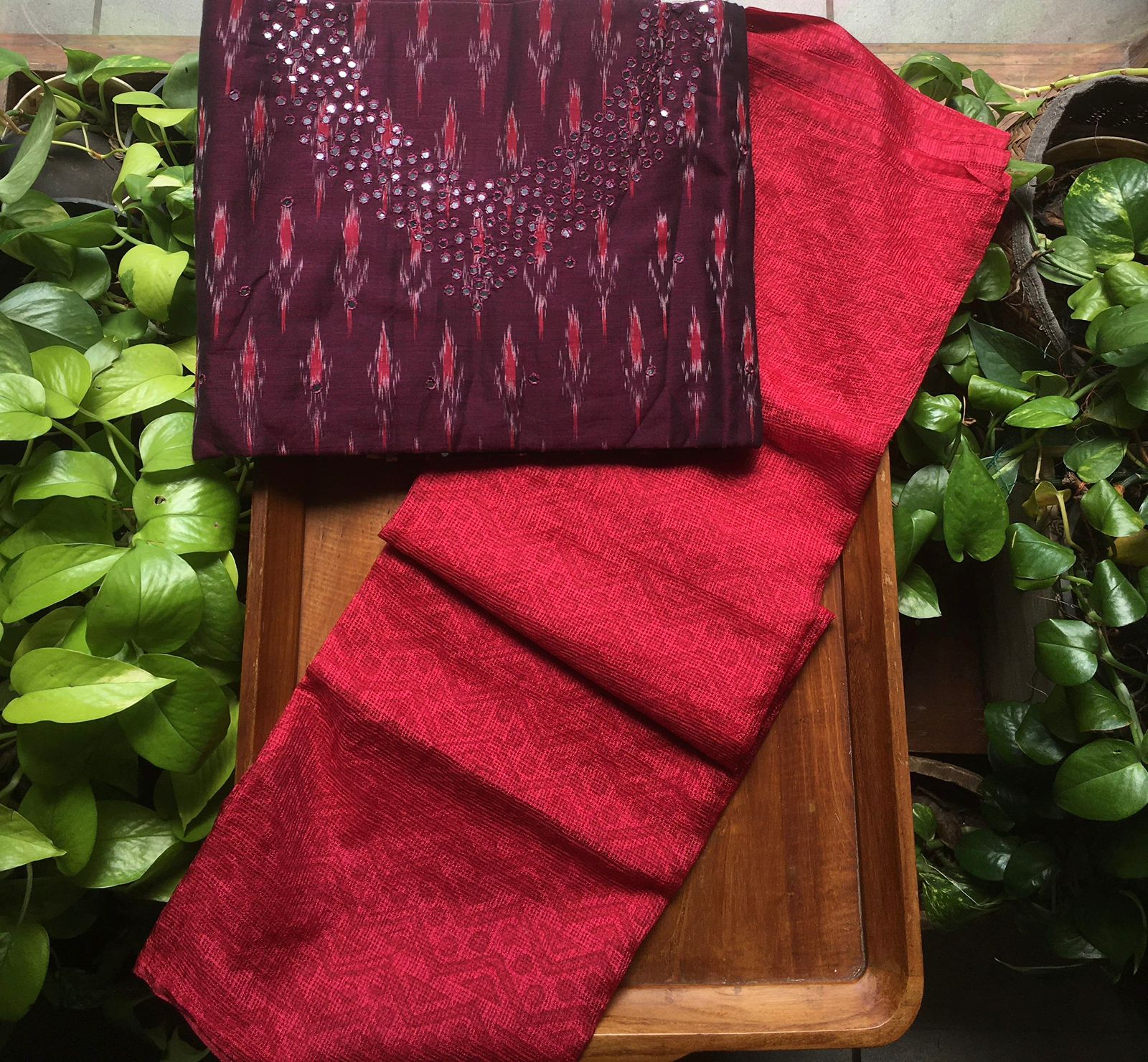 Beautiful Double Ikkat silk top with intricate hand embroidery & mirror work , cotton botton & Kota silk block printed Duppatta…Limited pieces available!!!Hurry & order these before we run out of them! Perfect choice for gifting your dear ones this festive season