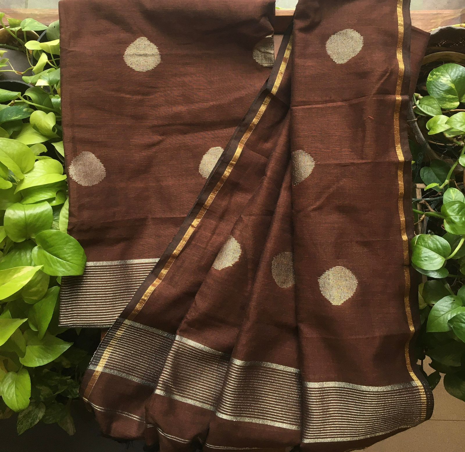 A beautiful collection of Tussar silk sarees with very elegant check weaving on entire saree & borders finished with beautiful cross stitch reminiscent floral embroidery. With blouse pure Benarasi silk