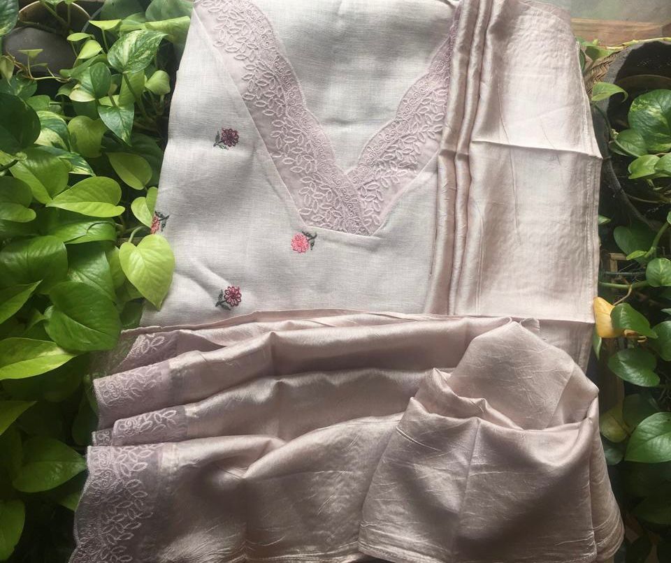 Beautiful Linen Suits in lovely handpicked color hues with exquisite hand embroidery featuring bullion knots, satin stitches, French knots n more