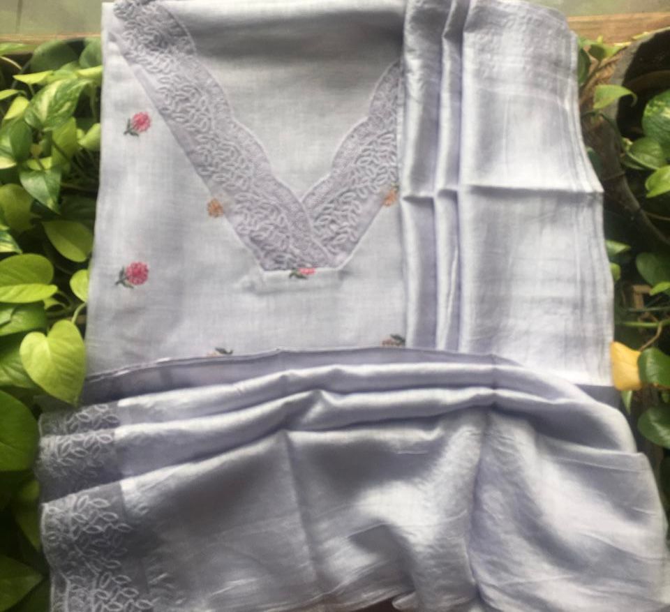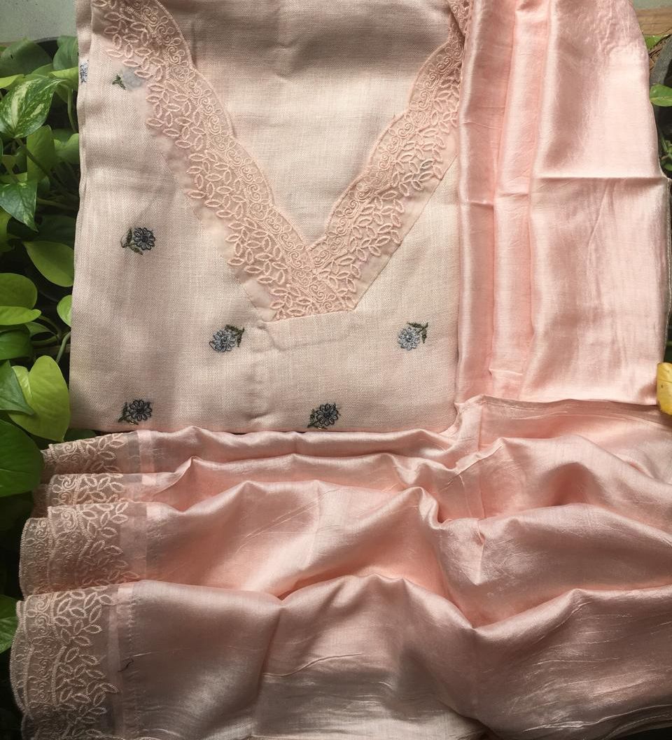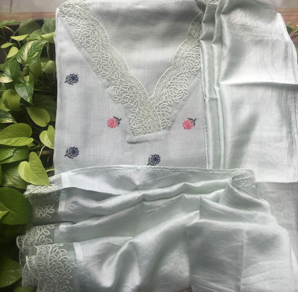 Beautiful Linen cotton top with floral embroidery & French lace detailing at neck & sleeve borders , cotton botton &  silk Duppatta with French lace borders !!! Limited pieces available!!!Hurry & order these before we run out of them! Perfect choice for gifting your dear ones this festive season
