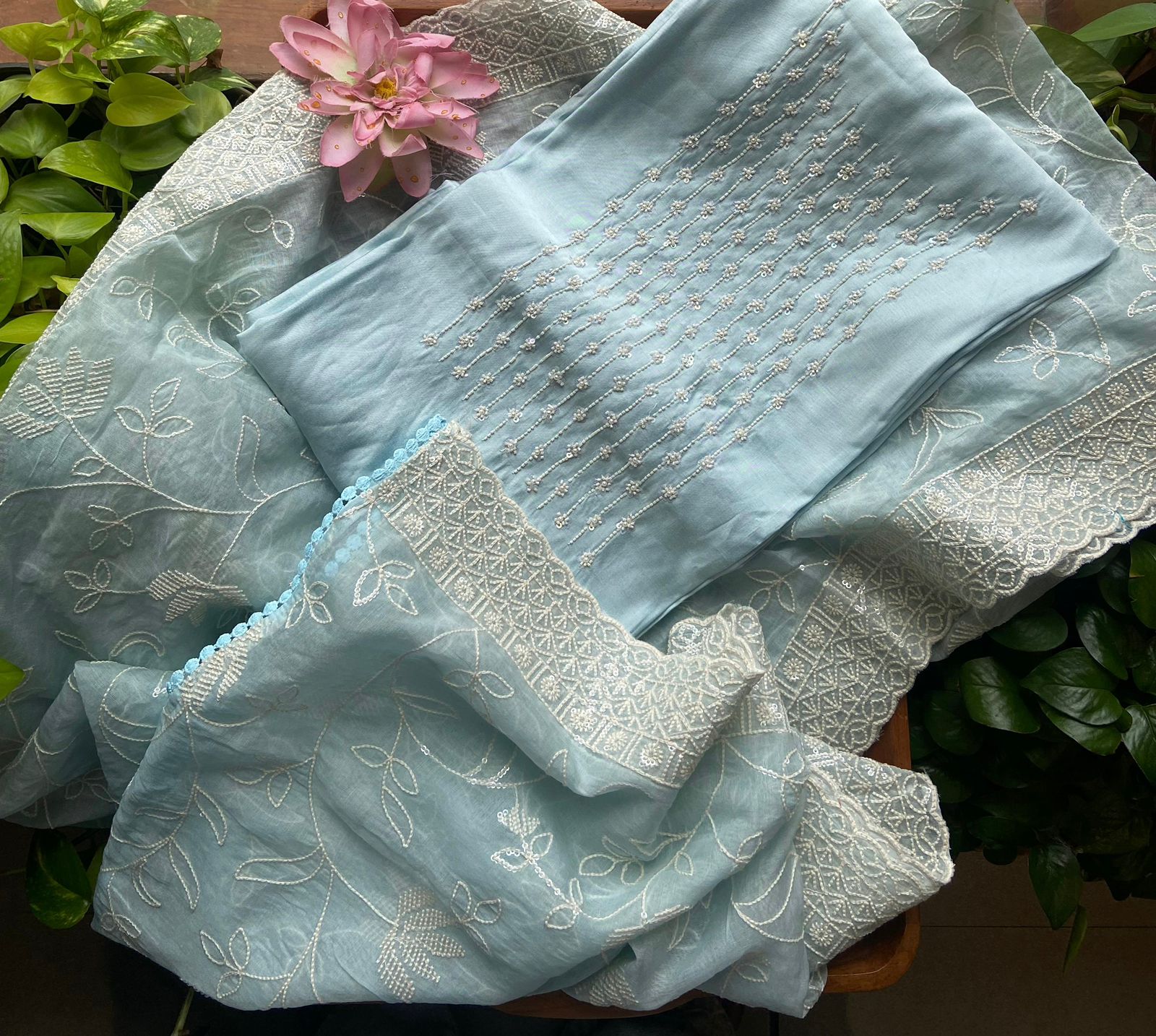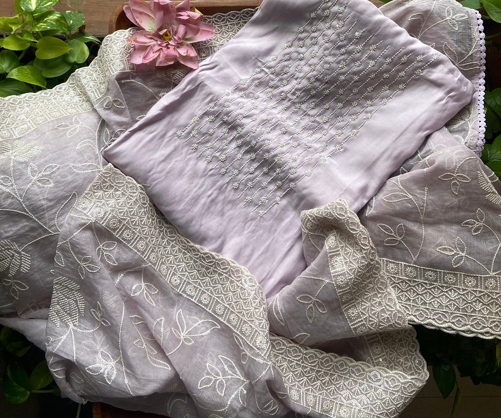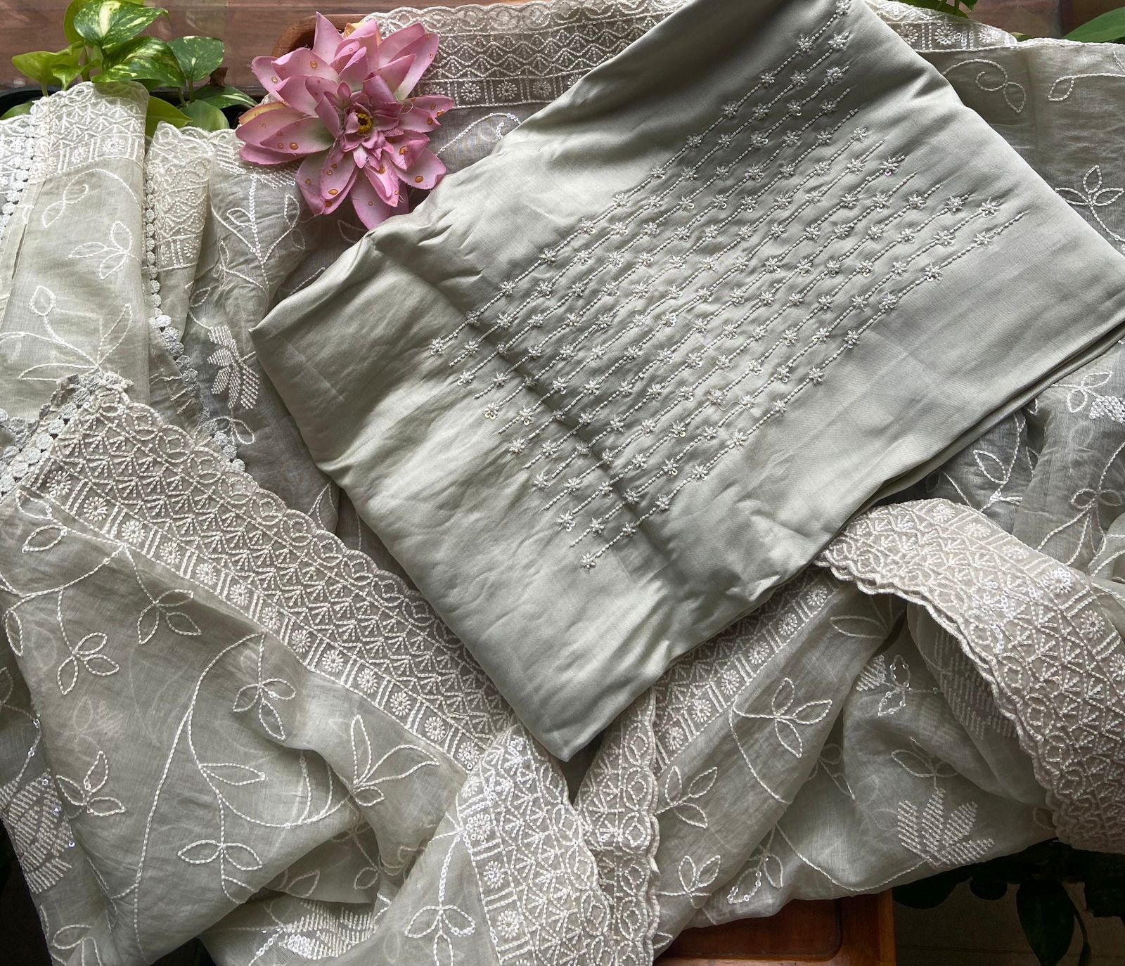 A beautiful Designer Wear Collection in Georgette with gorgeous Chikankari embroidery featuring a contemporary Paisley motif on top & Duppatta & tiny scalloped borders for detailing. Cotton silk bottom.