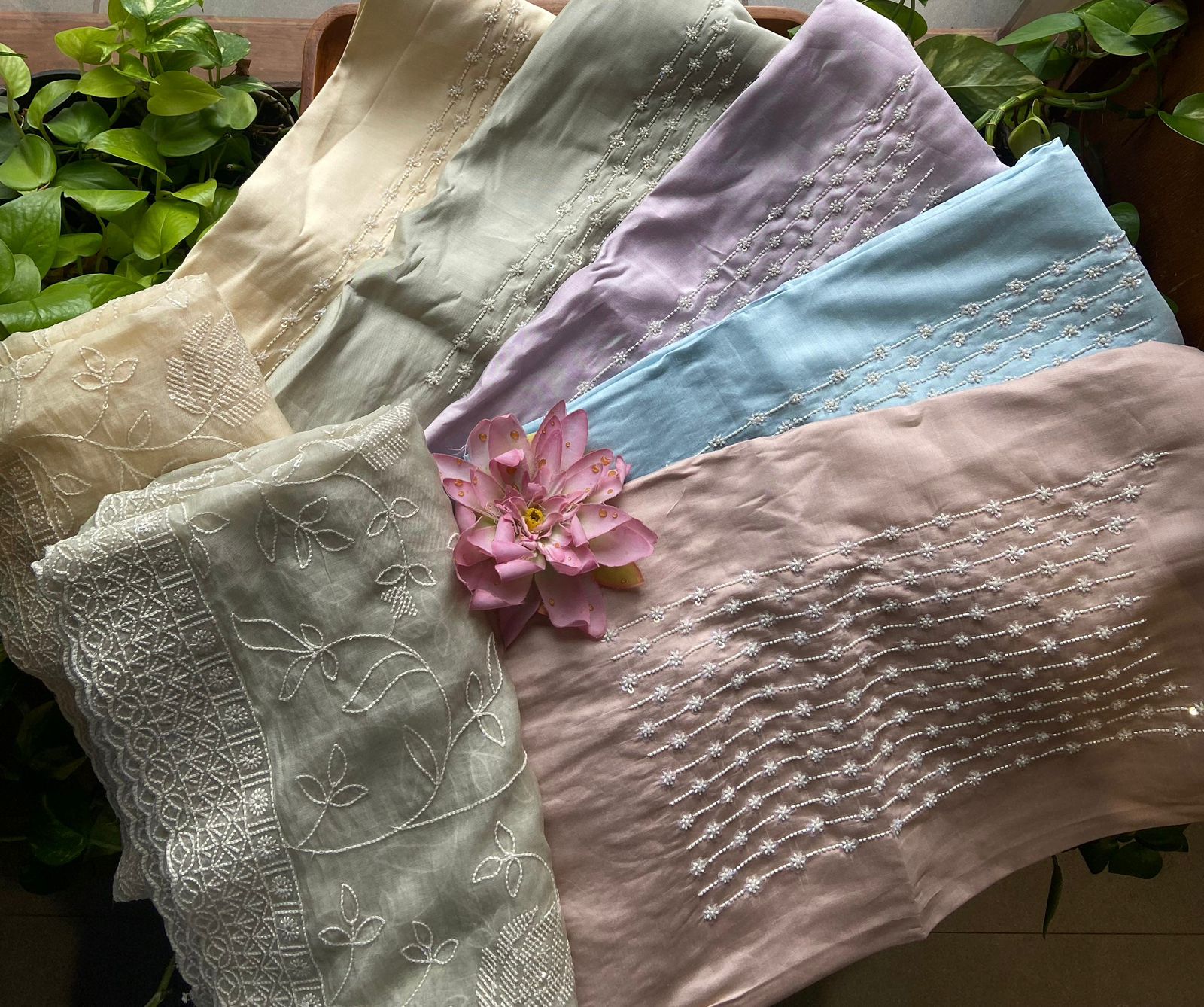 Presenting out Brand New Collection for Onam at a Special Price of ā¹1499/- curated on Chiffon woth Cutwork and beautiful floral embroidery! Ethereal hues of Pink, Pearl Green, Ivory gold, Dusty pink & Jet black on Chiffon top and Duppatta with floral embroidery & Cutwork. The floral embroidery design is created to resemble pearl embroidery. Bottom is cotton silk
