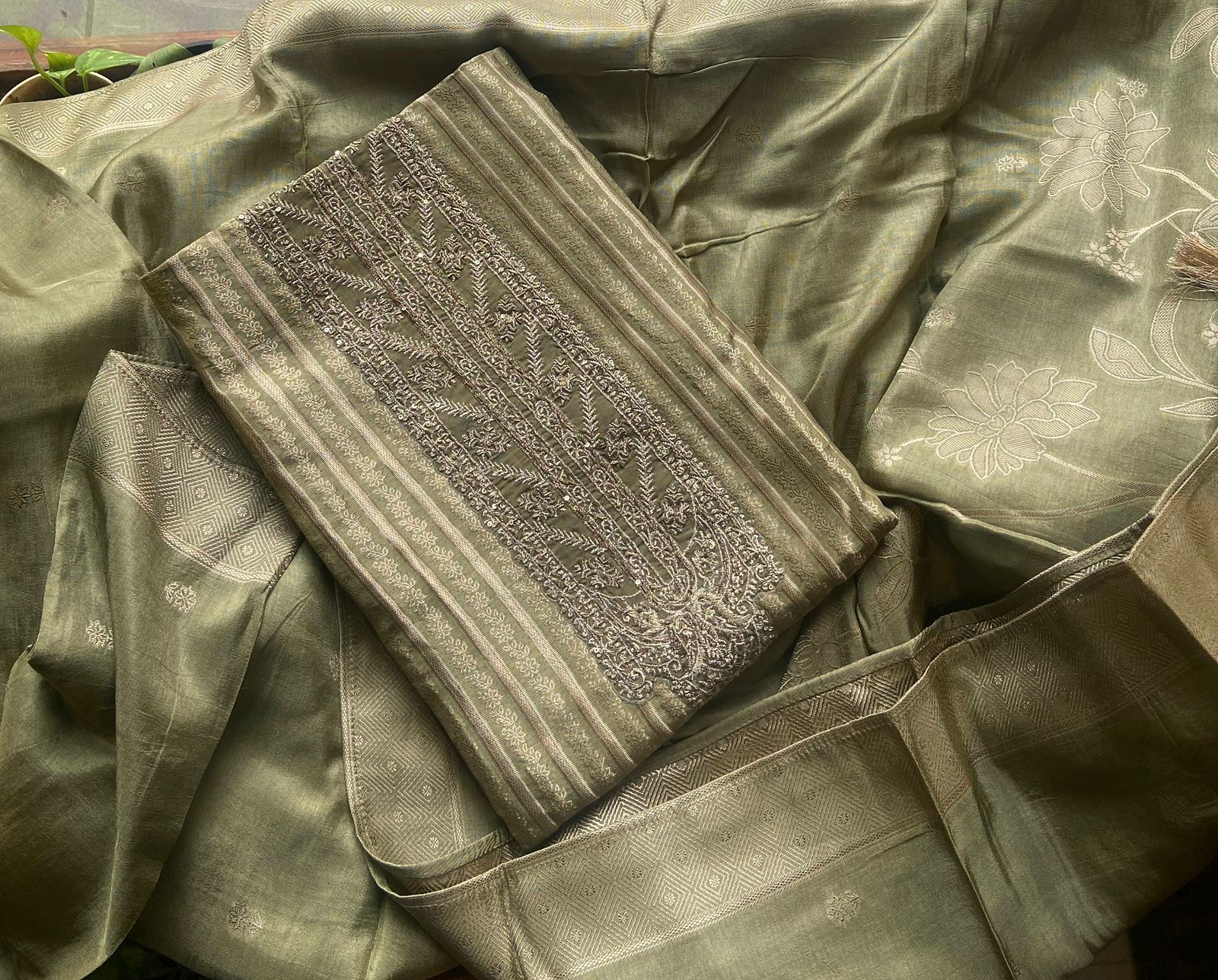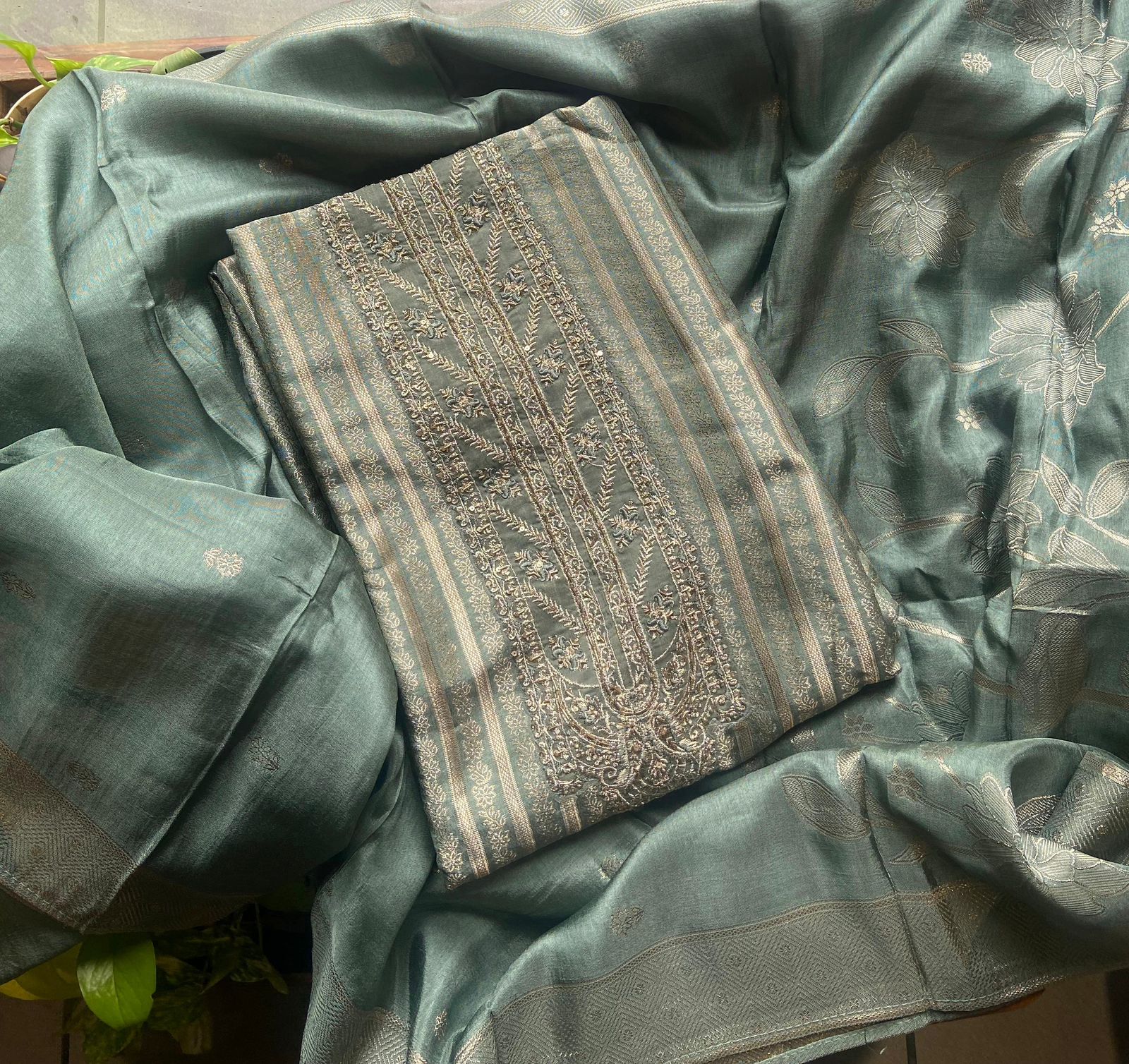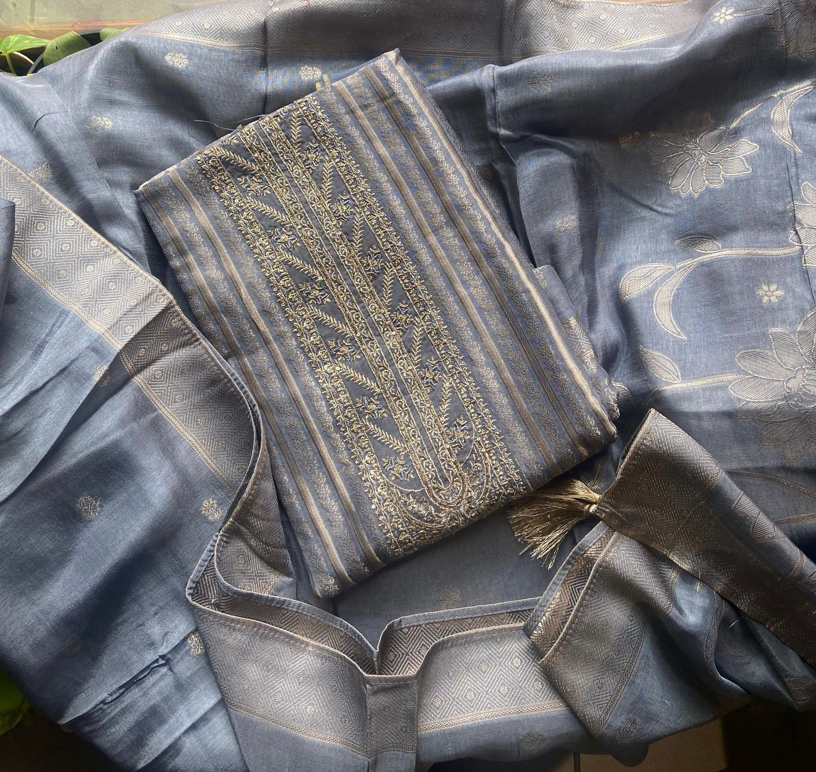 Beautiful pure Benarasi Silk top with very unique stripe weaving & intricate hand embroidery detailing , pure silk bottom & silk Duppatta with Benarasi weaving throughout!Limited pieces available!!!Hurry & order these before we run out of them! Perfect choice for gifting your dear ones this festive seasonĀ