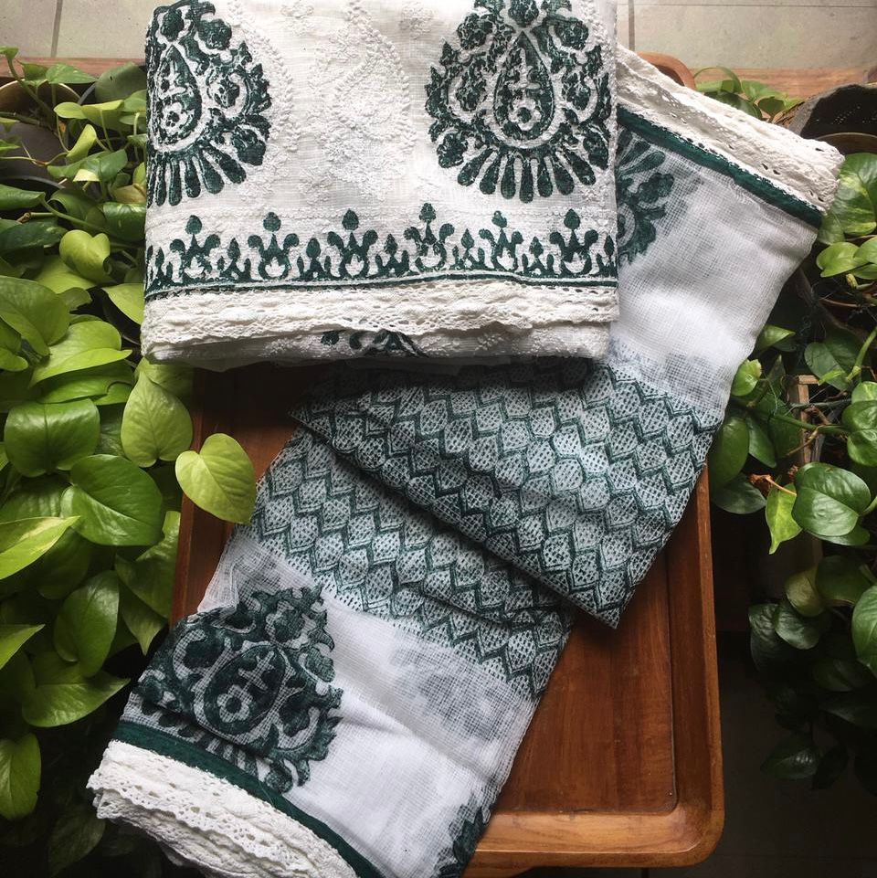 HomeSalwar Set Beautiful pure Kota Doria top & Duppatta with Lucknow Chikankari embroidery detailing & block prints & cotton bottom !Limited pieces available!!!Hurry & order these before we run out of them! Perfect choice for gifting your dear ones this festive season