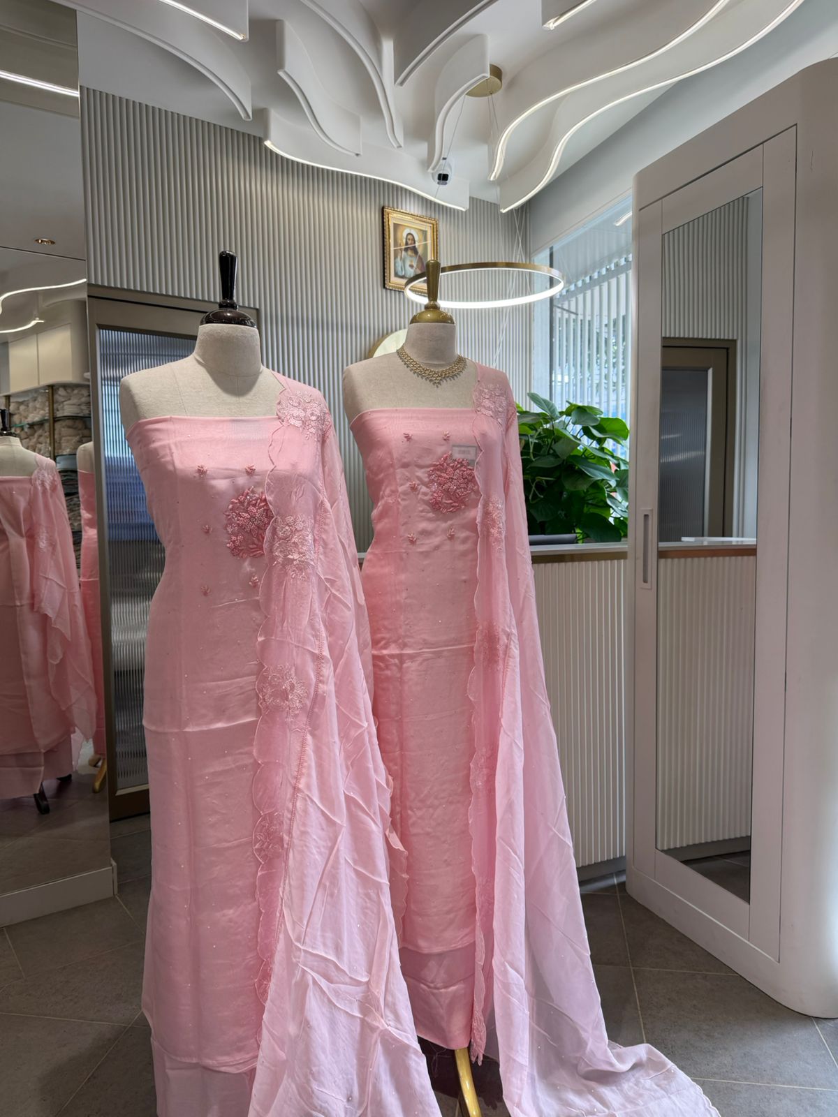 Presenting out Brand New Collection for Onam at a Special Price of ₹1499/- curated on Chiffon woth Cutwork and beautiful floral embroidery! Ethereal hues of Pink, Pearl Green, Ivory gold, Dusty pink & Jet black on Chiffon top and Duppatta with floral embroidery & Cutwork. The floral embroidery design is created to resemble pearl embroidery. Bottom is cotton silk