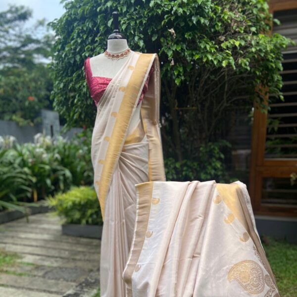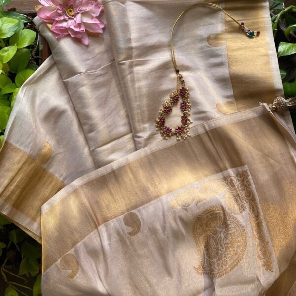 Our Beautiful Onam Edit in Benarasi Tissue Silk with stunning Paisley Weaving on Saree !!! With blouse with borders . The beautiful antique gold tone & hand weaving makes this a beautiful drape for Onam