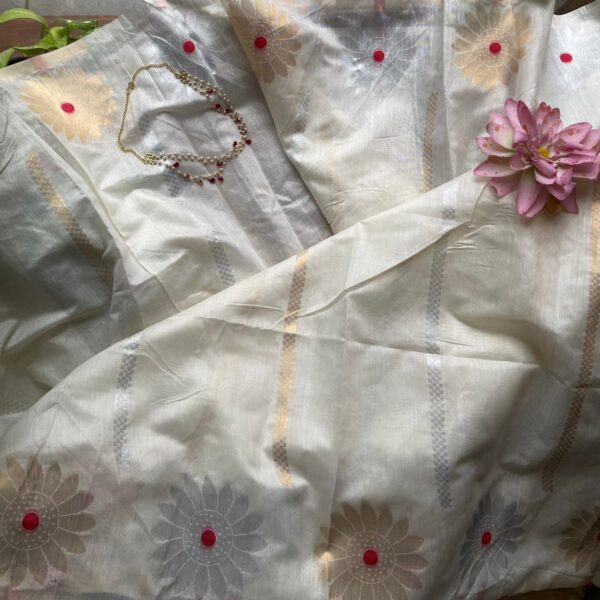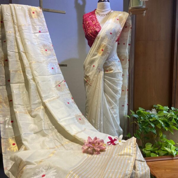 A stunningly beautiful Mal Chandheri saree with Dual weave of Antique Gold&Silver and Minakari weave in red in a gorgeous vertical stripe weaving and floral pattern creating a stunning visual impact. With blouse self with borders. The ethereal antique Ivory Gold hue of the saree creates a beautiful drape once worn ensuring you steal the show this Onam !