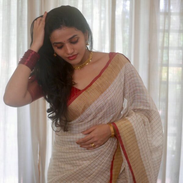 Beautiful & stunning linen silk sarees with elegant check weave and antique gold borders and a pretty red/black/green trimming and blouse and hand done tassels.