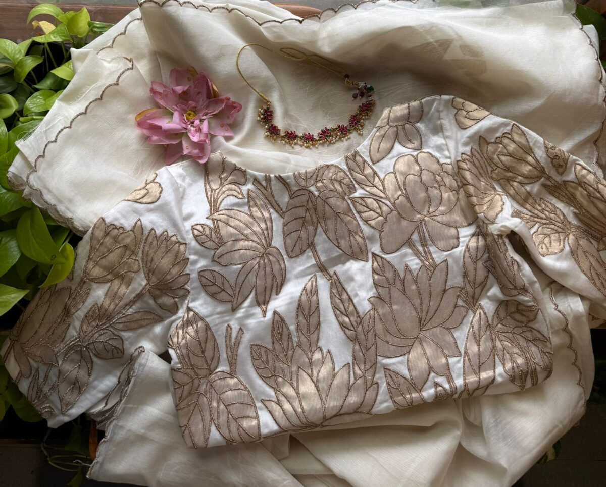 HomeSarees Our Premium Edit in Pure Malai Chandheri Saree with intricate tiny scalloping …The saree is paired with a stunning heavy worked blouse (Unstitched) with complete work on back , front & sleeves with pure tissue appliqué. So excited to bring in this gorgeous saree which speaks of Ornate grandeur & sustainable fashion as this beautiful saree is entirely dyeable to the color of your choice. (Please stitch with santoon lining