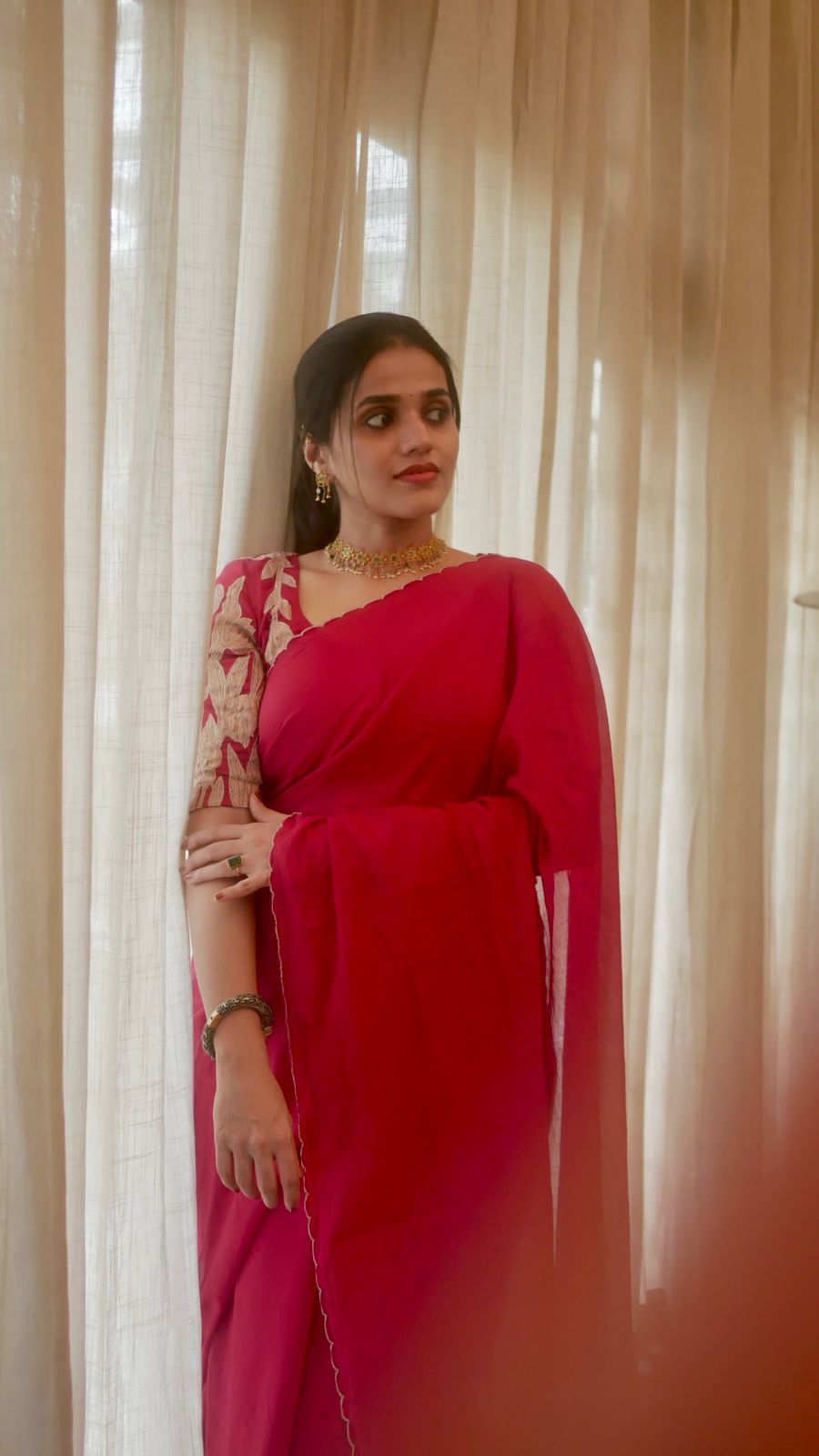 Our Premium Edit in Pure Malai Chandheri Saree with intricate tiny scalloping …The saree is paired with a stunning heavy worked blouse (Unstitched) with complete work on back , front & sleeves with pure tissue appliqué. So excited to bring in this gorgeous saree which speaks of Ornate grandeur & sustainable fashion as this beautiful saree is entirely dyeable to the color of your choice. (Please stitch with santoon lining