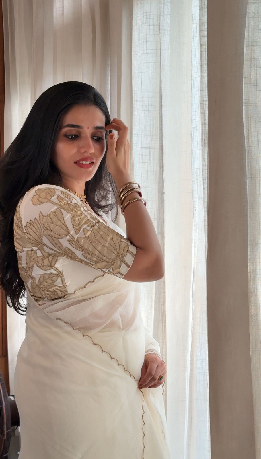 Styling tip : The saree is so elegant and stunning with the designer blouse with pure tissue appliqué work. Makes an ideal wear for Onam & a premium choice for gifting your dear ones