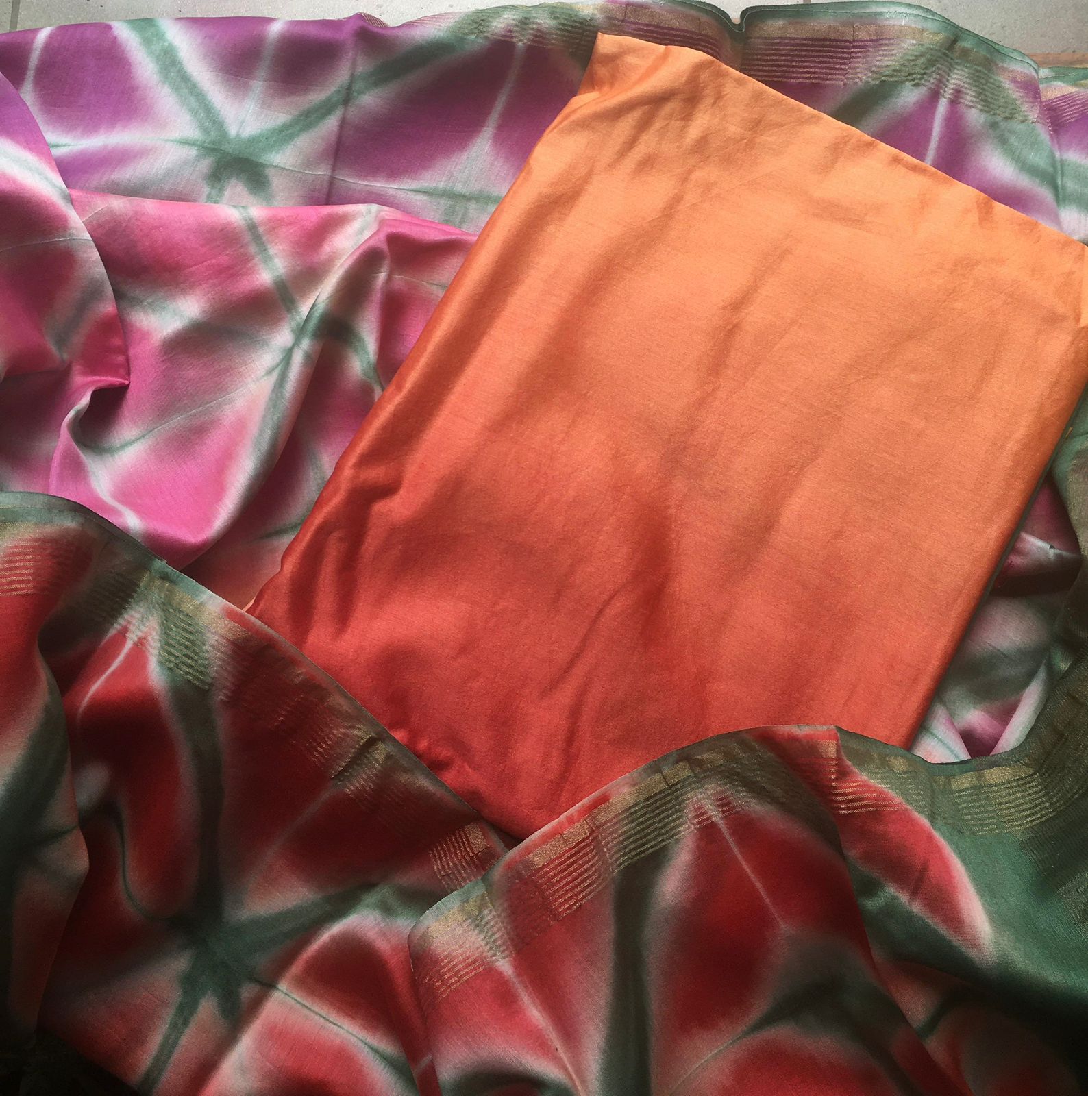 Hand block printed Shibori Maheshwari’s with ombré dyed tops are the perfect choice! Pure maheshwari top with ombré dyeing , santoon bottom and stunning Shibori hand dyed silk Duppatta