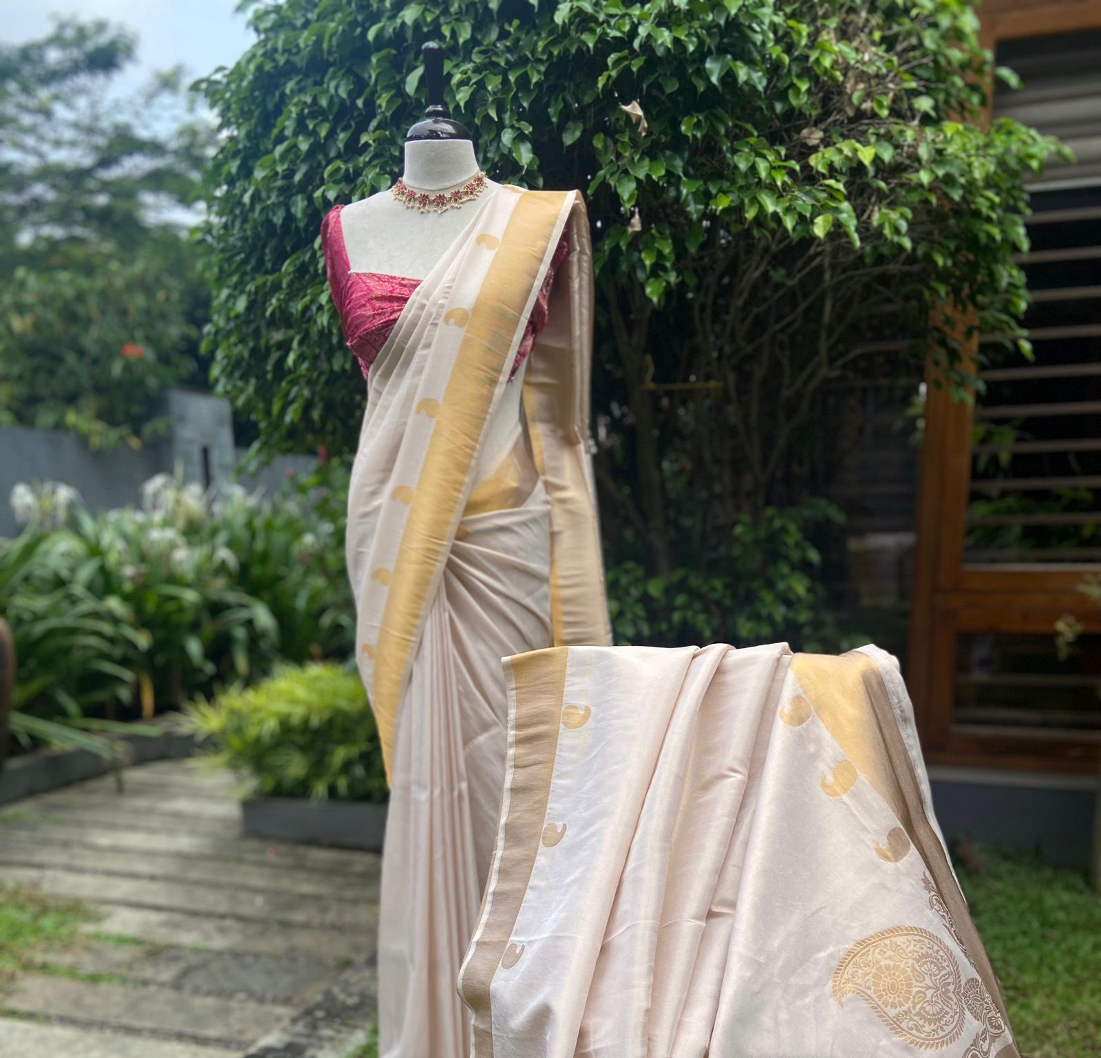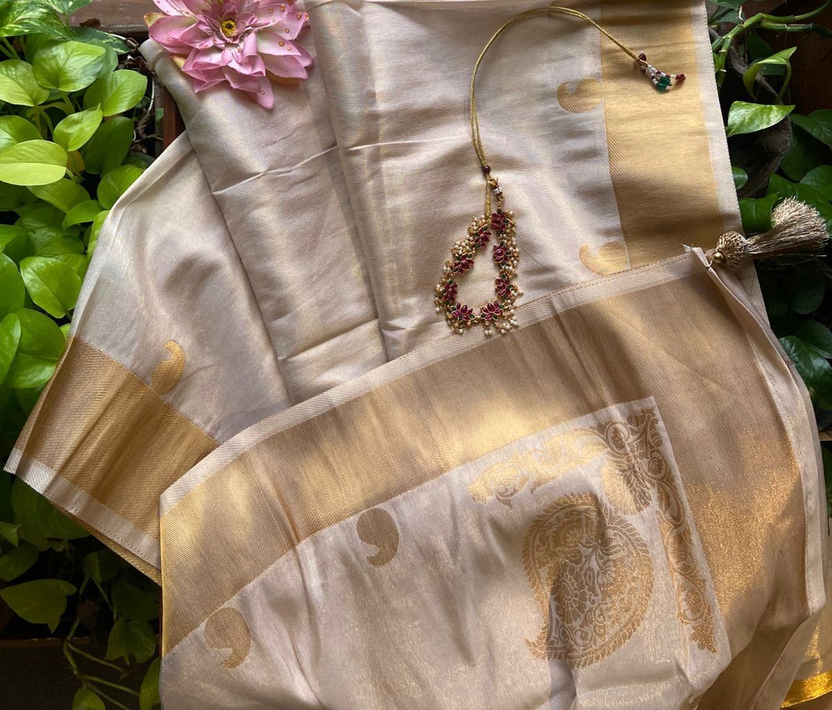 Our Beautiful Onam Edit in Benarasi Tissue Silk with stunning Paisley Weaving on Saree !!! With blouse with borders  . The beautiful antique gold tone & hand weaving makes this a beautiful drape for Onam