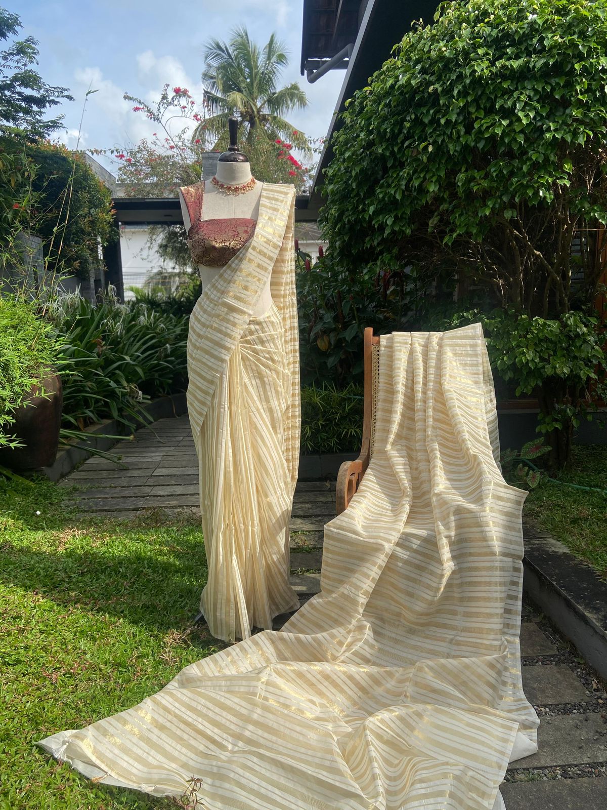 HomeSarees Our Beautiful Onam Edit in Chandheri Silk with stunning Stripe Benarasi Weaving Saree !!! With blouse plain . The vertical stripes assures a taller & leaner appearance on draping.