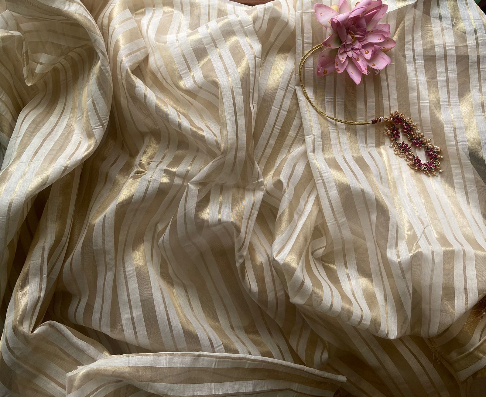 Our Beautiful Onam Edit in Chandheri Silk with stunning Stripe Benarasi Weaving Saree !!! With blouse plain . The vertical stripes assures a taller & leaner appearance on draping.