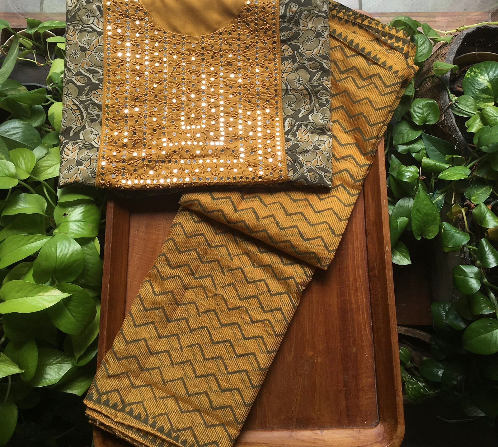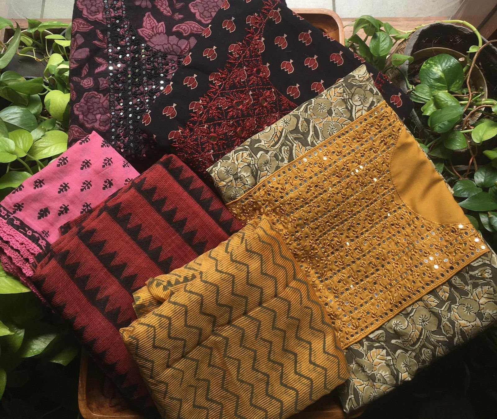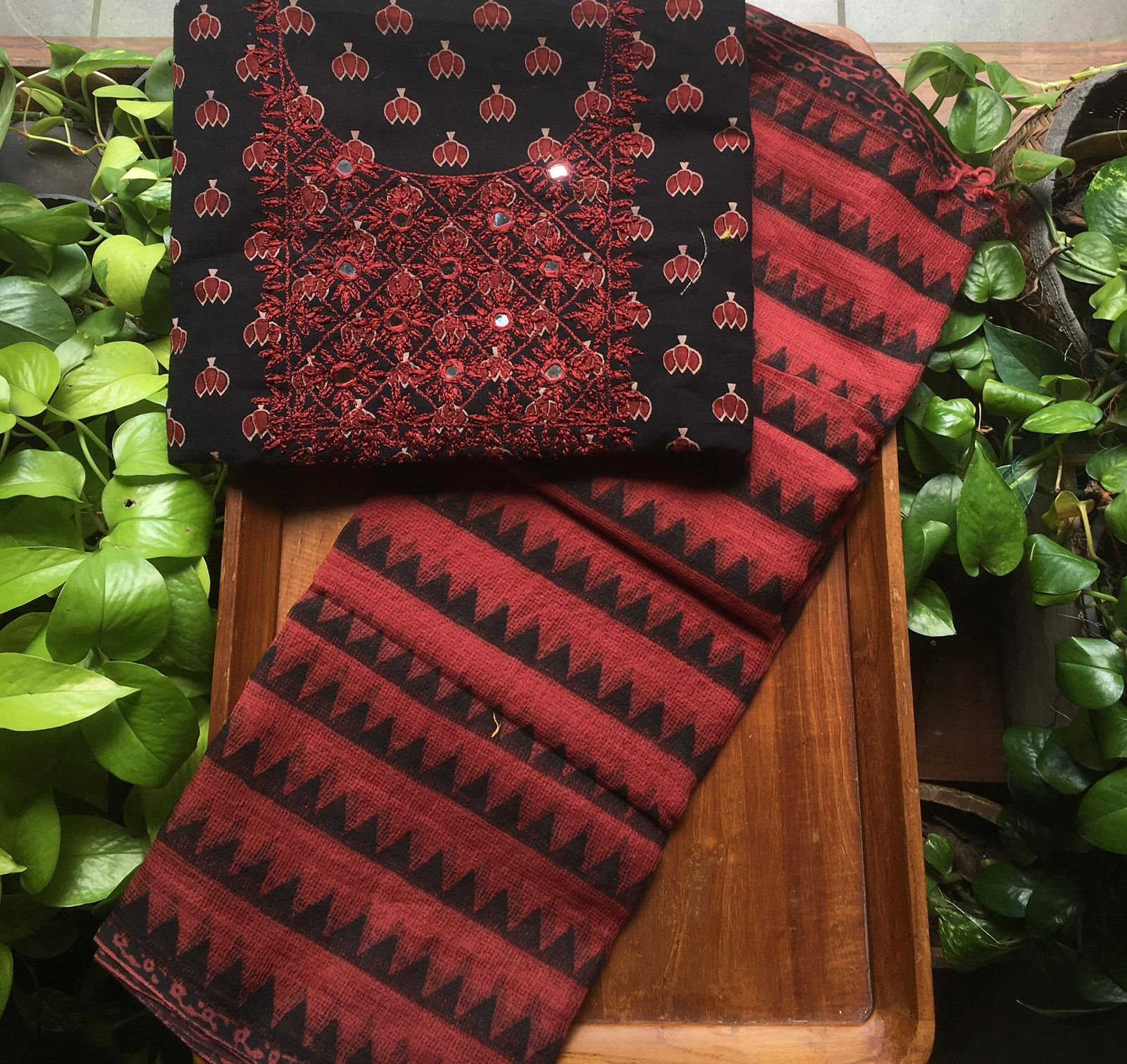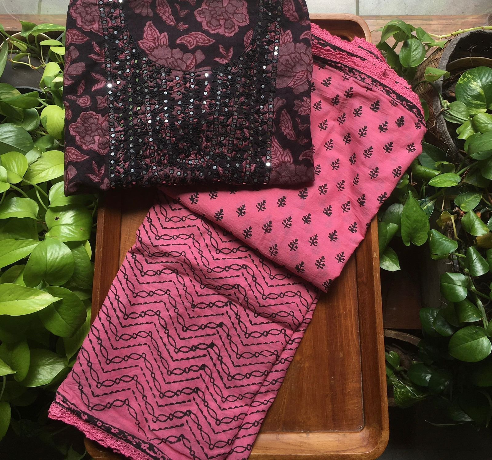 Are you looking out for Beautiful & Unique Designer Cottons to add to your wardrobe ? These Hand block printed Kutch worked cottons are the perfect choice! Pure cotton top with authentic Kutch work (does not need lining ) cotton printed bottom & hand block printed chiffon duppattas