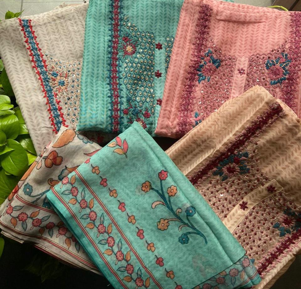 Beautiful Chandheri silk top & Duppatta with kanta hand embroidery throughout & santoon bottom !!! The beautiful handpicked colors & the exquisite embroidery makes these very stunning .Limited pieces available!!!Hurry & order these before we run out of them! Perfect choice for gifting your dear ones this festive season