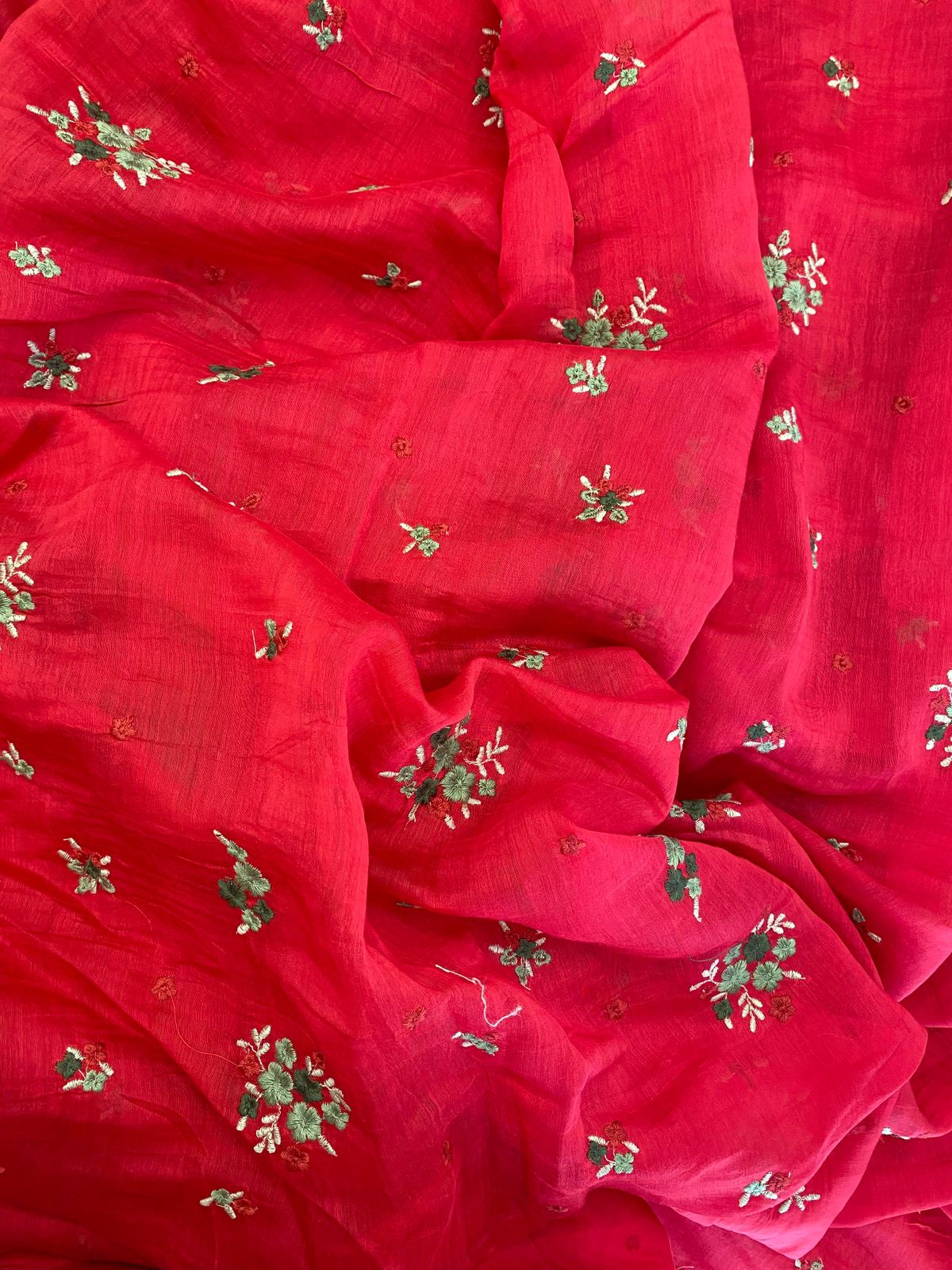 HomeNew Arrivals Presenting a beautiful Butter soft Christmas Red Malai Chandheri fabric that can be styled as an Aline suit, stylish frocks or sarees!!! Can be cut in meterage as required