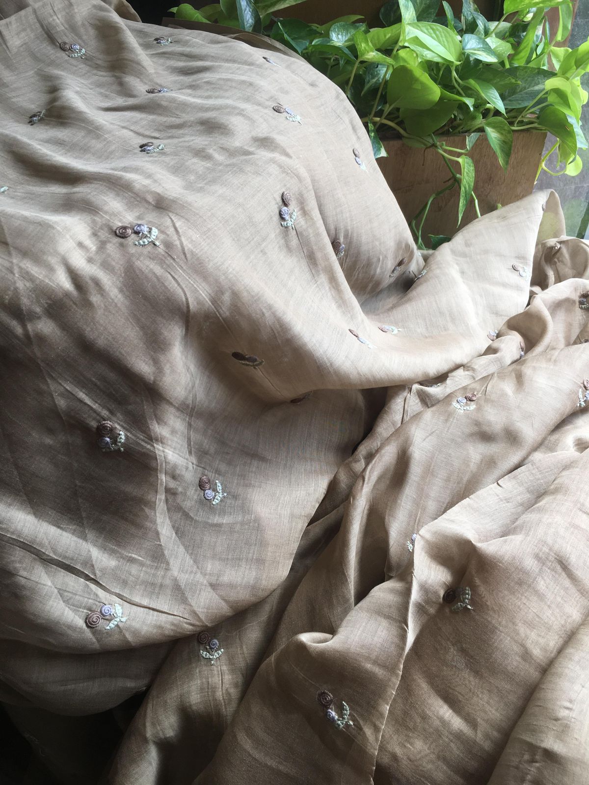 Stunningly gorgeous pure Linen Suit sets in beautiful colours with exquisite hand embroidery featuring bullion knots, satin stitches & lovely mirror work