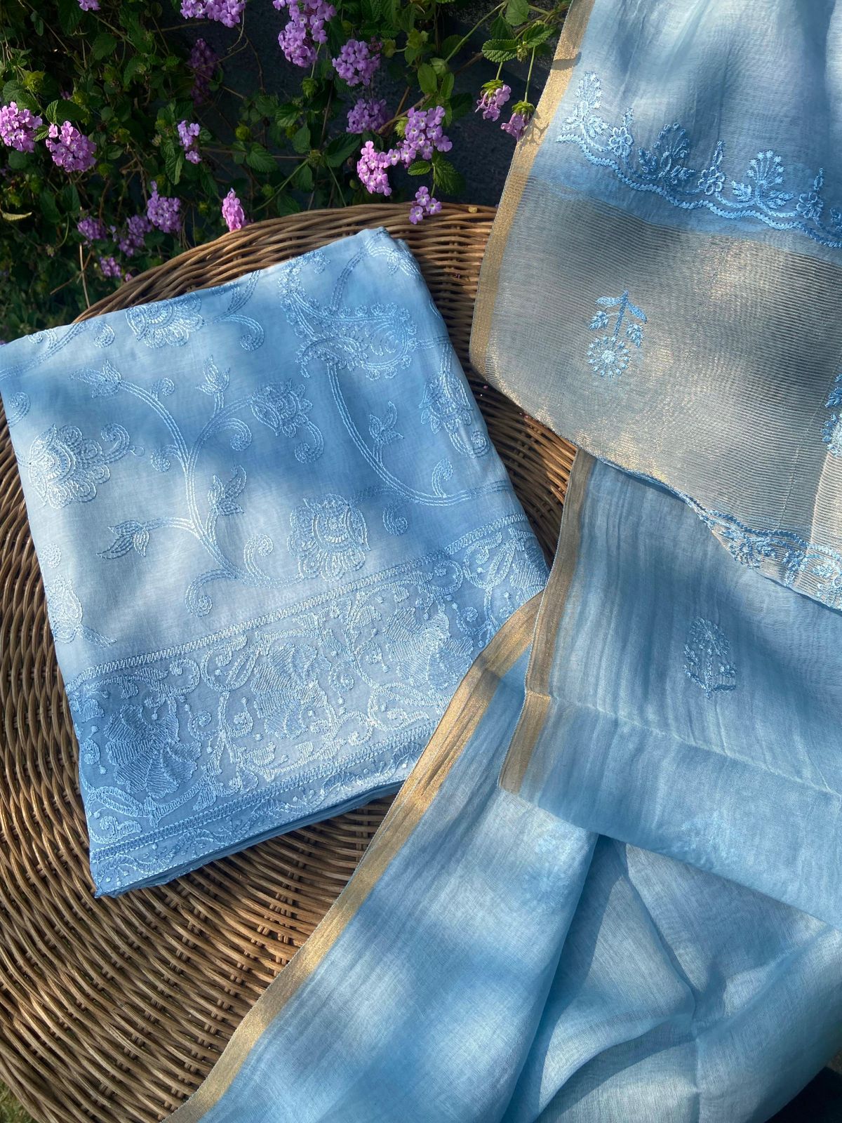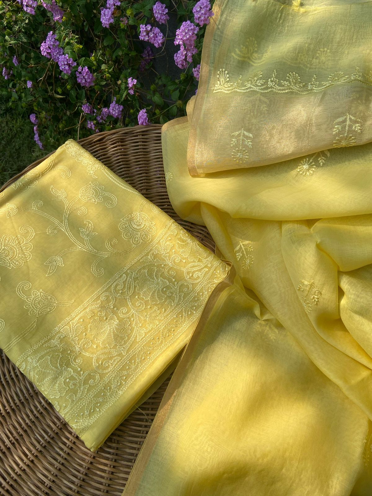 Presenting a Beautiful Edit in Pure Malai Chandheri with exquisite Chikankari Embroidery all along top , santoon bottom & pure malai Chandheri Duppatta with intricate embroidery & Bavanchi borders and tassels