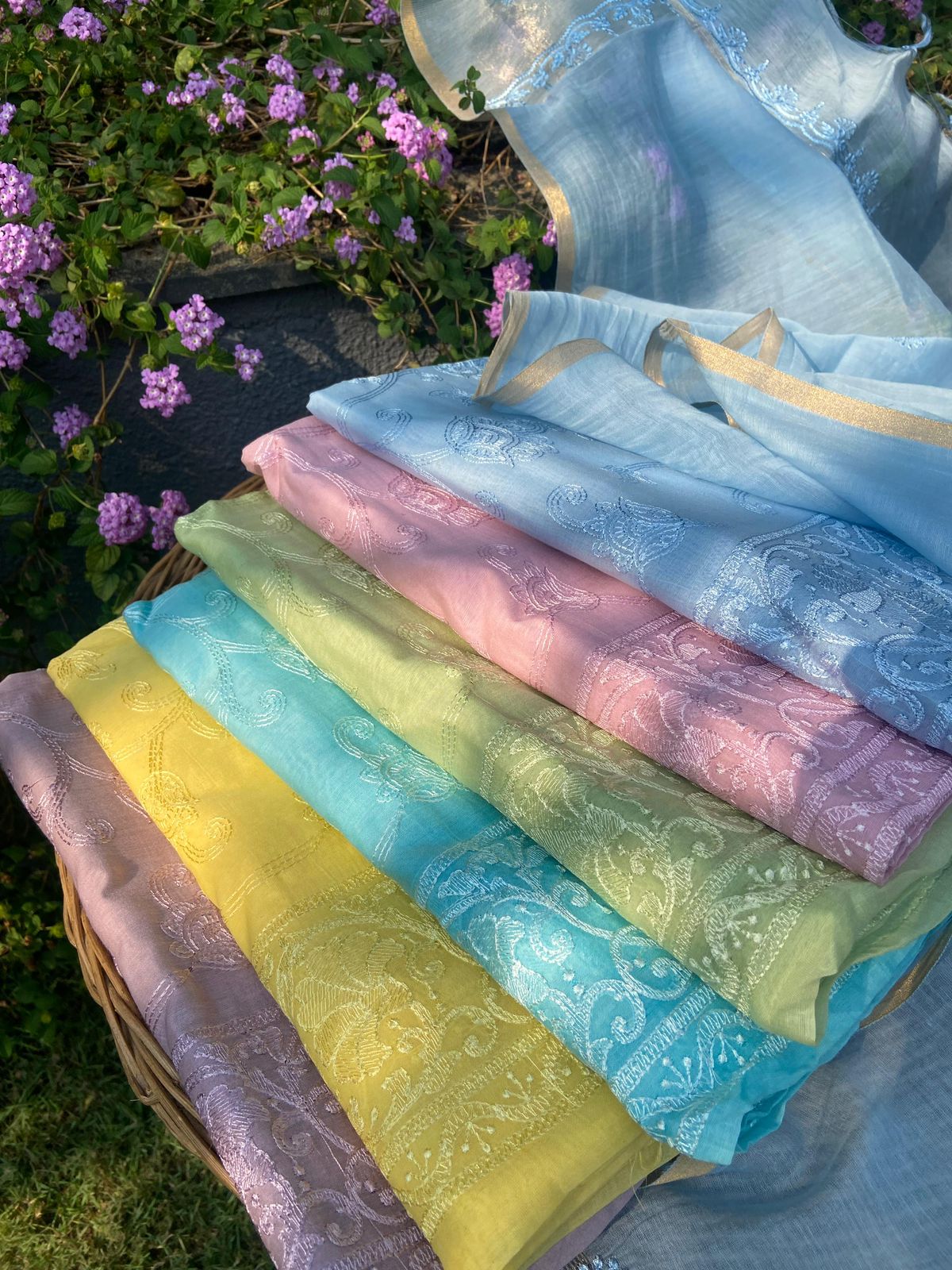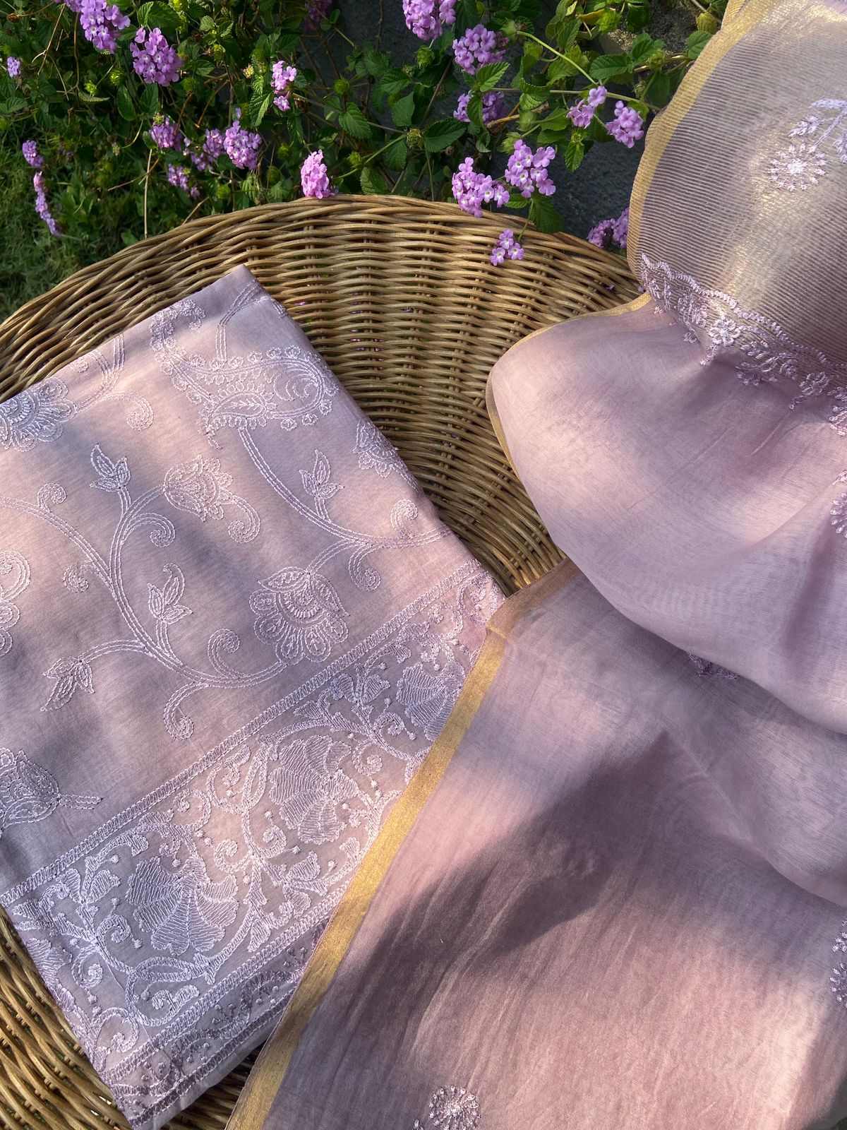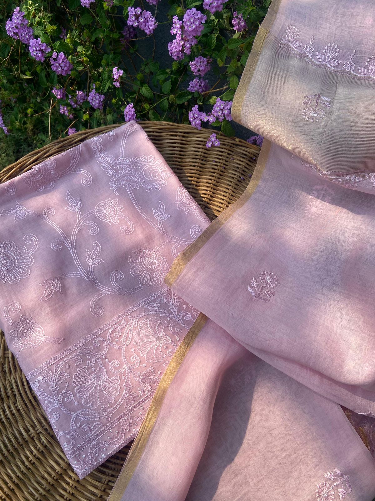 Presenting out Brand New Collection for Onam at a Special Price of ā¹1499/- curated on Chiffon woth Cutwork and beautiful floral embroidery! Ethereal hues of Pink, Pearl Green, Ivory gold, Dusty pink & Jet black on Chiffon top and Duppatta with floral embroidery & Cutwork. The floral embroidery design is created to resemble pearl embroidery. Bottom is cotton silk
