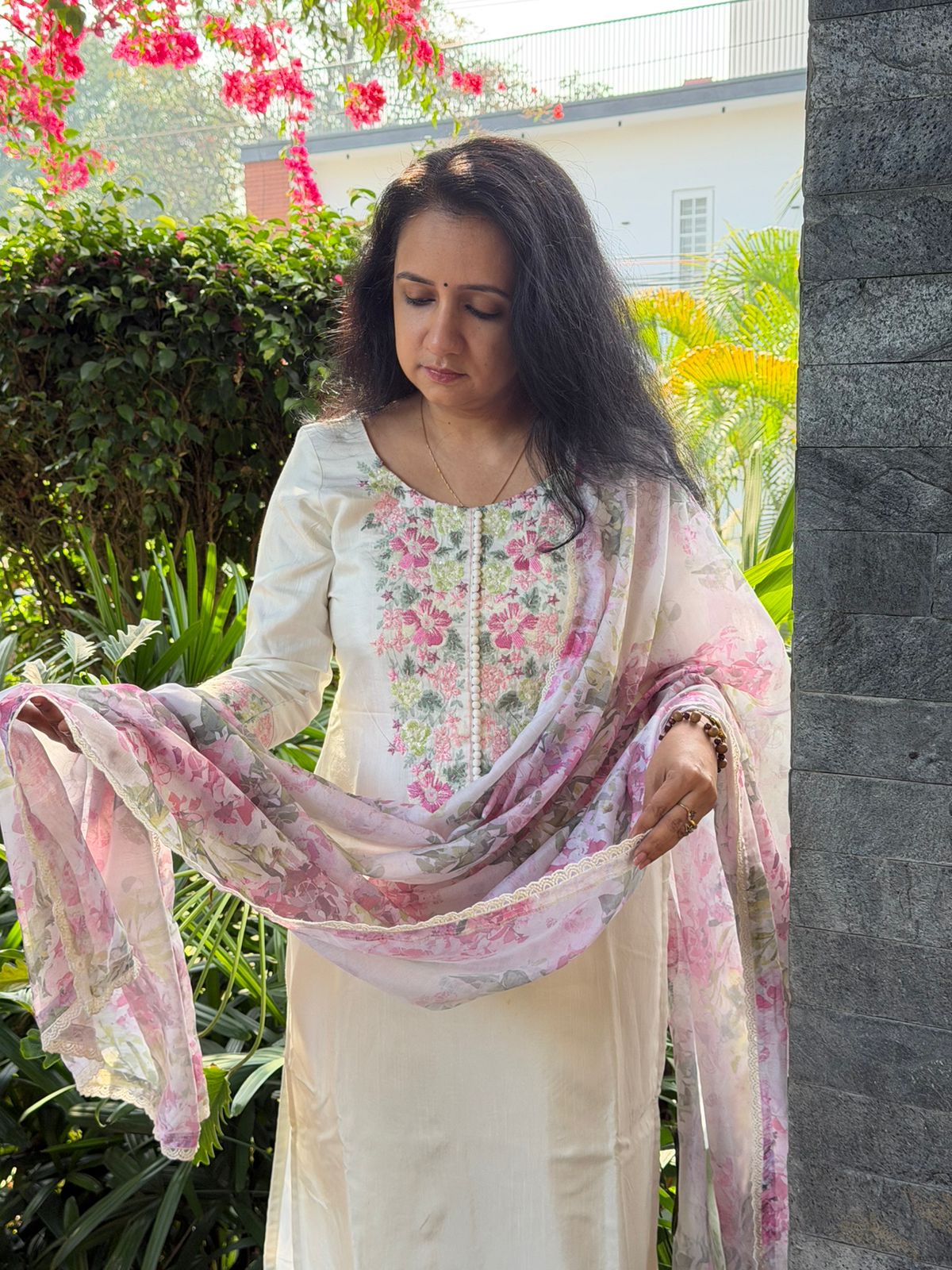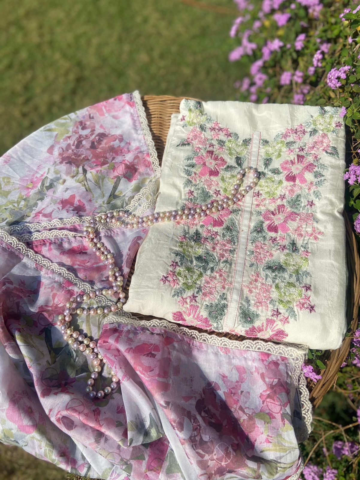 Presenting out Brand New Collection for Onam at a Special Price of ₹1499/- curated on Chiffon woth Cutwork and beautiful floral embroidery! Ethereal hues of Pink, Pearl Green, Ivory gold, Dusty pink & Jet black on Chiffon top and Duppatta with floral embroidery & Cutwork. The floral embroidery design is created to resemble pearl embroidery. Bottom is cotton silk