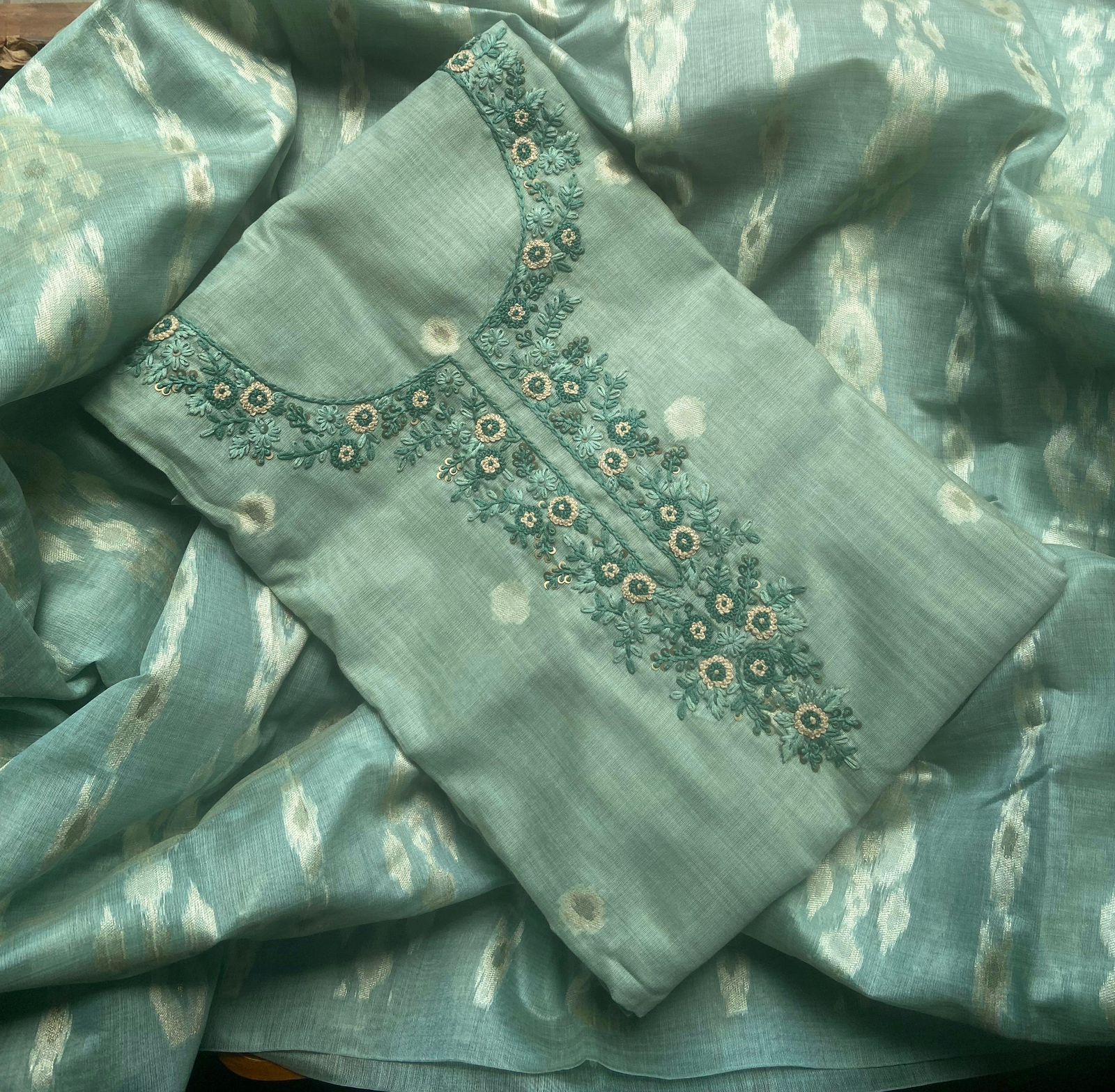 A beautiful Designer Wear Collection in Georgette with gorgeous Chikankari embroidery featuring a contemporary Paisley motif on top & Duppatta & tiny scalloped borders for detailing. Cotton silk bottom.