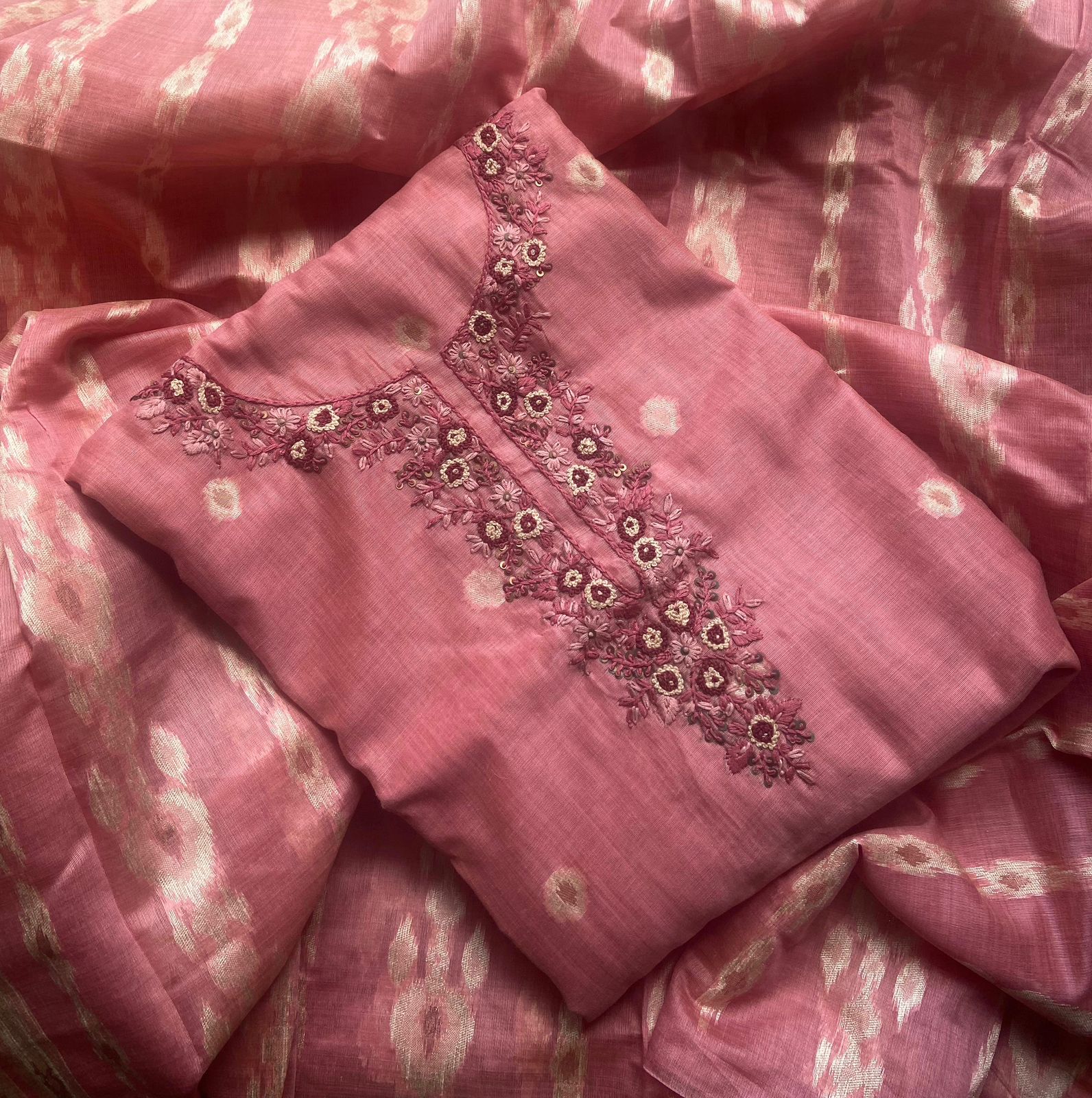 Presenting out Brand New Collection for Onam at a Special Price of ā¹1499/- curated on Chiffon woth Cutwork and beautiful floral embroidery! Ethereal hues of Pink, Pearl Green, Ivory gold, Dusty pink & Jet black on Chiffon top and Duppatta with floral embroidery & Cutwork. The floral embroidery design is created to resemble pearl embroidery. Bottom is cotton silk