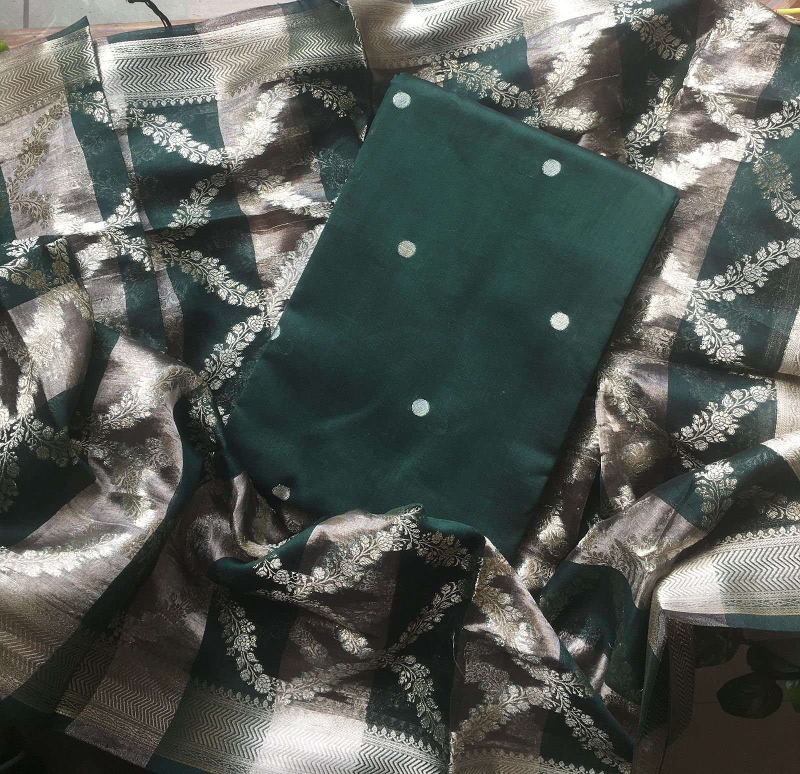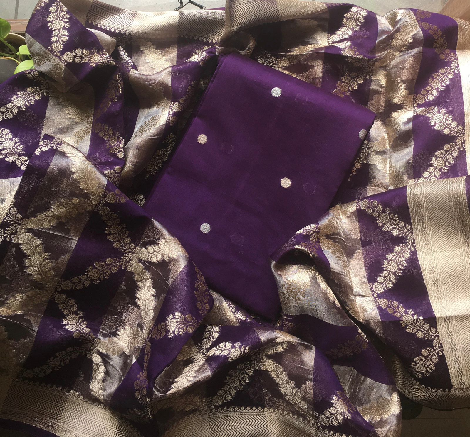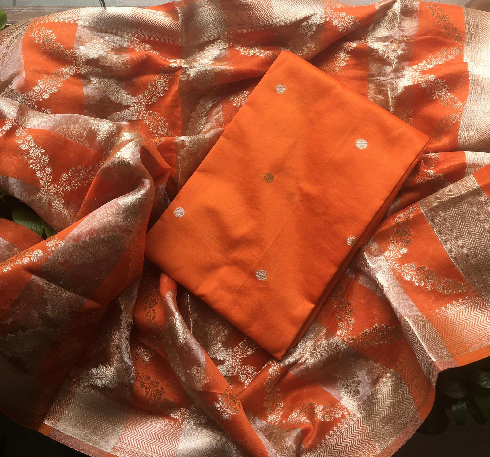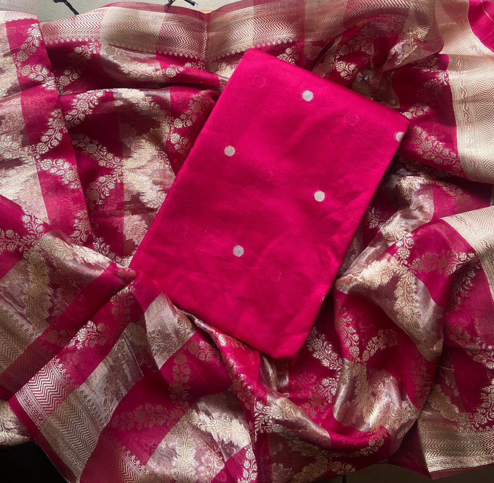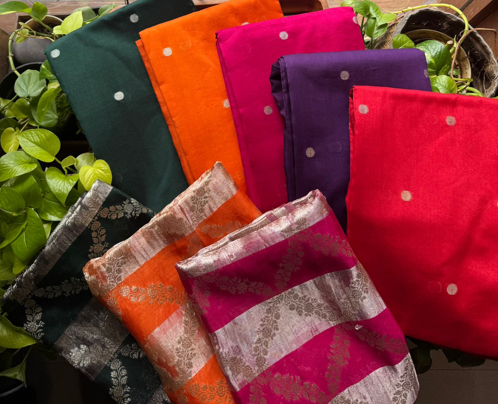 Presenting a stunning collection of pure Maheshwari silkĀ top with polka Benarasi weaving , cotton silk bottom & Maheshwari Organza Duppatta with beautiful hand weaving !!!Hurry & order these before we run out of them! Perfect choice for gifting your dear ones this festive seasonĀ