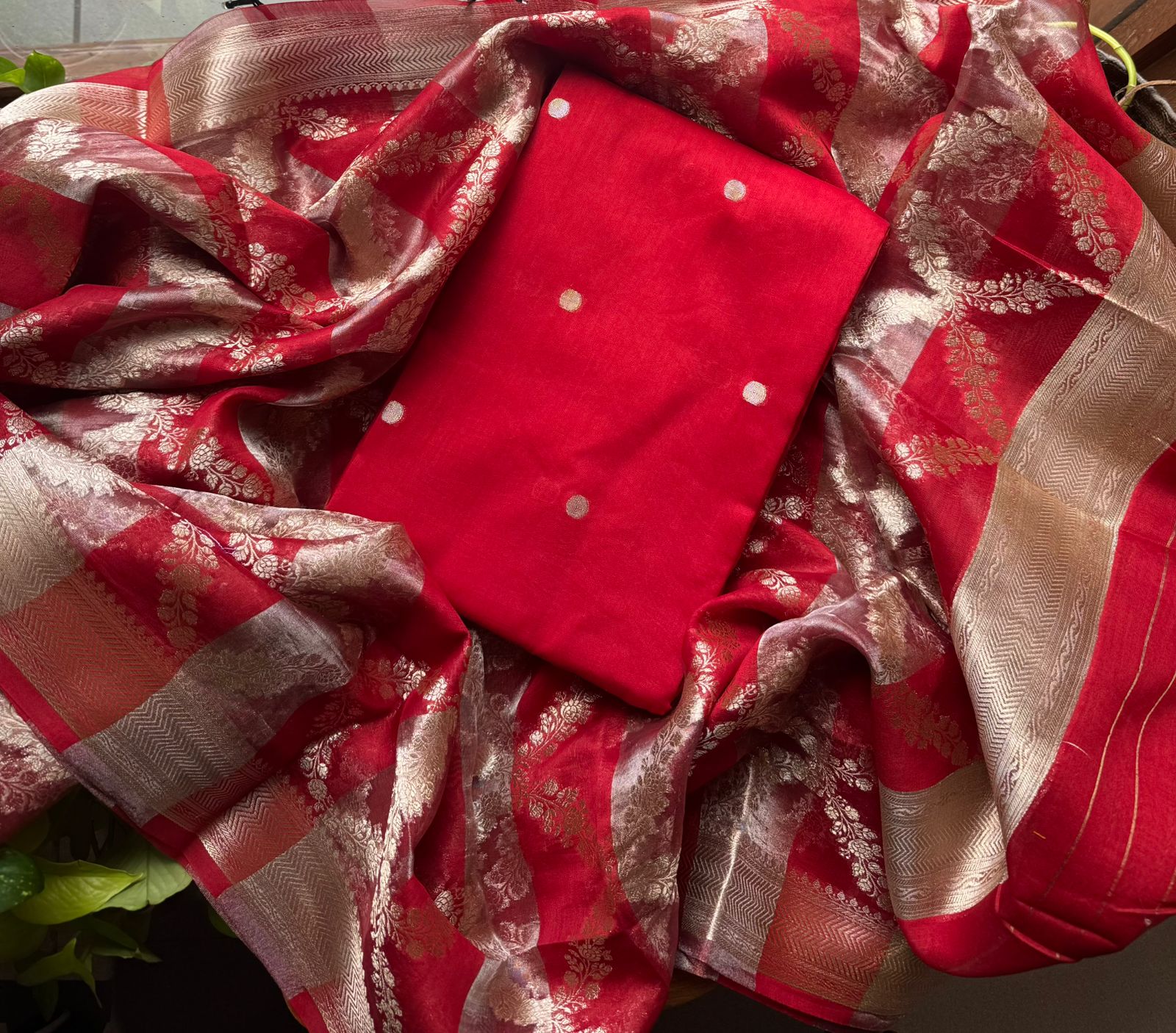 Presenting a beautiful Benarasi dyeable fabric with Minakari weaving in Red tone that can be styled as a suit, stylish cord sets, blouses , Lehenghas or more . Can be cut in meterage as required & dyed to the color of your choice.