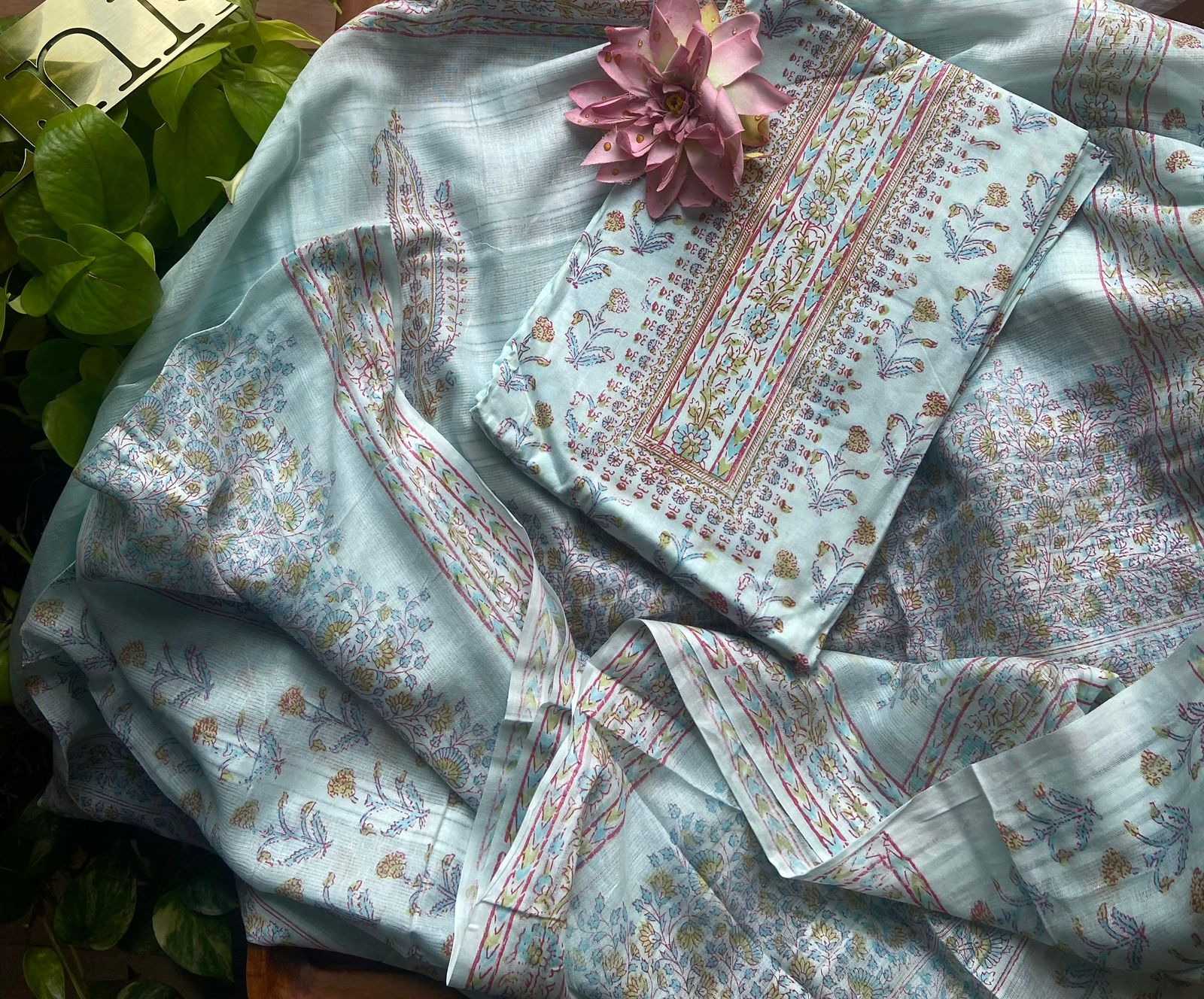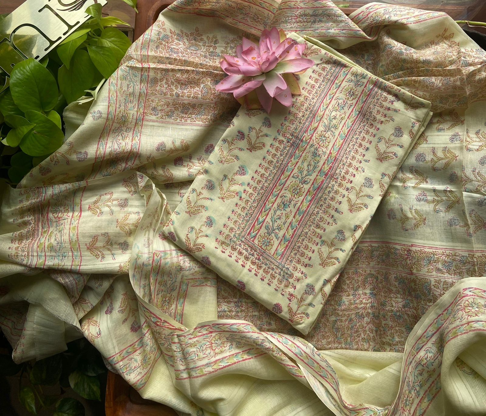 Presenting a stunning collection of pure Linen cotton top with exquisite floral prints & Zari embroidery, cotton bottom & floral linen Duppatta