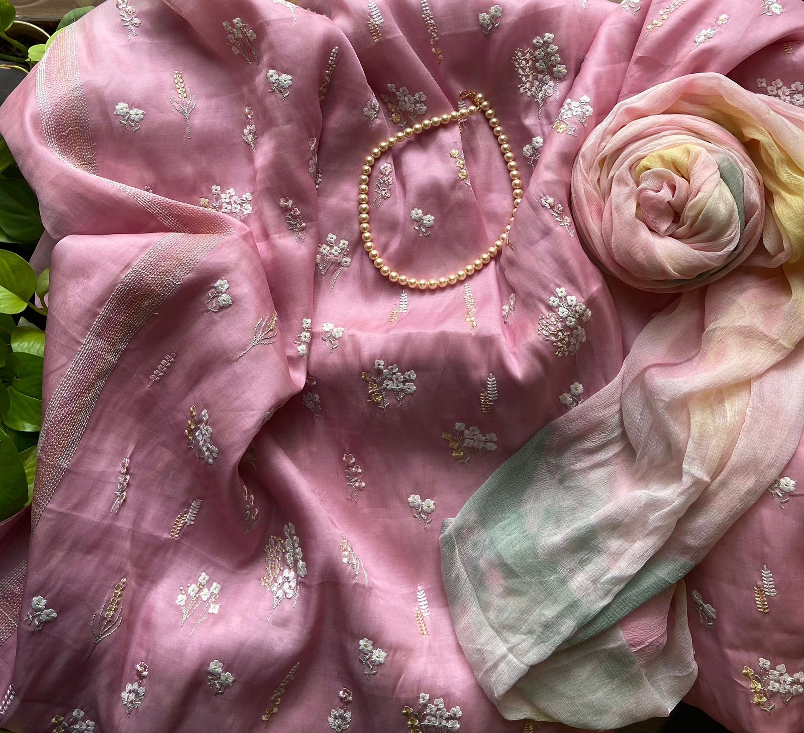 Are you looking out for Beautiful Silk Suits to add to your wardrobe ? These suits with floral & pearl embroidery are the perfect choice! Pure Chandheri silk top with floral & pearl embroidery, santoon bottom & chiffon duppatta with embroidery
