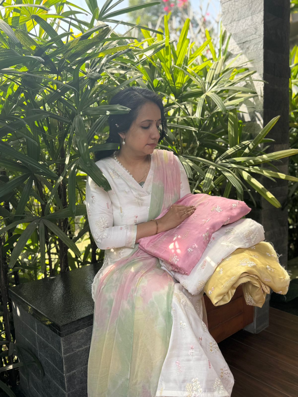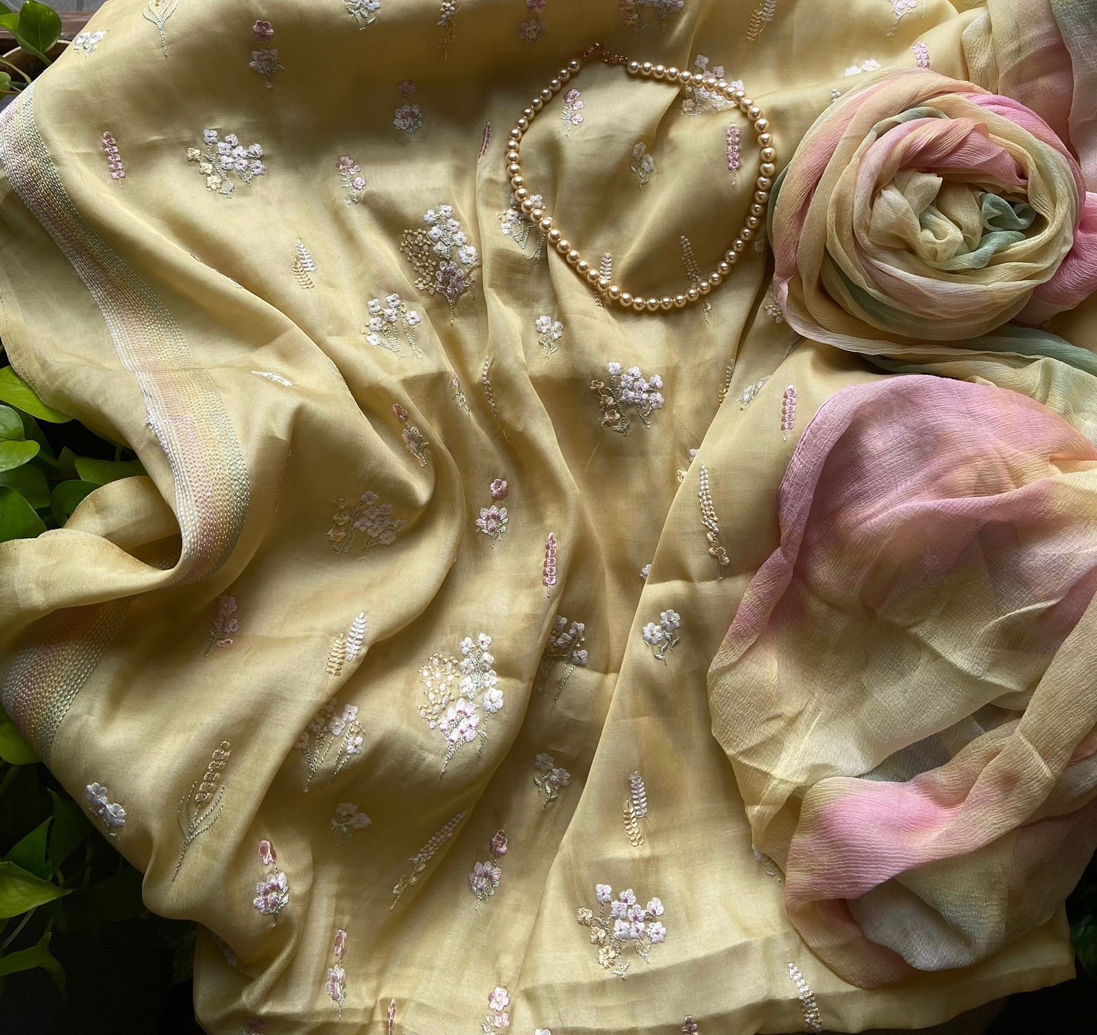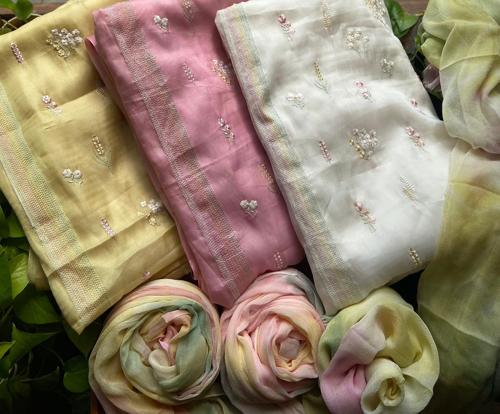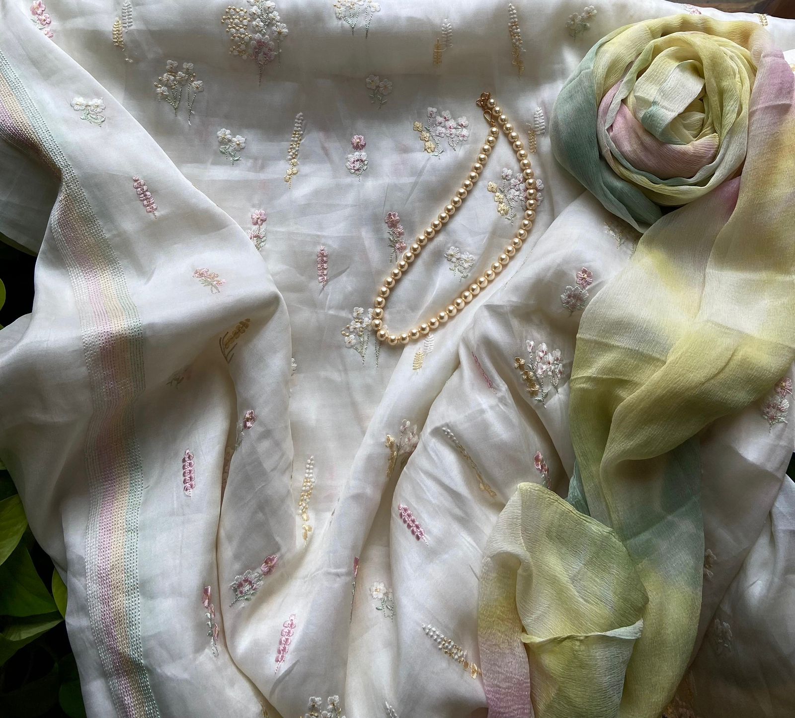 Presenting out Brand New Collection for Onam at a Special Price of ₹1499/- curated on Chiffon woth Cutwork and beautiful floral embroidery! Ethereal hues of Pink, Pearl Green, Ivory gold, Dusty pink & Jet black on Chiffon top and Duppatta with floral embroidery & Cutwork. The floral embroidery design is created to resemble pearl embroidery. Bottom is cotton silk