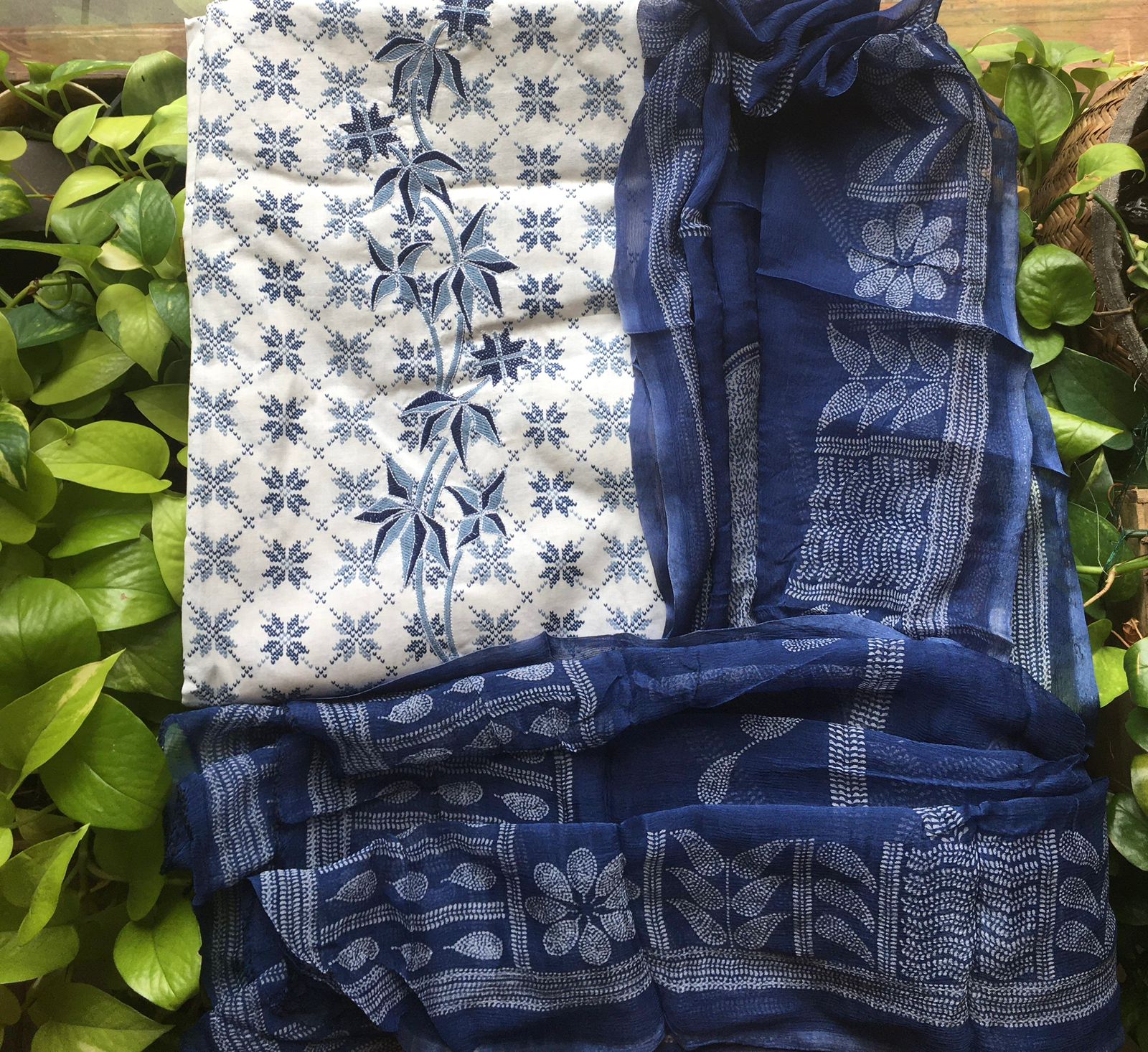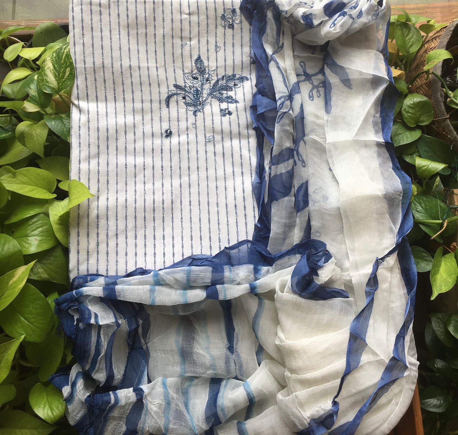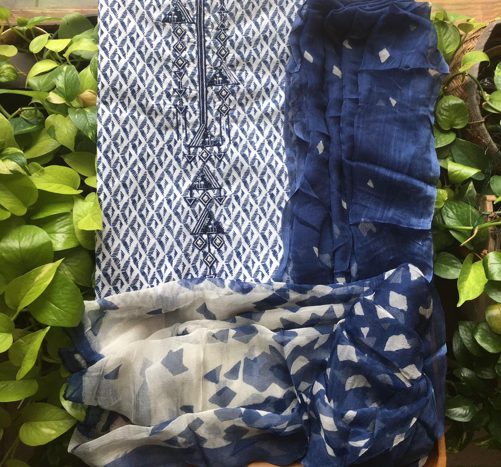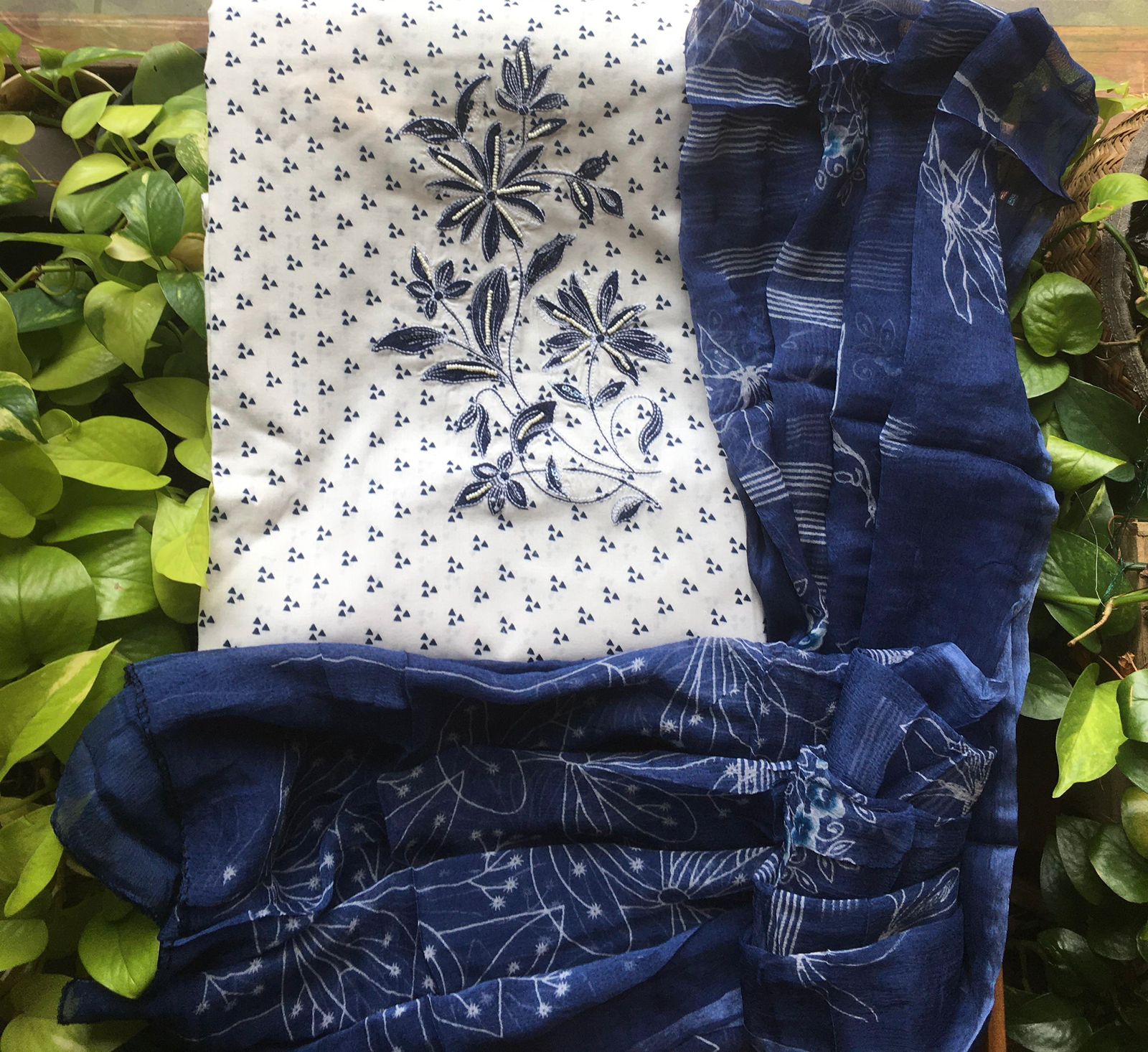 Presenting Beautiful Indigo Collection on pure muslin cotton top with pearl embroidery, cotton bottom & chiffon duppatta