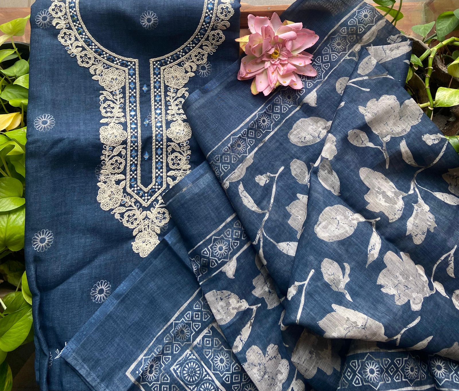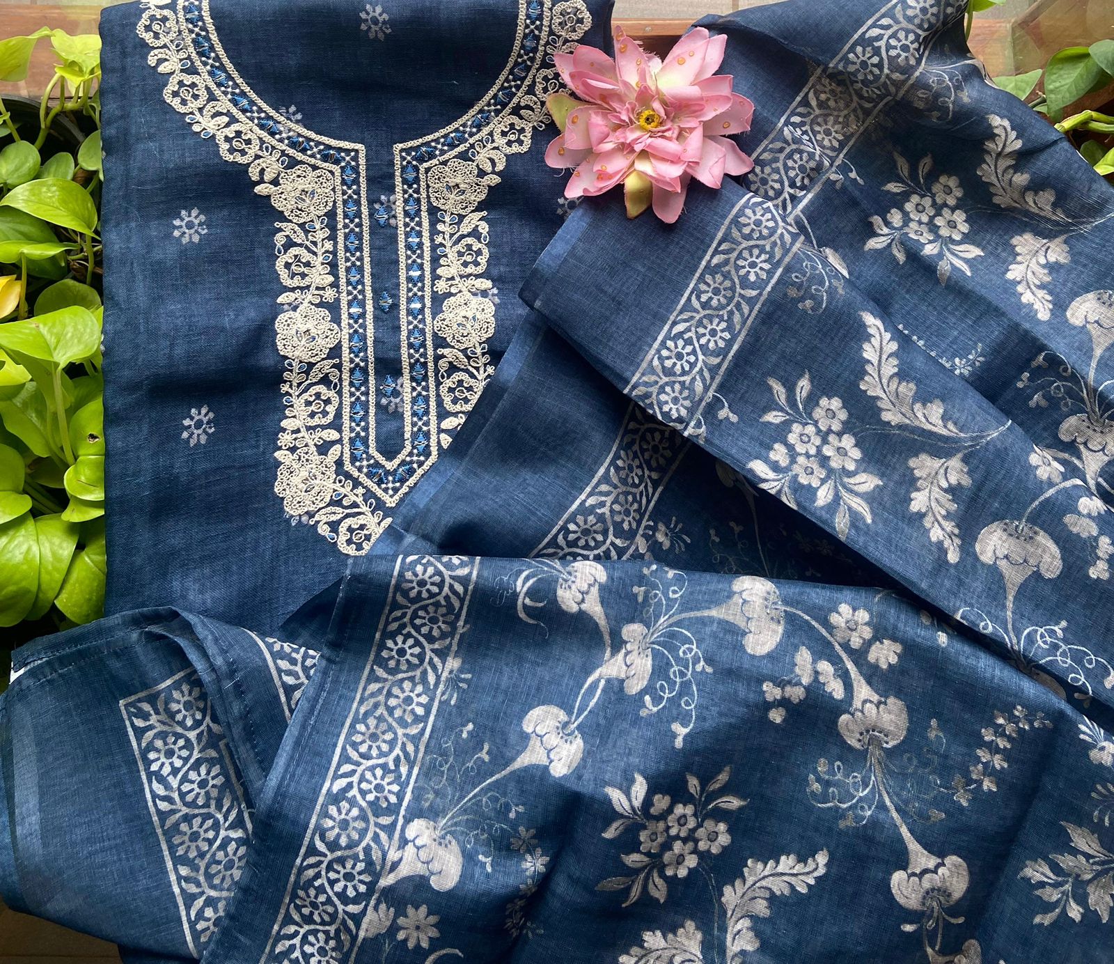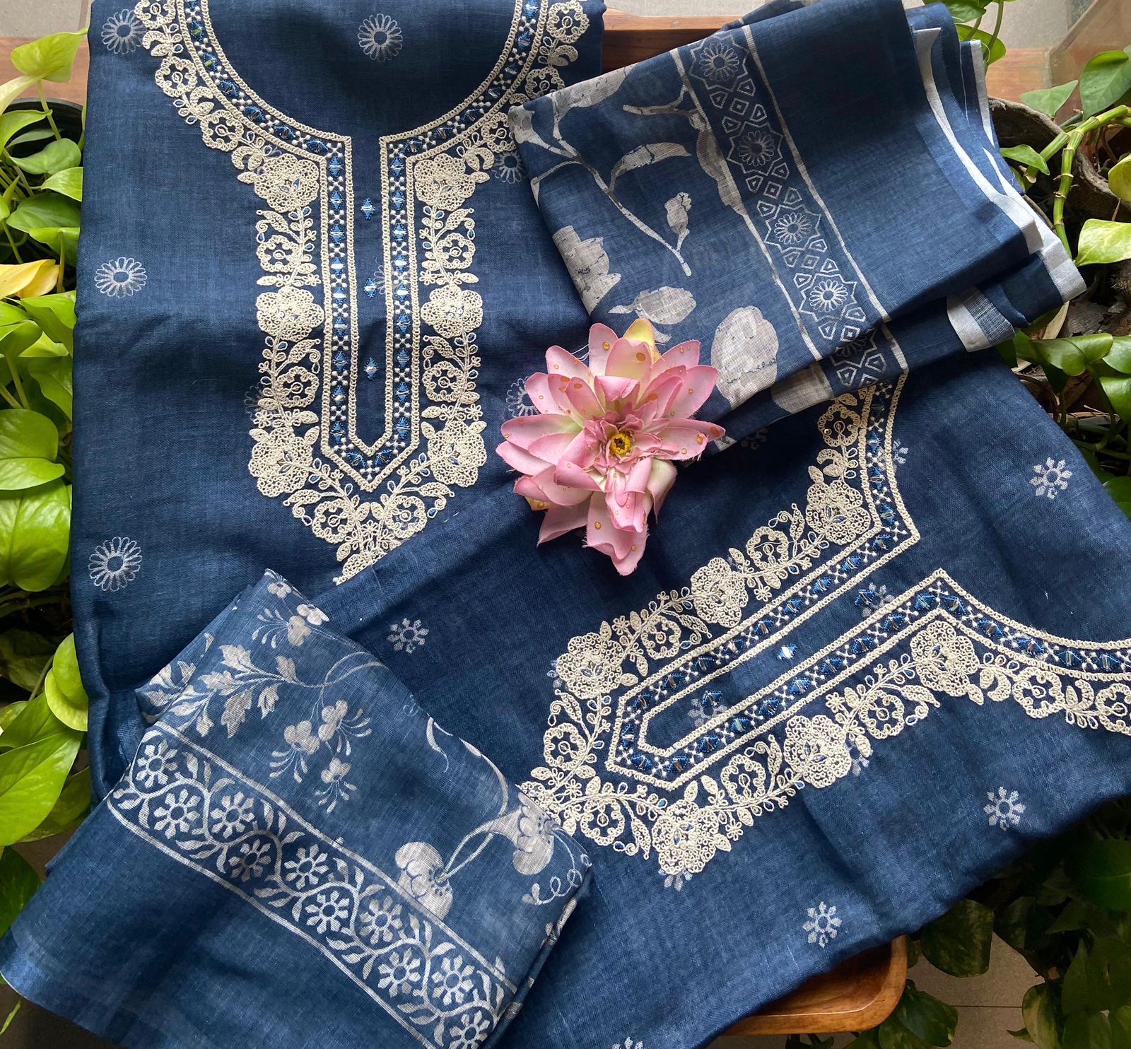 Are you looking out for Beautiful & Unique Designer Cottons to add to your wardrobe ? These Hand block printed Indigo Kutch worked cottons are the perfect choice! Pure cotton top with authentic Kutch work (does not need lining ) cotton printed bottom & hand block printed chiffon duppattas