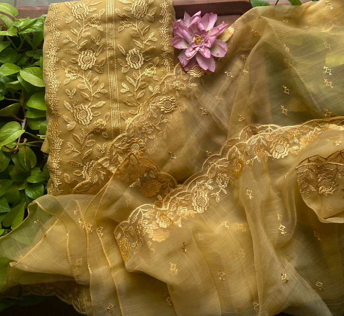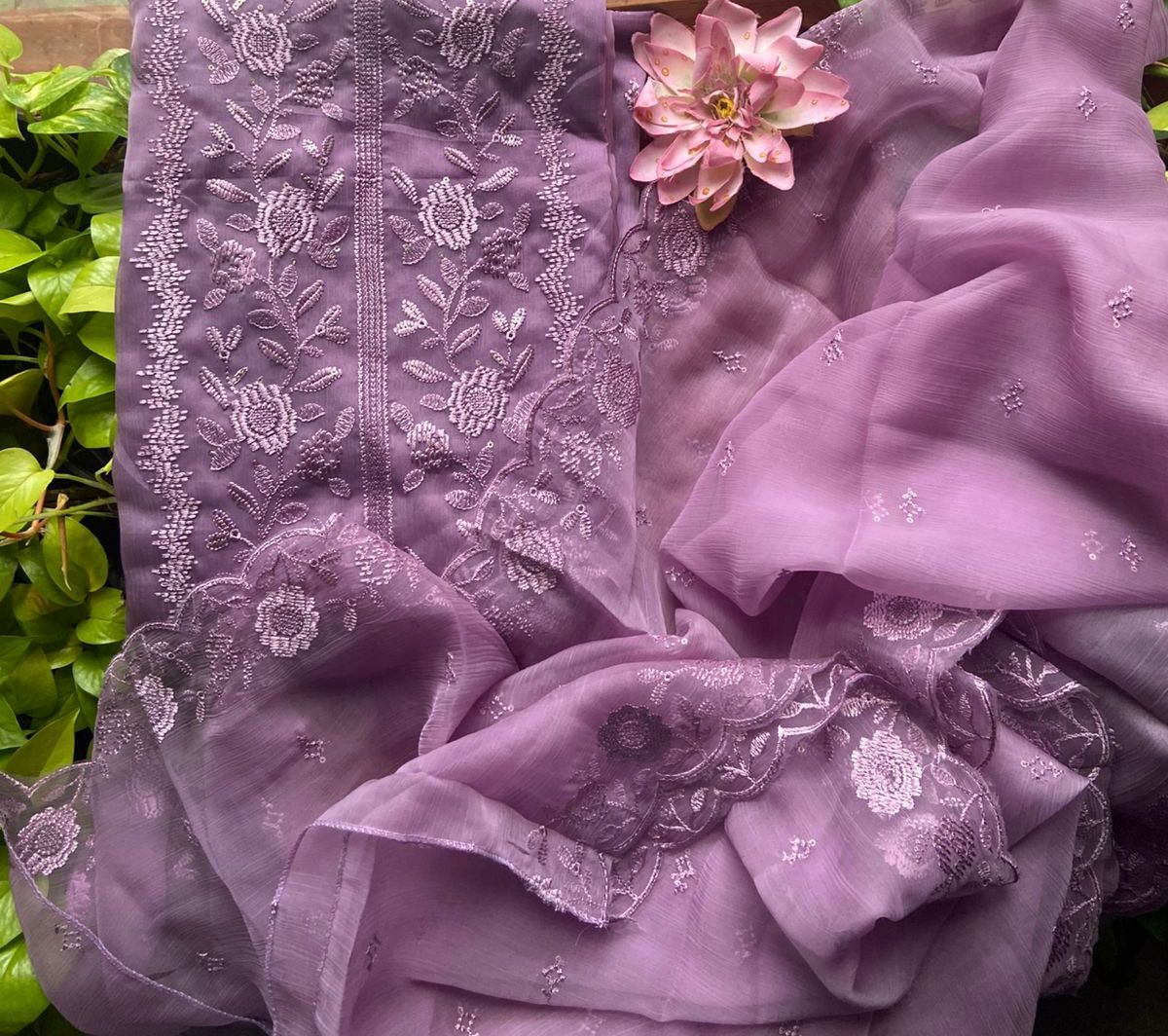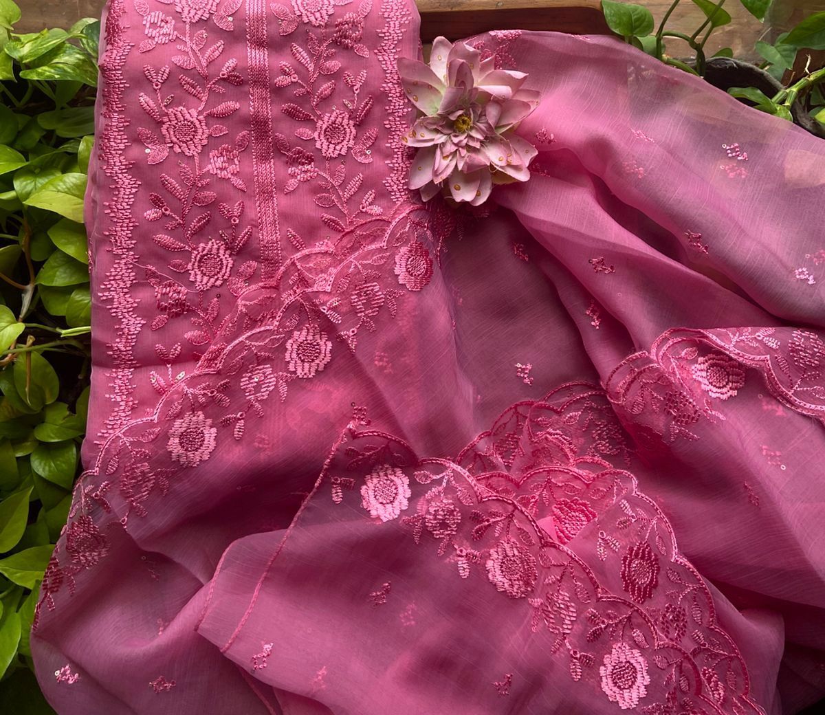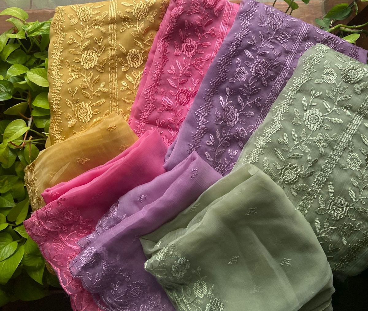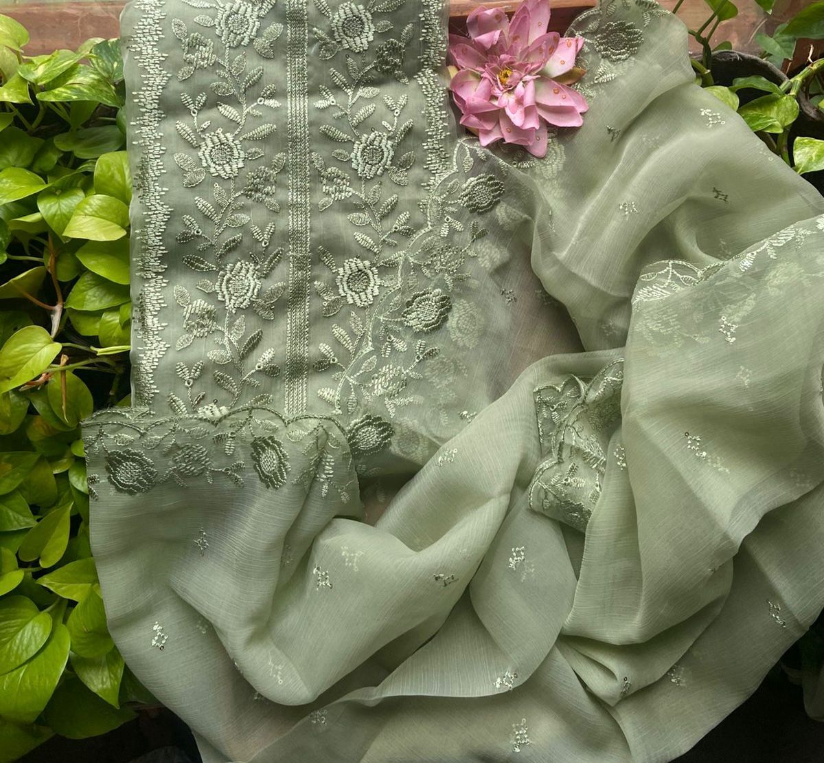 • Presenting out Brand New Collection for Onam at a Special Price of ₹1499/- curated on Chiffon woth Cutwork and beautiful floral embroidery! Ethereal hues of Pink, Pearl Green, Ivory gold, Dusty pink & Jet black on Chiffon top and Duppatta with floral embroidery & Cutwork. The floral embroidery design is created to resemble pearl embroidery. Bottom is cotton silk ₹1,499.00