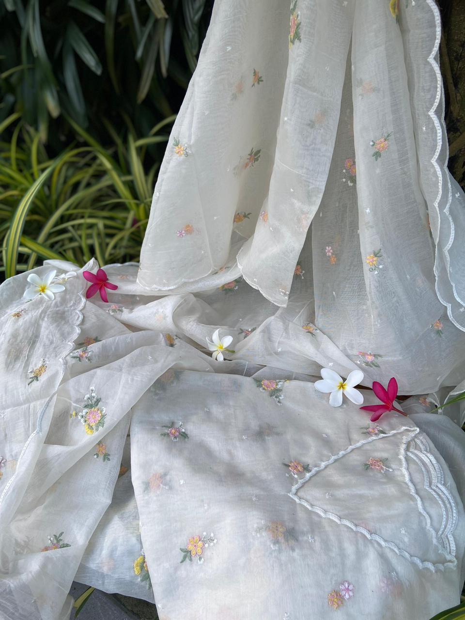 Presenting Our Beautiful New designer wear Pure Malai Chandheri Kurta material (2.7 metres) with beautiful floral embroidery & scalloping throughout. The fabric is very soft & the ethereal floral embroidery makes it so elegant. A perfect choice for Onam to be Styled as a kaftan, top or even frocks or as a set mundu too! A beautiful & classy attire for your entire family & friends this Onam! Book now
