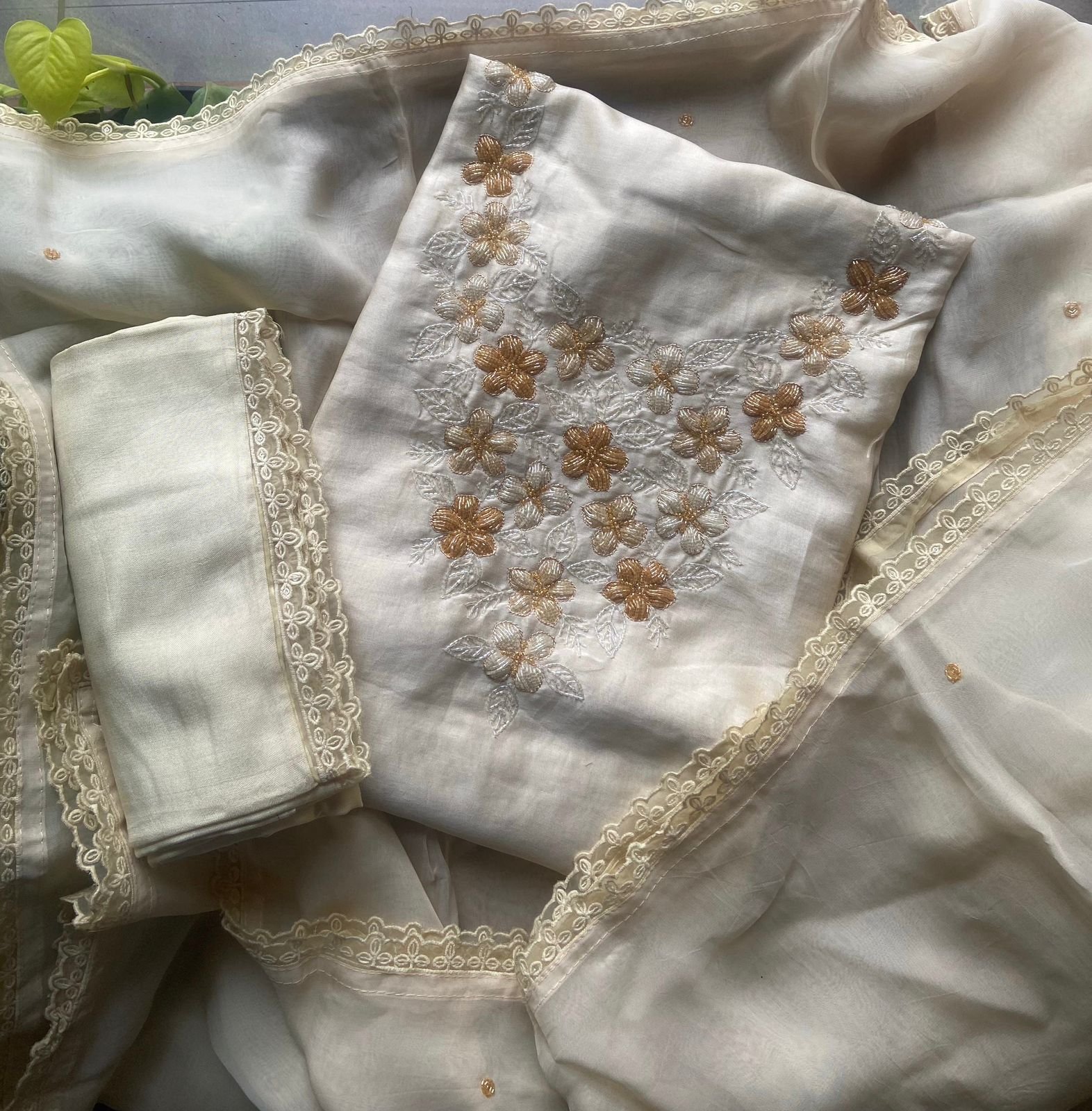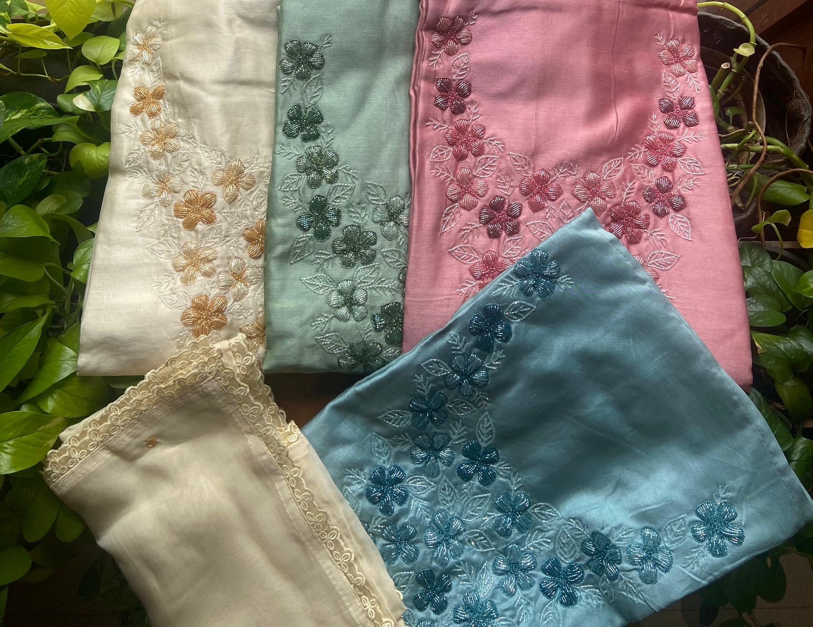 Styling tip : These suits are premium linens with exquisite hand embroidery and only simple Simple necklines with a piping for sleeves are required
