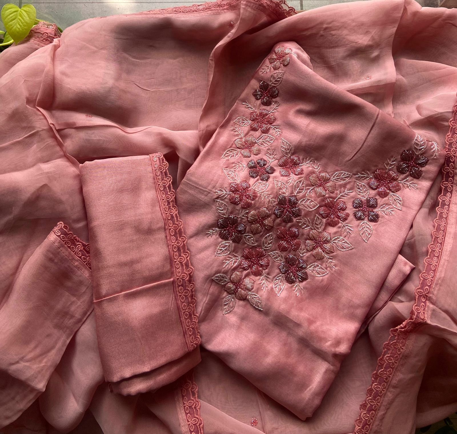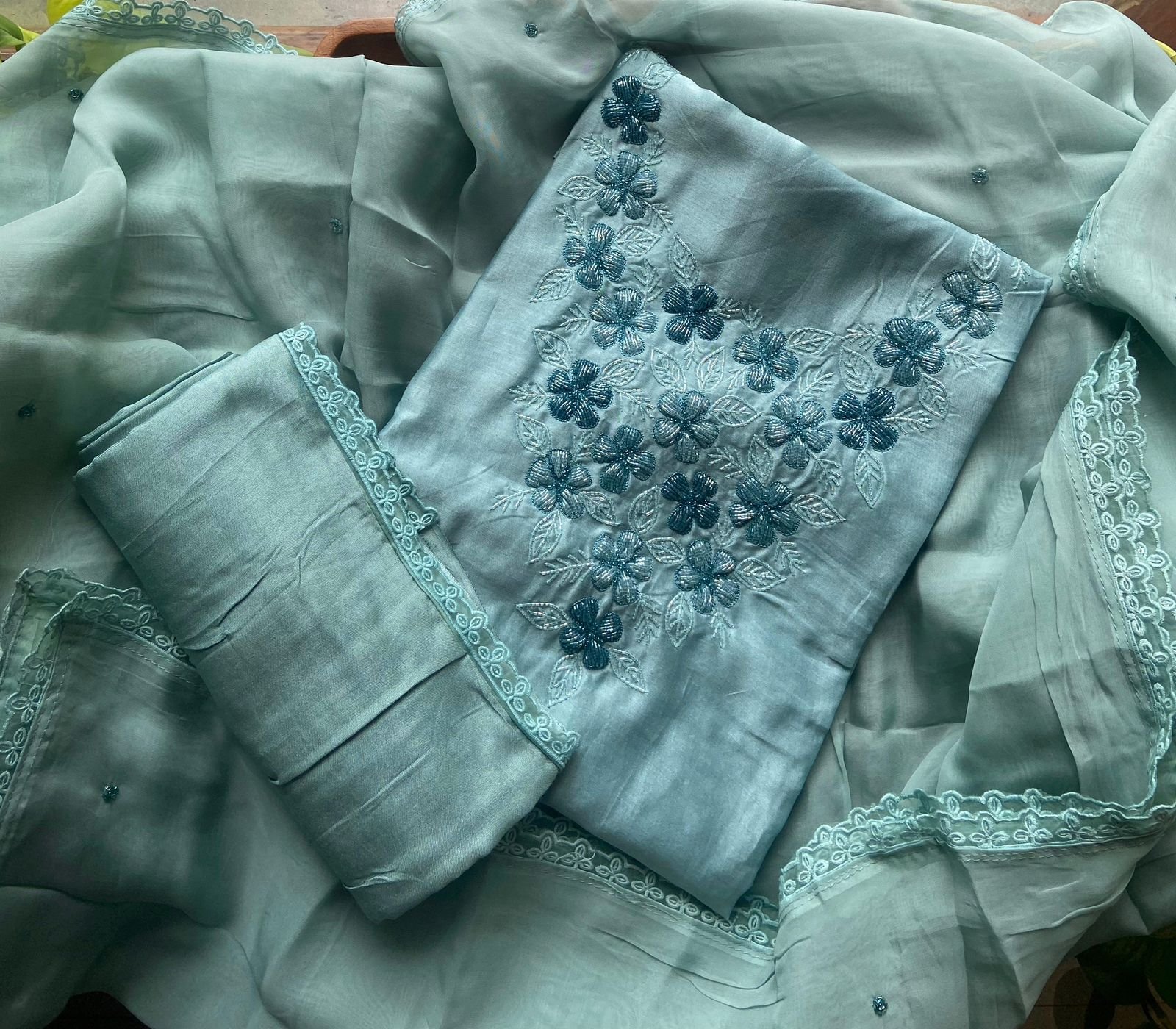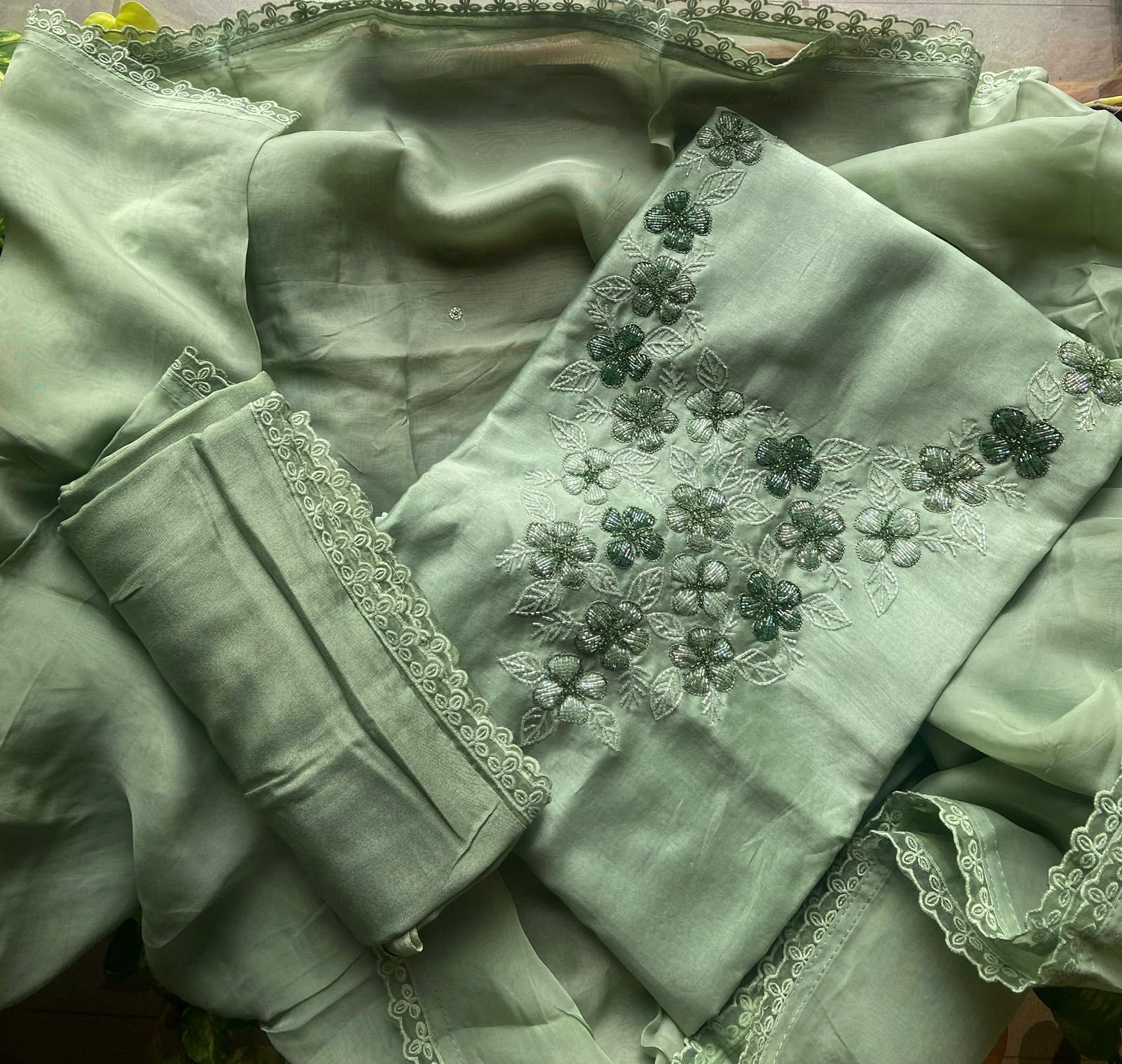 Are you looking out for Premium Silk Suits for the upcoming festive season ? These pastel hued silk suits with intricate hand work and detailing is the perfect choice! Pure Benarasi Chandheri silk top with exquisite hand work and detailing in sleeves and also on santoon bottom and pure organza soft Duppatta woth hand work detailing