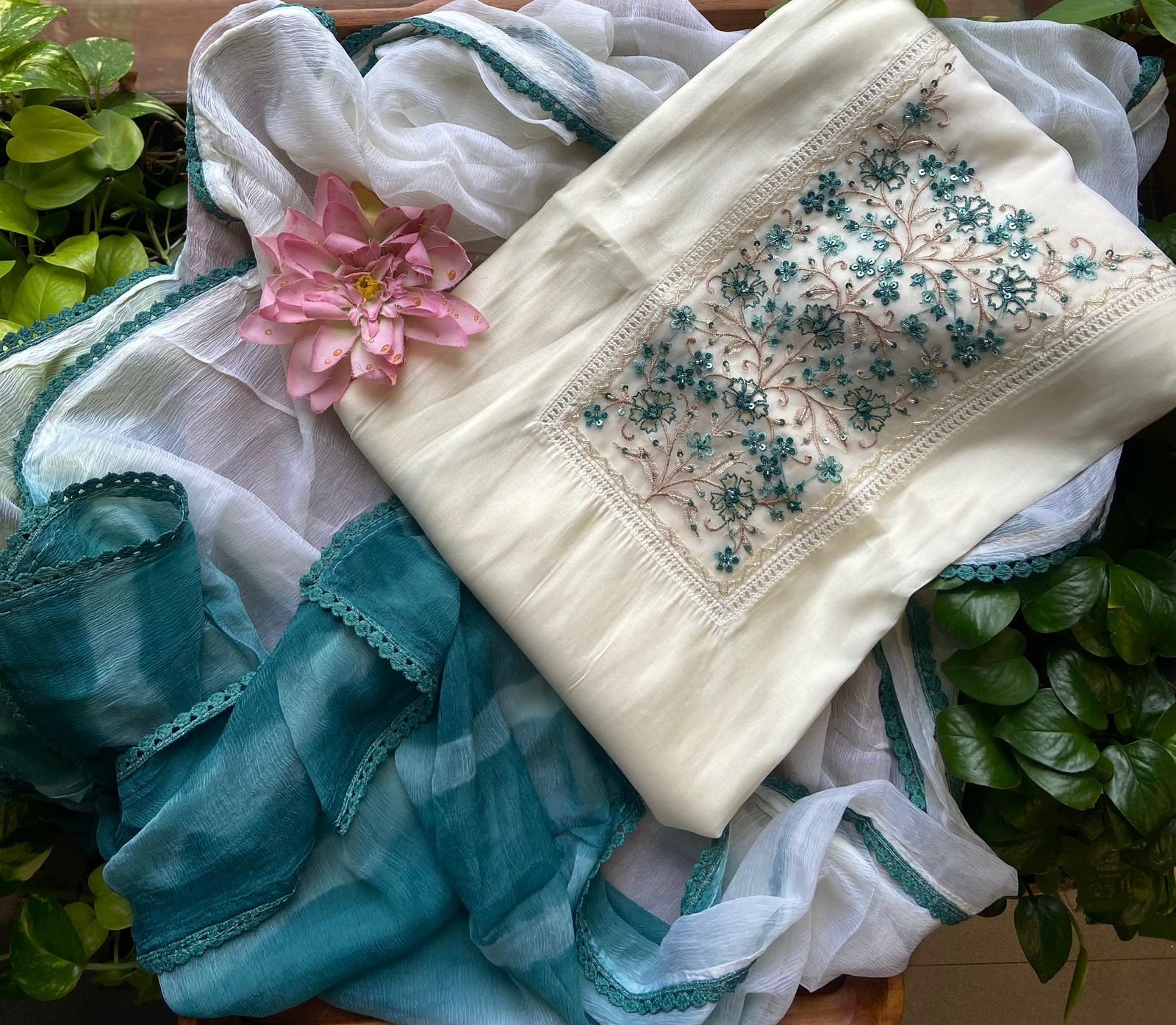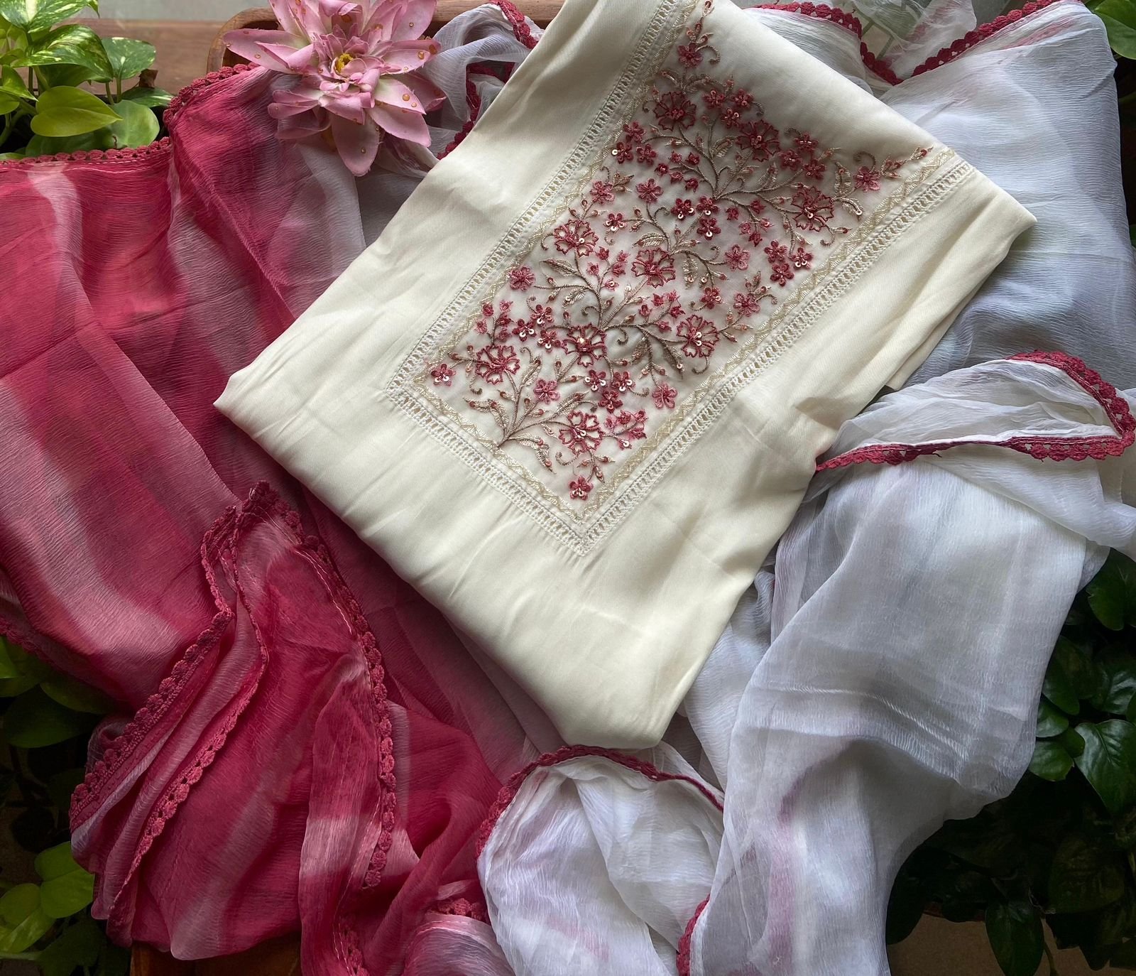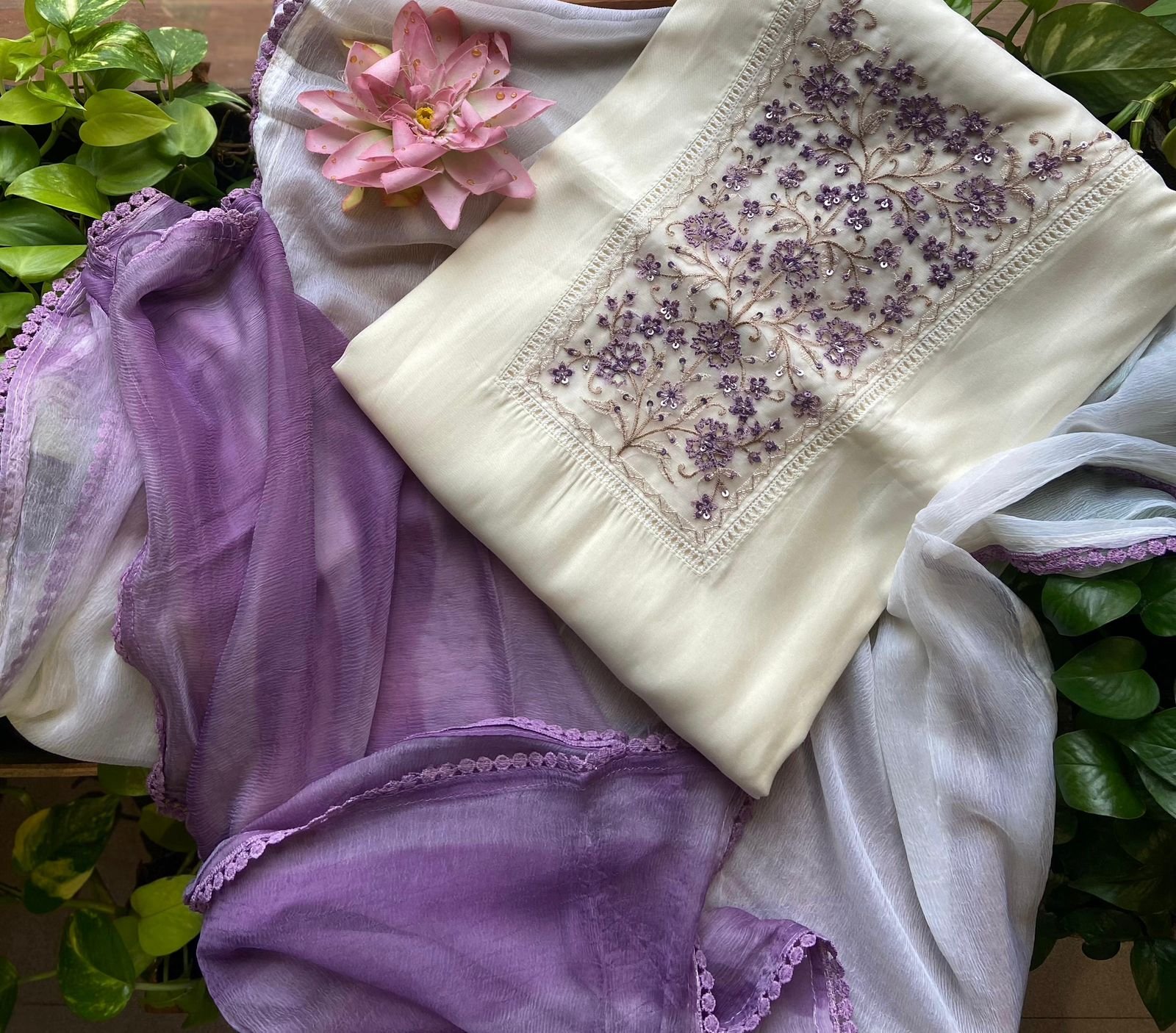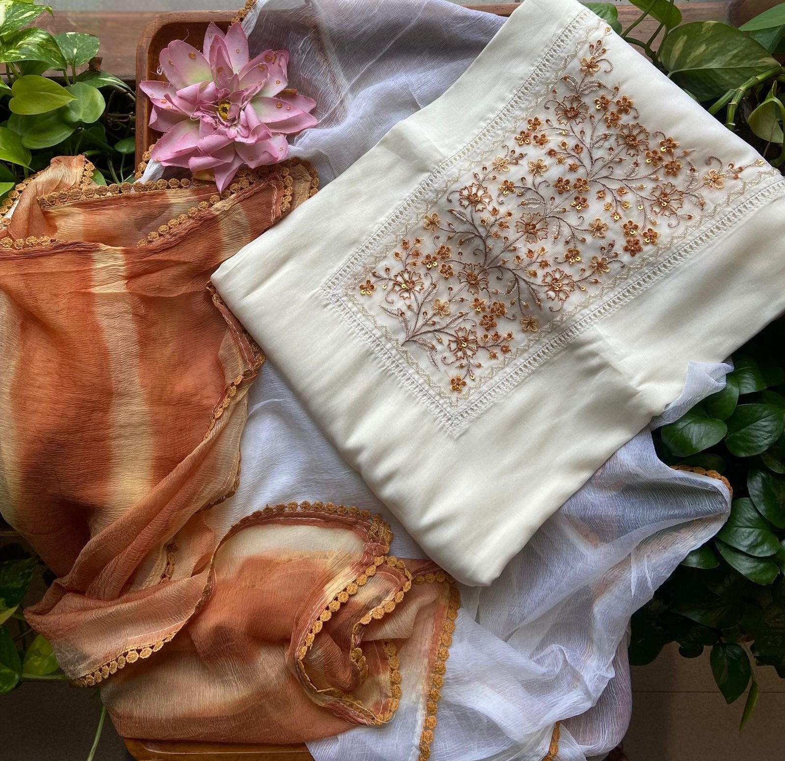 Are you looking out for Beautiful Offwhite Suits for the upcoming Easter Season? These Offwhite suits with beautiful embroidery and ombré dyed Duppatta is the perfect choice! Pure Chandheri silk top with hand embroidery, santoon bottom and ombré Shibori dyed chiffon Duppatta
