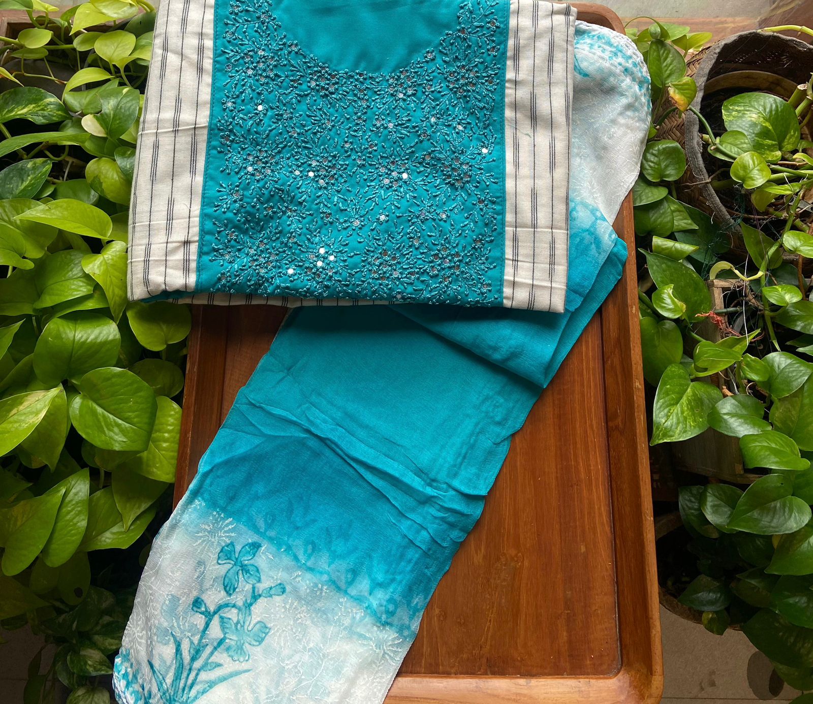 Pure Ikkat top with exquisite hand work , cotton bottom and pure chiffon Duppatta