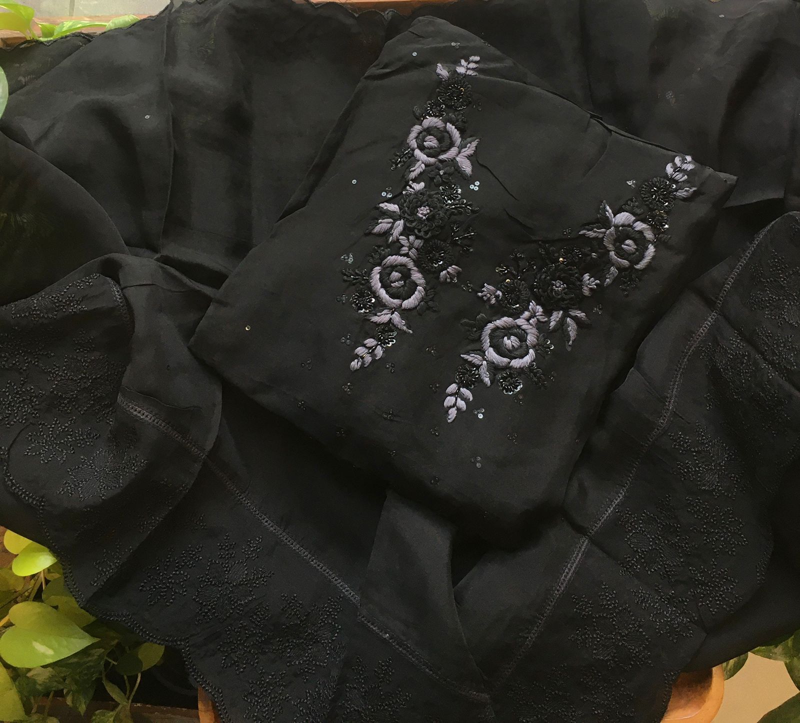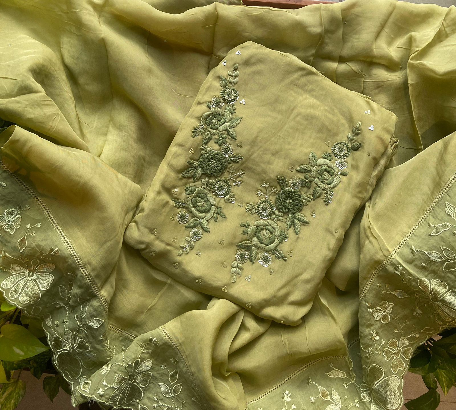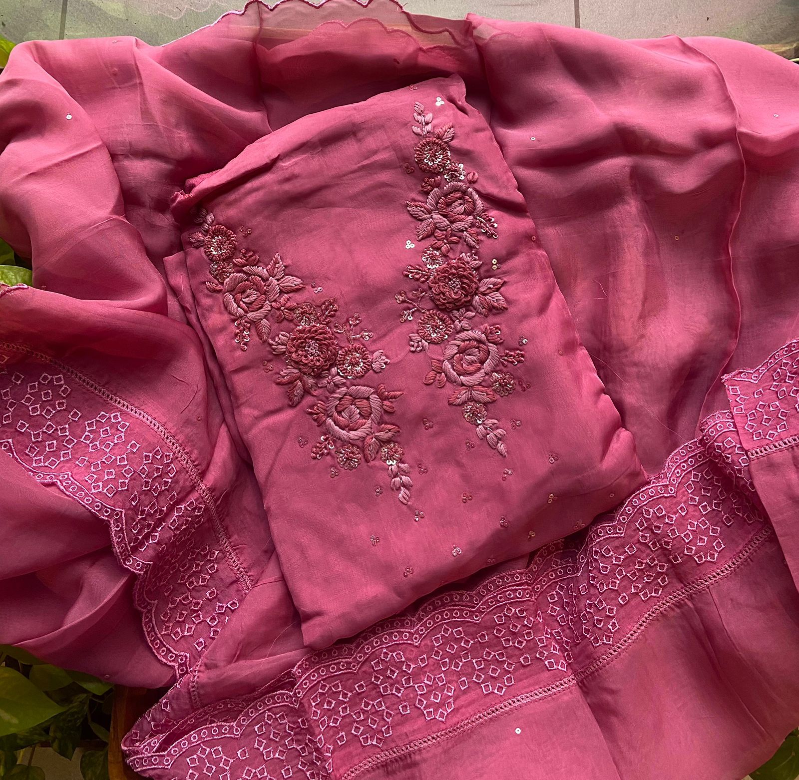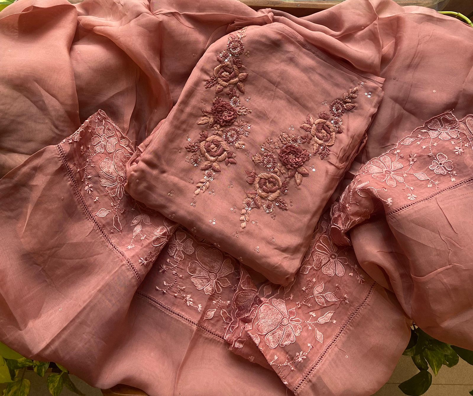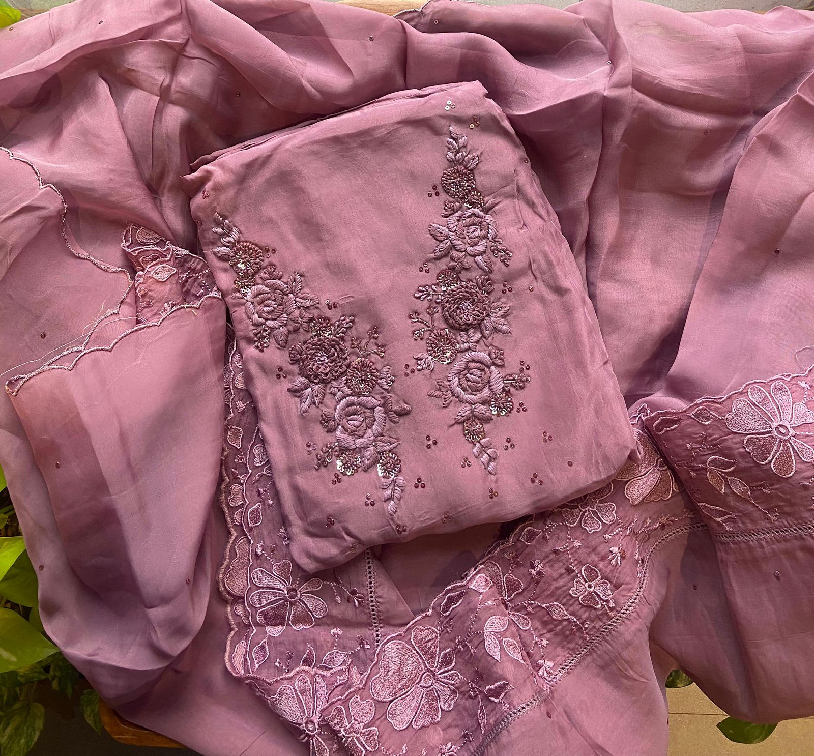 Presenting out Brand New Collection for Onam at a Special Price of ₹1499/- curated on Chiffon woth Cutwork and beautiful floral embroidery! Ethereal hues of Pink, Pearl Green, Ivory gold, Dusty pink & Jet black on Chiffon top and Duppatta with floral embroidery & Cutwork. The floral embroidery design is created to resemble pearl embroidery. Bottom is cotton silk