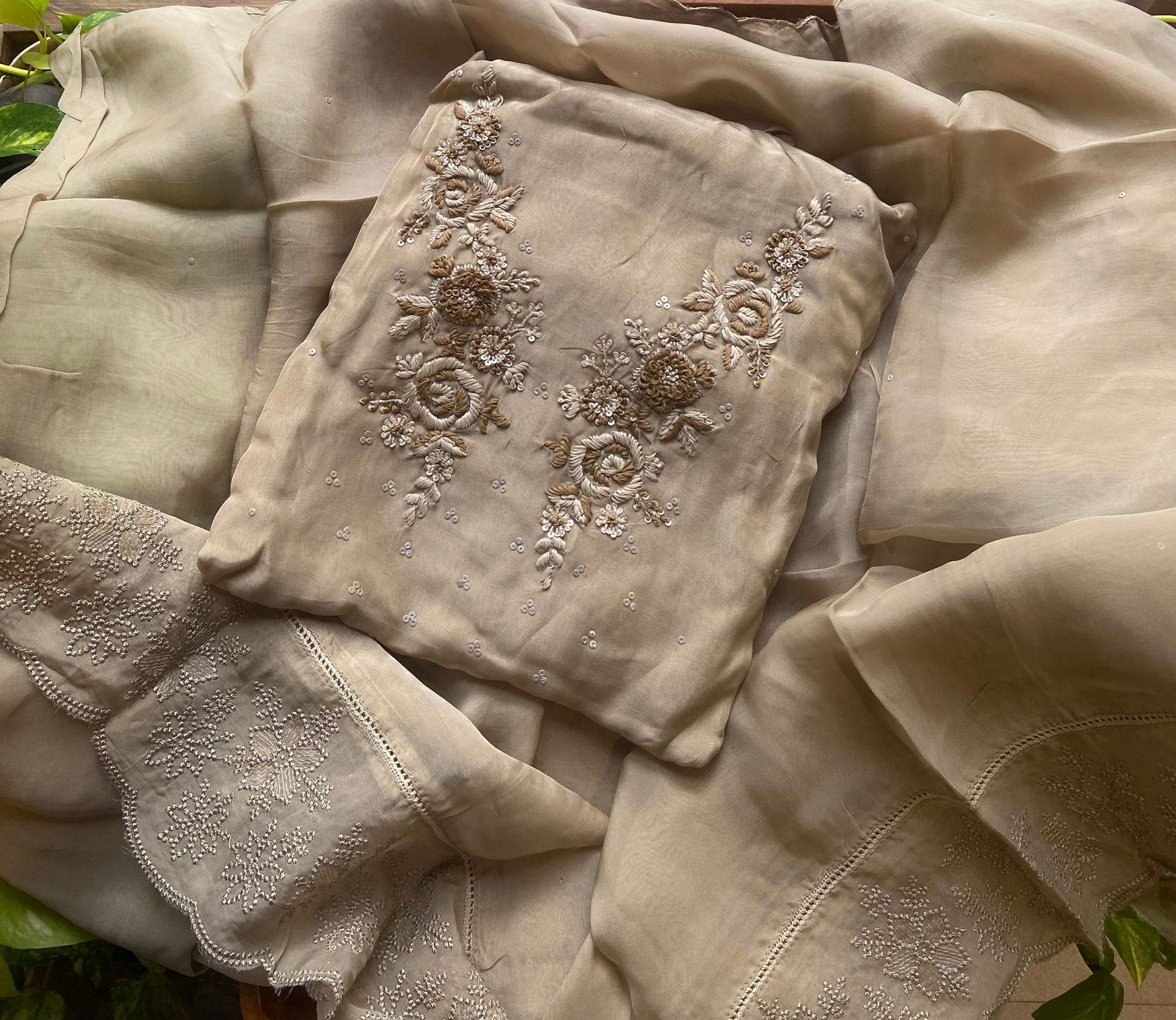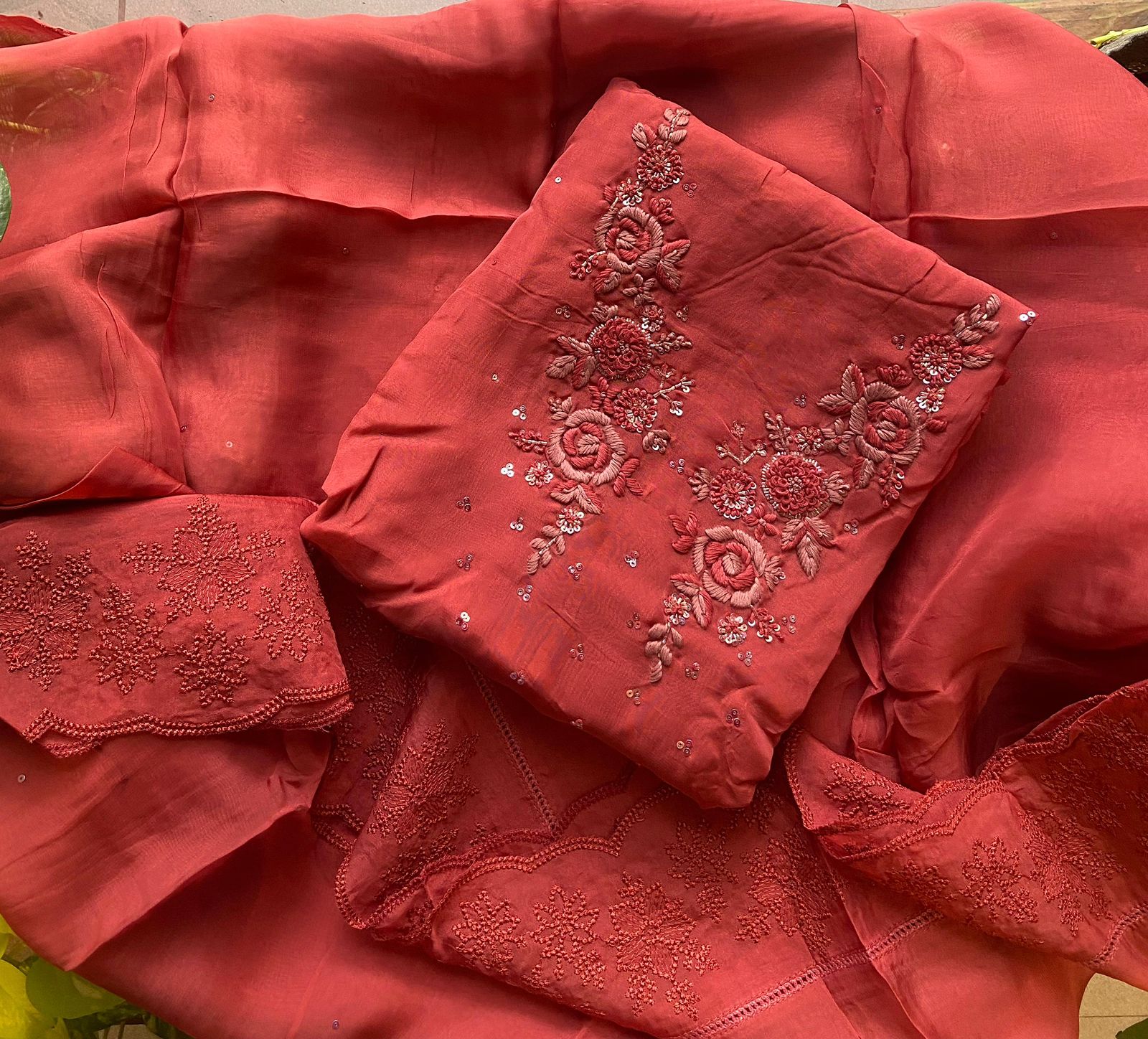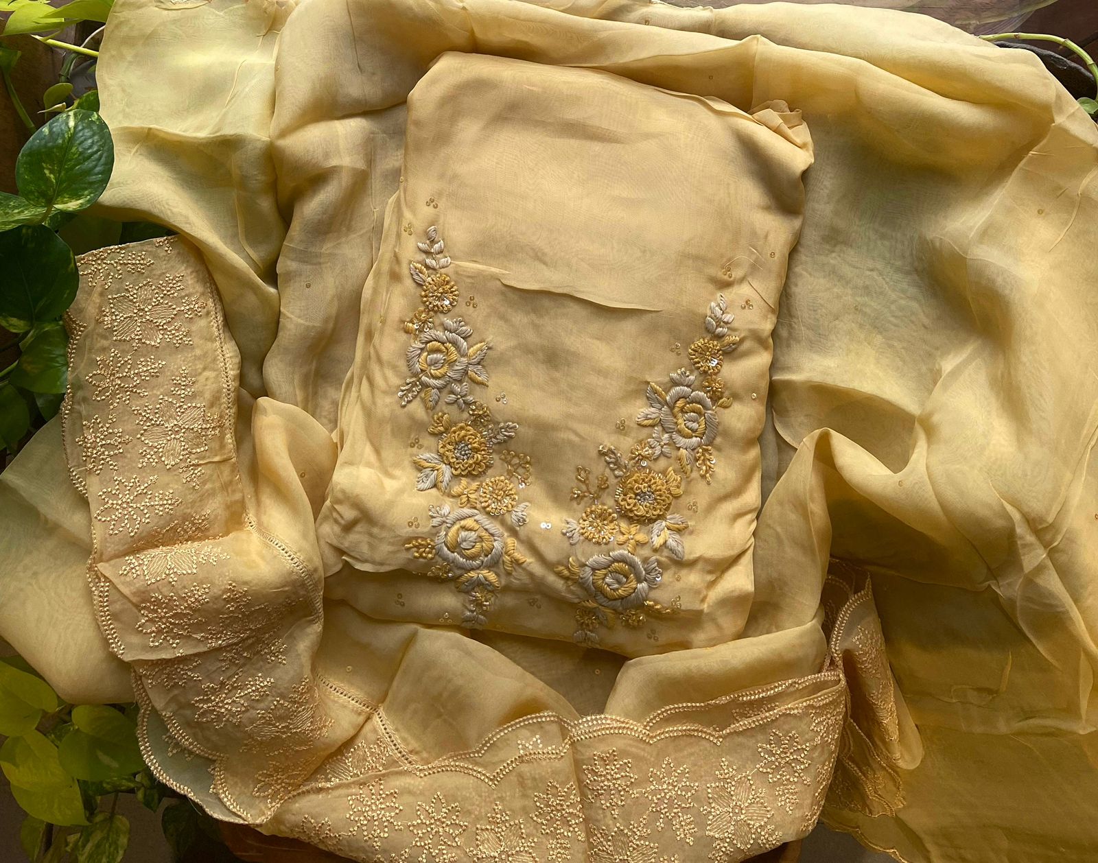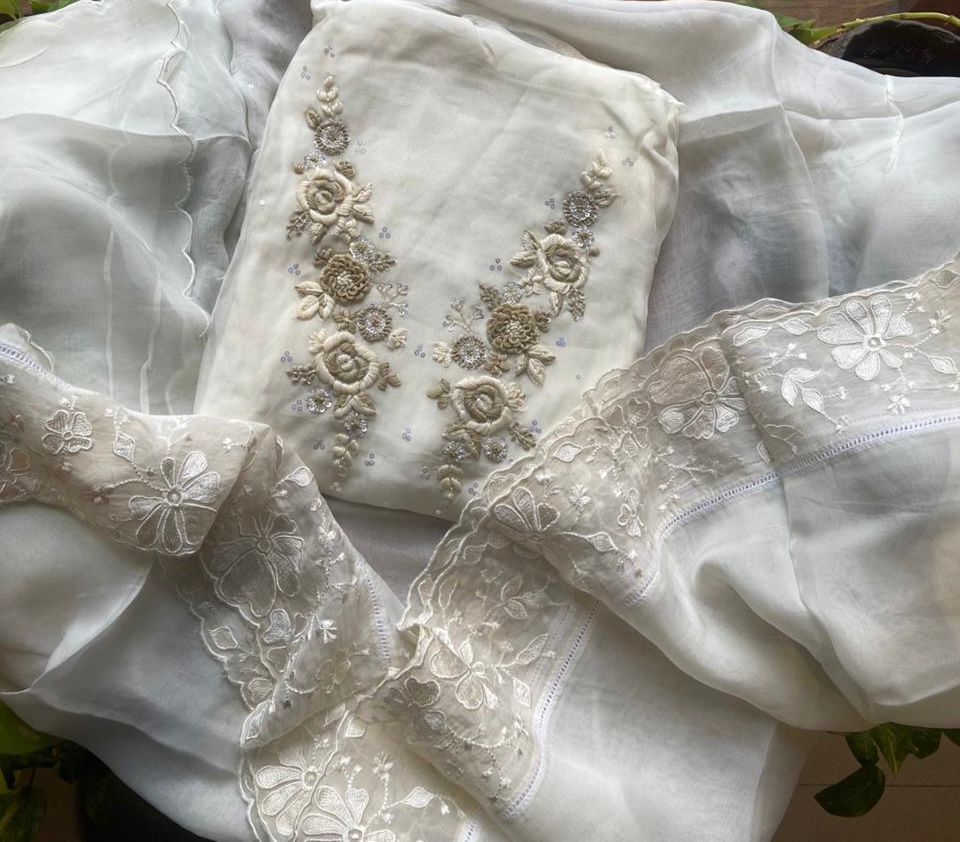 Gorgeous Kurta Materials on Chandheri silk with intricate embroidery detailing.