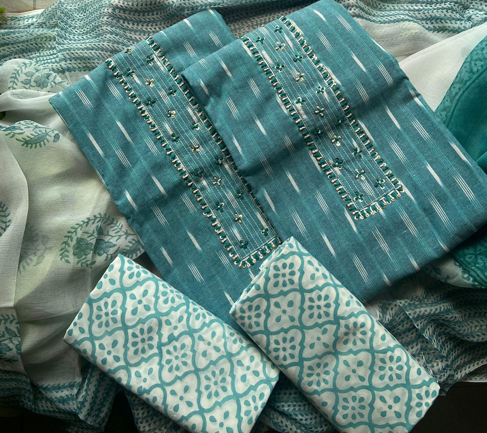 HomeSalwar Set Stunning Ikkat cotton top with Kutch hand embroidery , cotton printed bottom & chiffon Duppatta !Limited pieces available!!!Hurry & order these before we run out of them! Perfect choice for gifting your dear ones this festive season